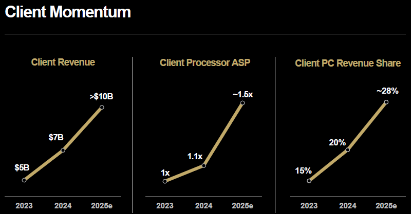 Непосредственно в клиентском сегменте выручка AMD по итогам текущего года должна превысить $10 млрд, удвоившись по сравнению с 2023 годом. Средняя цена реализации процессоров в клиентском сегменте за это время выросла в полтора раза. Доля AMD на рынке клиентских ПК выросла с 15 до 20 % по итогам прошлого года, а в этом году она должна увеличиться до 28 %, но именно в показателях выручки.