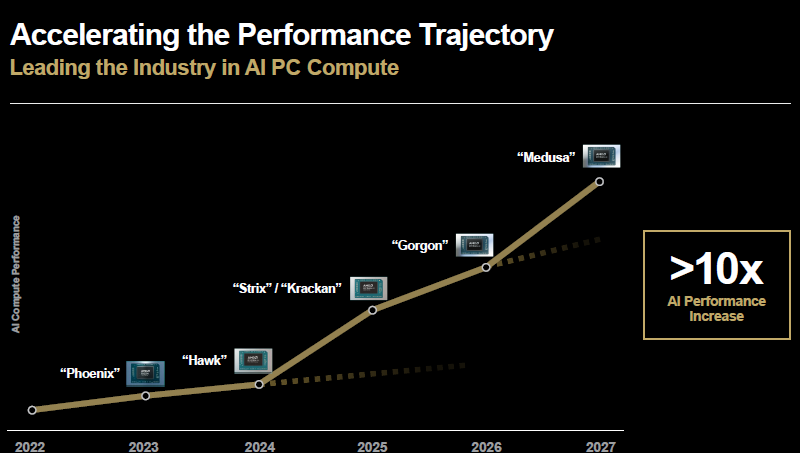 В мобильном сегменте прогресс тоже не будет стоять на месте, как дал понять Джек Гуинь. На смену процессорам семейств Strix и Krackan в следующем году придут мобильные чипы Gorgon, а в 2027 году появятся мобильные процессоры Medusa. Их производительность в операциях с искусственным интеллектом буквально увеличится в 10 с лишним раз по сравнению с уровнем 2022 года.