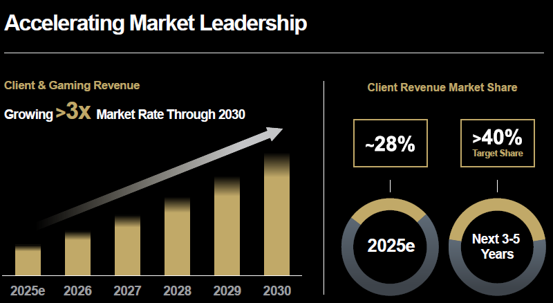 В целом, AMD ожидает, что до конца десятилетия сможет наращивать выручку в клиентском и игровом сегментах в три раза быстрее остальных участников рынка. В перспективе трёх или пяти лет она рассчитывает увеличить свою долю клиентского рынка с 28 до 40 %. В настольном сегменте, как отмечается в презентации AMD, компания уже сейчас занимает более 50 % рынка центральных процессоров. На основе её чипов уже выпущено более 1 млрд игровых устройств.