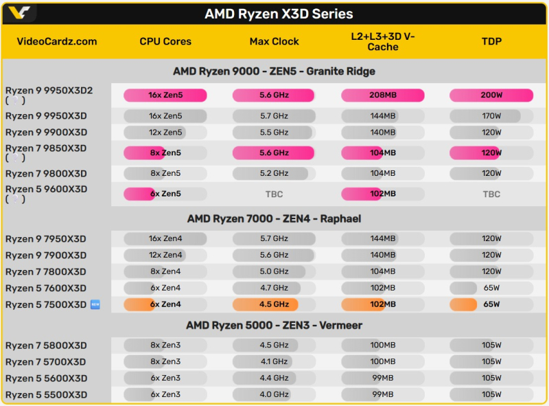 Ryzen 5 7500X3D представляет собой шестиядерный процессор с двенадцатью потоками, построенный на архитектуре Zen 4. Базовая тактовая частота составляет 4,0 ГГц, а максимальная Boost-частота — 4,5 ГГц. Уровень TDP составляет всего 65 Вт, так что новинка подойдёт и для довольно компактных игровых сборок — проблем с охлаждением возникнуть не должно. Новинка располагает 6 Мбайт кеша второго уровня и 96 Мбайт кеша третьего уровня, который складывается из 32 Мбайт базового кеша на процессорном кристалле и 64 Мбайт на дополнительном кристалле 3D V-Cache.