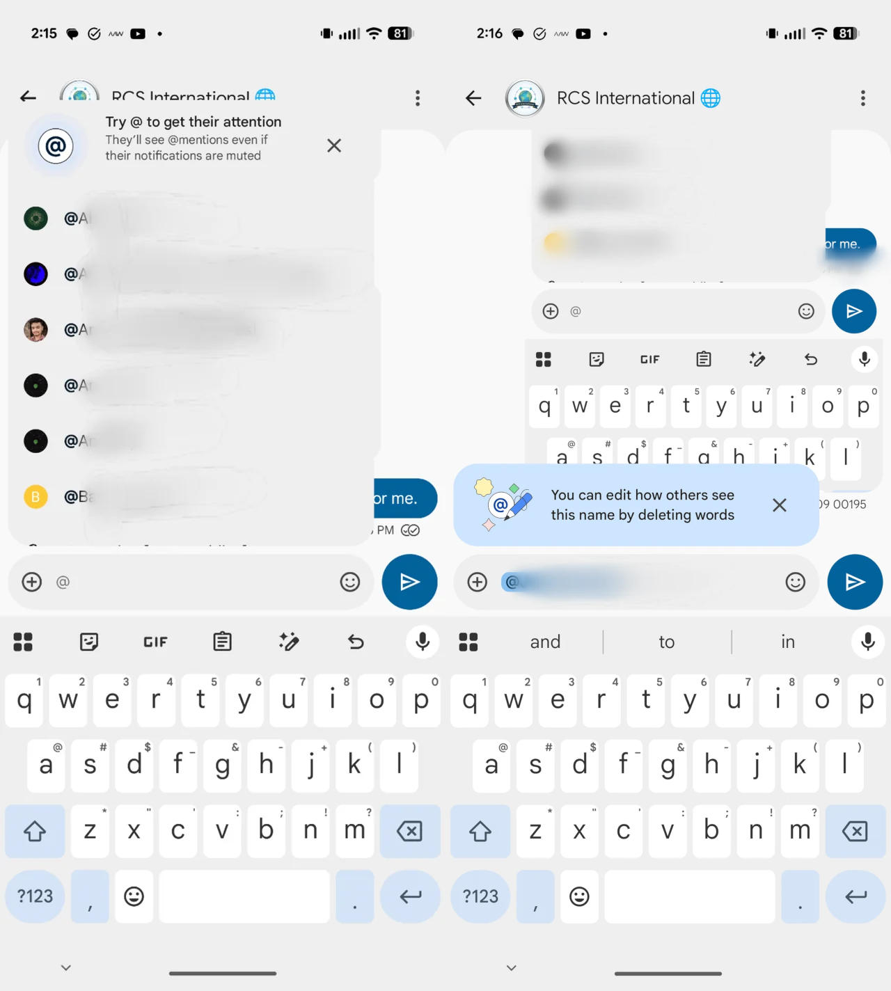 Приложение «Google Сообщения» получило поддержку упоминаний пользователями друг друга при помощи символа «@», чтобы привлечь внимание — адресат получит оповещение об этом даже при отключённых уведомлениях.