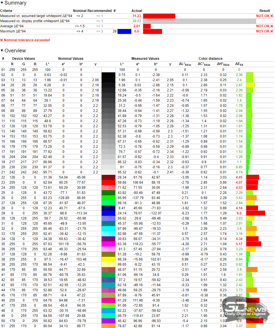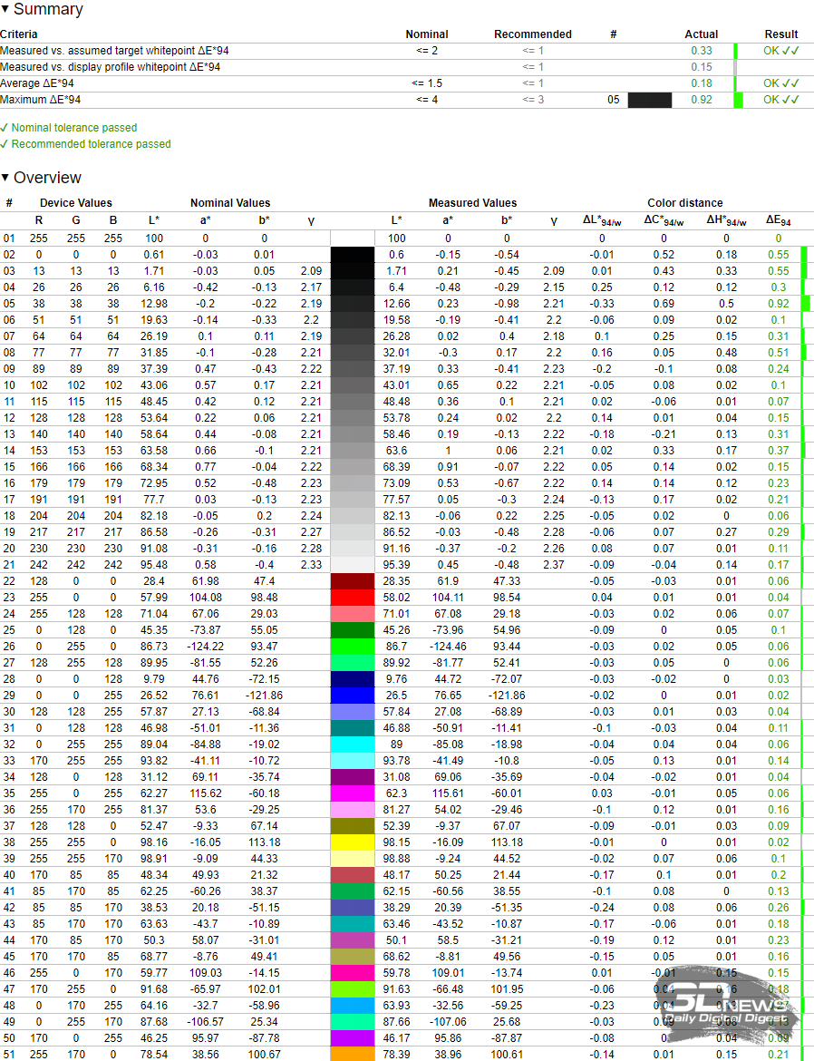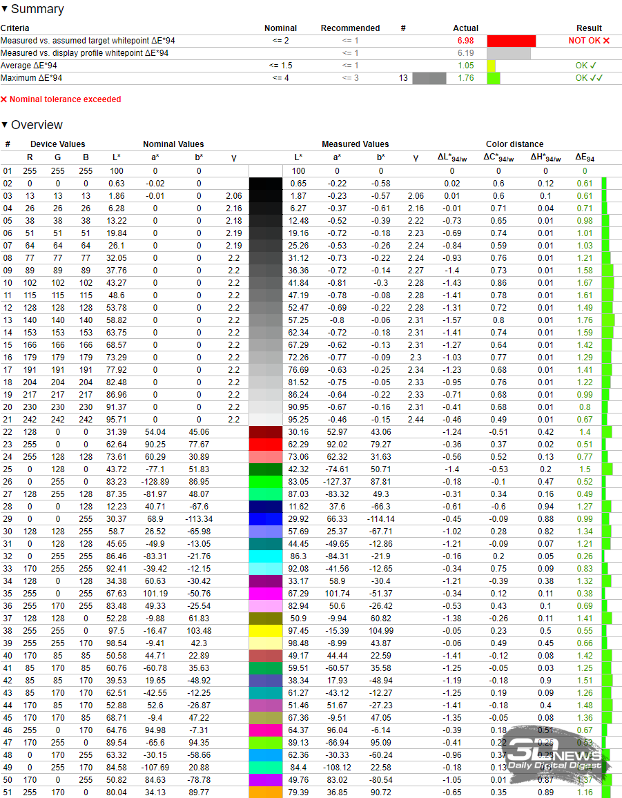 • высокая стабильность цветовой температуры оттенков серого в проверенных режимах и её высокая стабильность в ходе регулировки яркости;