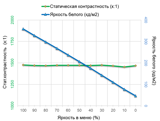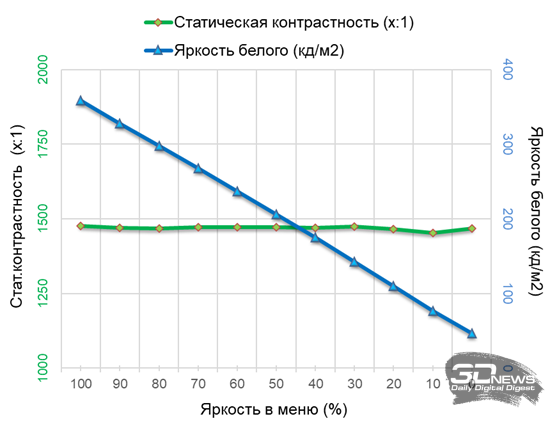 • высокие показатели статичной контрастности в большинстве режимов – в зависимости от настроек можно подобраться к 1500:1 и яркости 360 нит в максимуме для SDR;