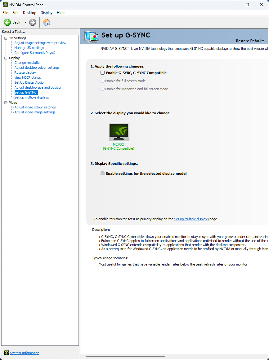Монитор является редким представителем класса доступных игровых моделей с официальной сертификацией NVIDIA по поддержке G-Sync Compatible. В основном производители обходятся формальной поддержкой бесплатного Adaptive-Sync и AMD FreeSync. В случае же с M27Q2 QD производитель постарался, потратил деньги и доказал, что проблем с работой адаптивной синхронизации у новинки быть не может.