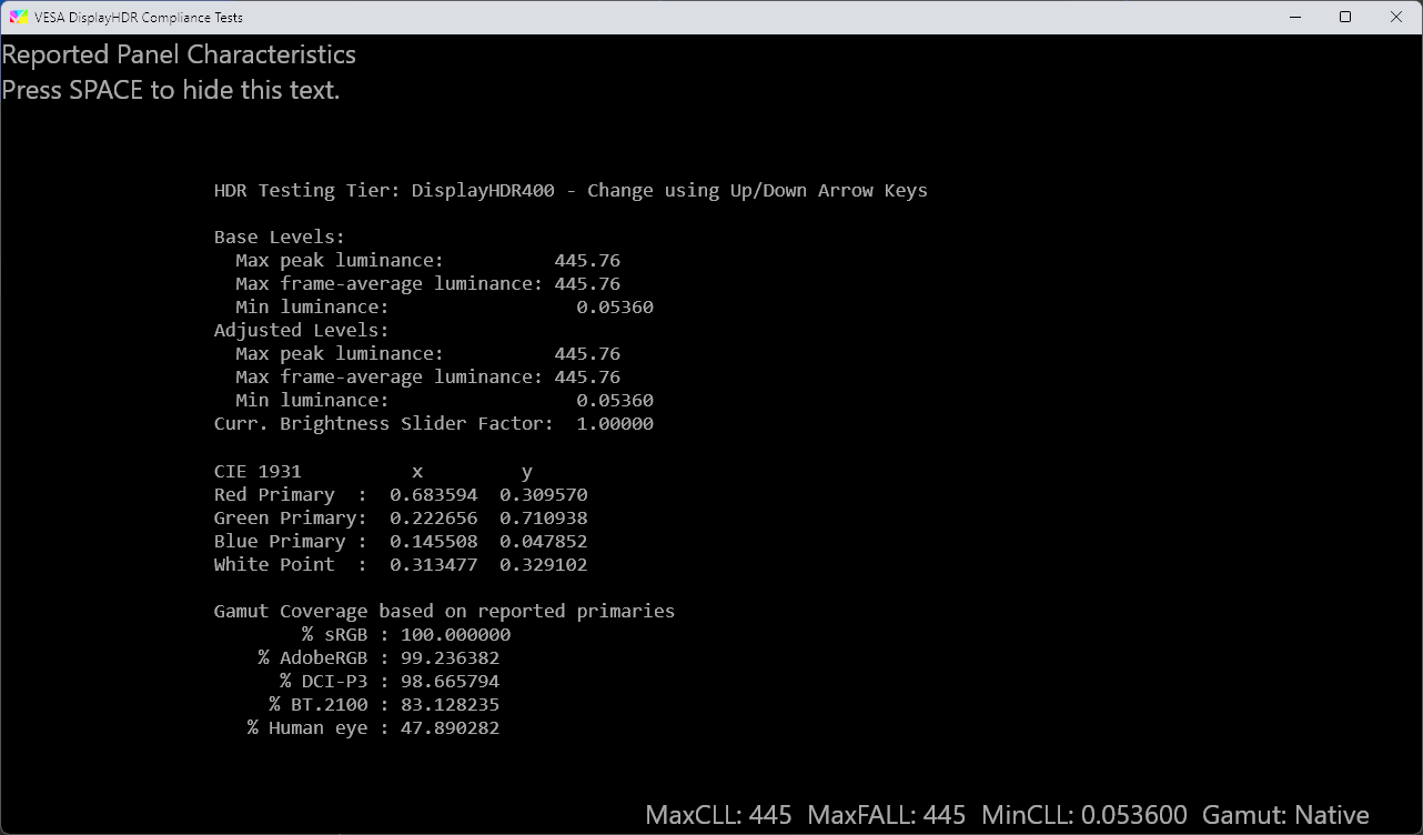 Монитор позволяет воспроизводить HDR10 контент, имеет сертификат соответствия VESA DisplayHDR 400, а яркость в HDR, следовательно должна достигать значения в 400 нит и выше при полном заполнении экрана (APL 100 %). При необходимости через настройки устройства может быть выставлен один из предустановленных режимов HDR c несколько отличающимися настройками цветопередачи.