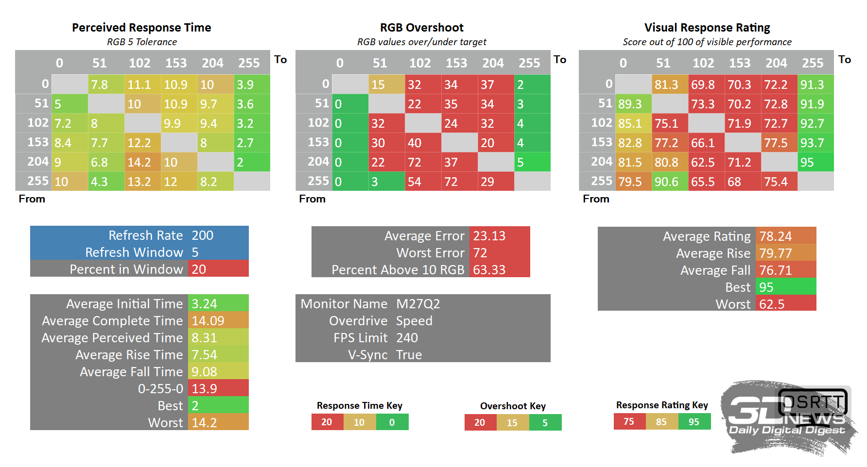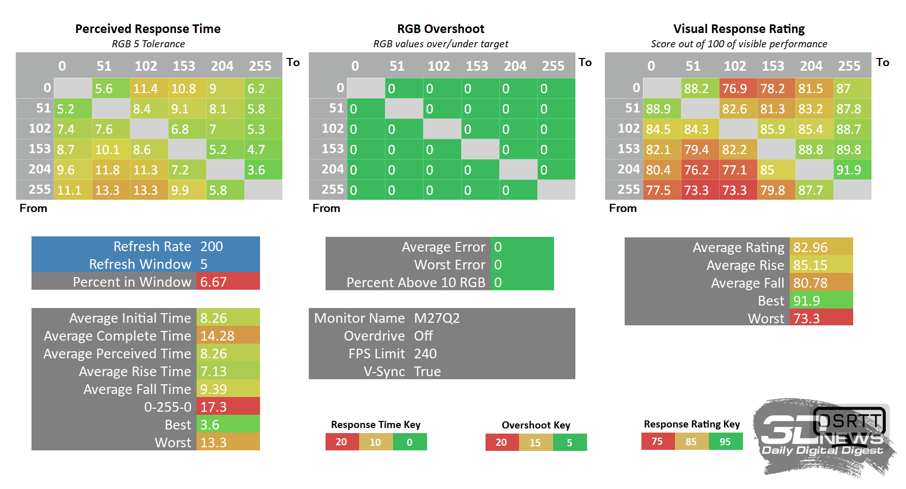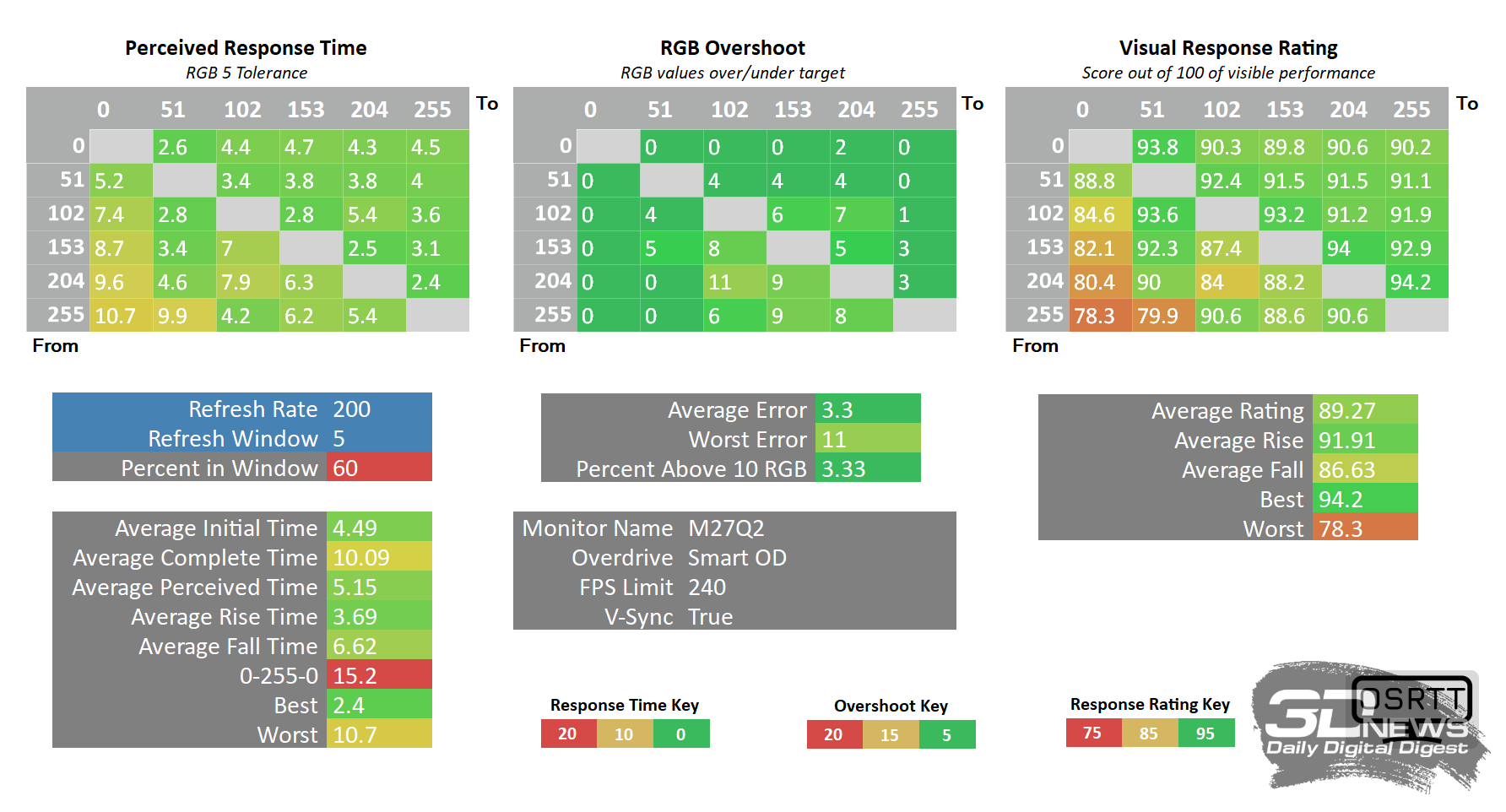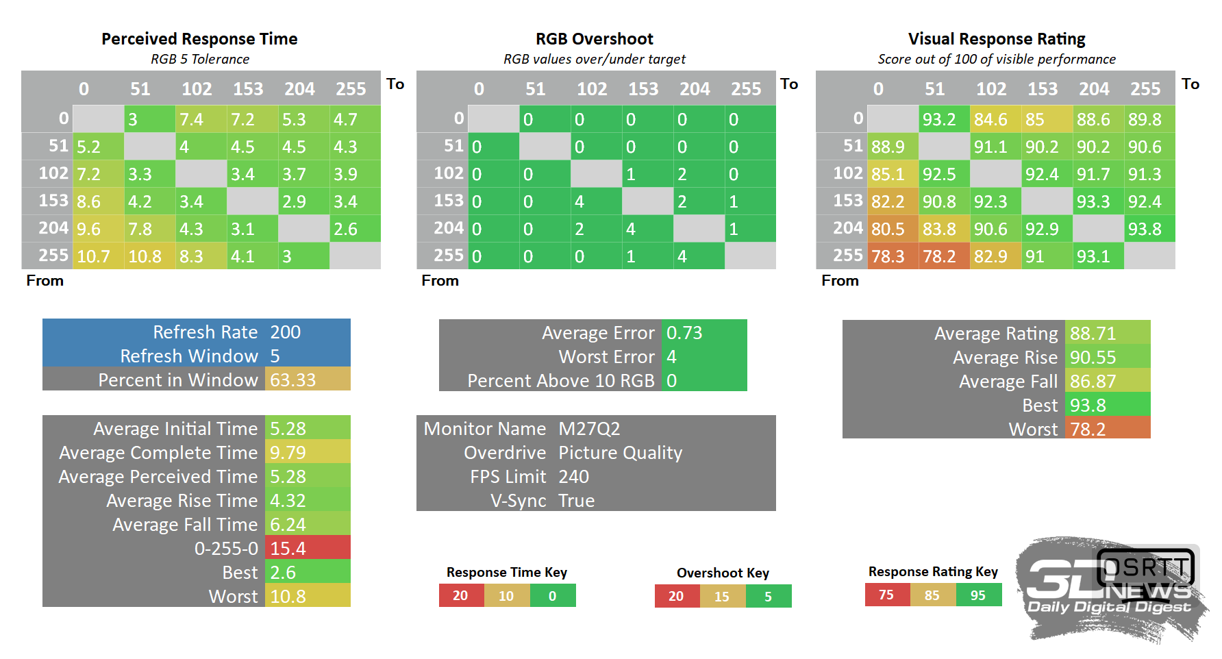 При использовании строгих допусков для расчётов времени отклика монитор Gigabyte продемонстрировал среднее время отклика на уровне 4,5 мс – это отличный пример точной заводской настройки Overdrive и в целом высоких скоростных показателей самой панели, заложенных в неё на этапе производства.