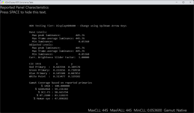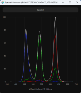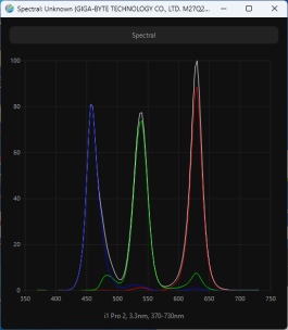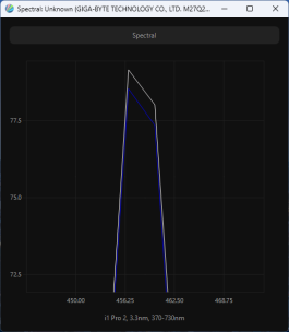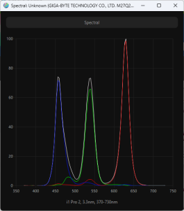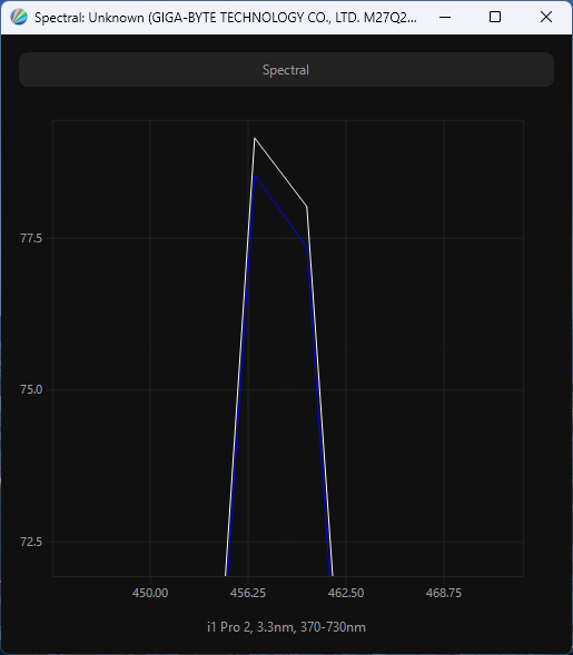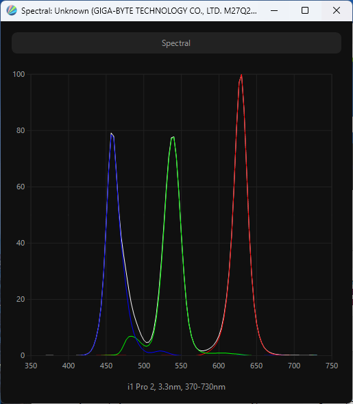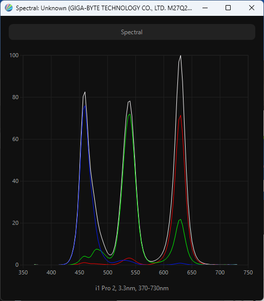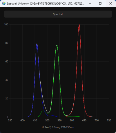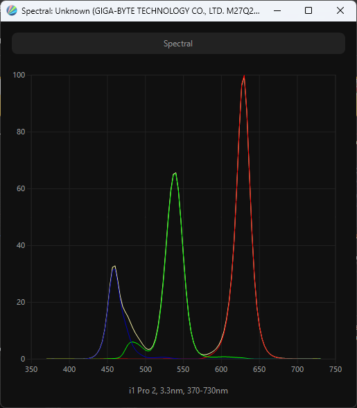 Оценив данные по измеренному спектру подсветки, можно сделать вывод, что в качестве модифицирующего слоя используются указанные Gigabyte «квантовые точки» (QD) поверх стандартных «белых» W-LED-светодиодов. Спектр уравновешен, пики не острые, а слегка сглаженные, подмешивание компонент в чистые цвета – умеренное, цветовой охват ожидаемо высокий. Наиболее волнующий нас пик синего смещён на 455-460 нм, что обеспечивает понижение нагрузки на глаза.