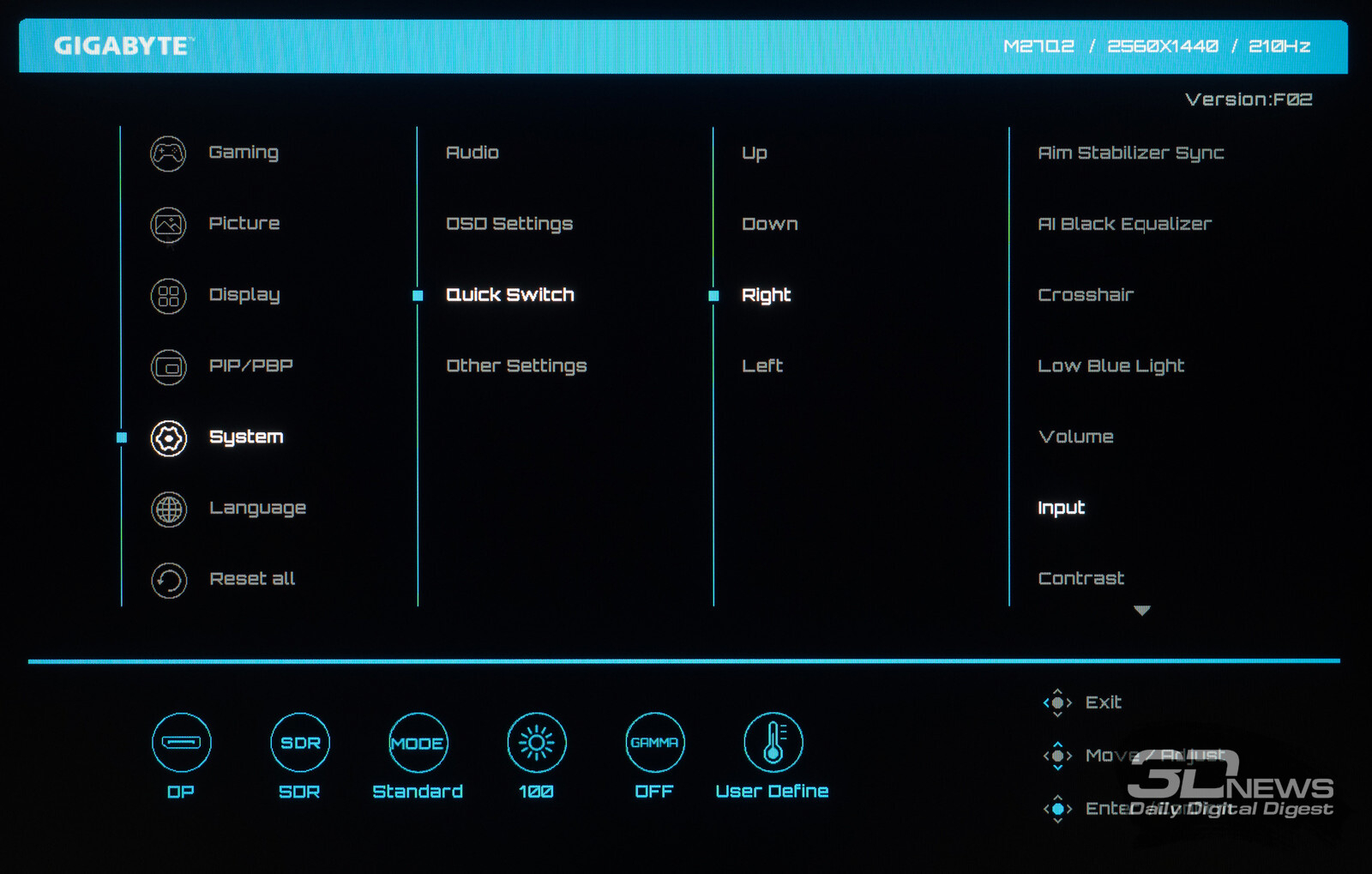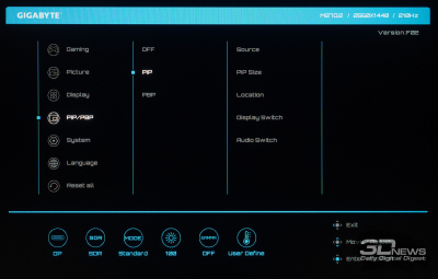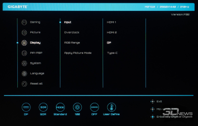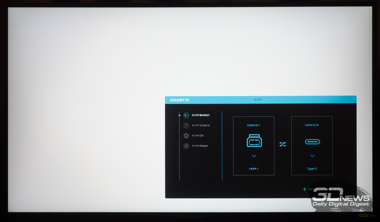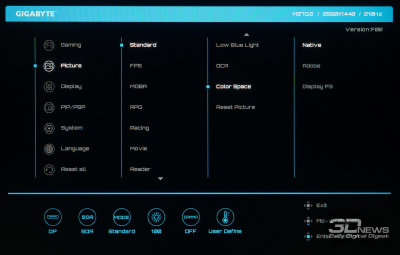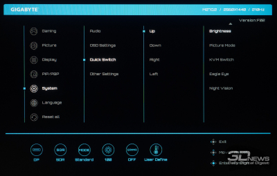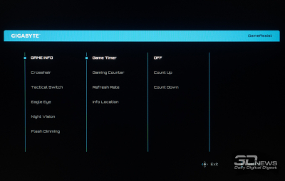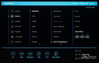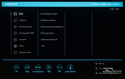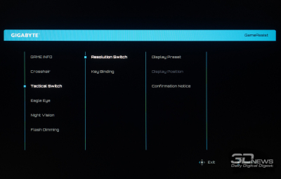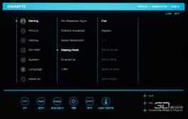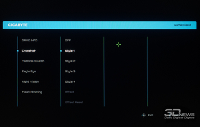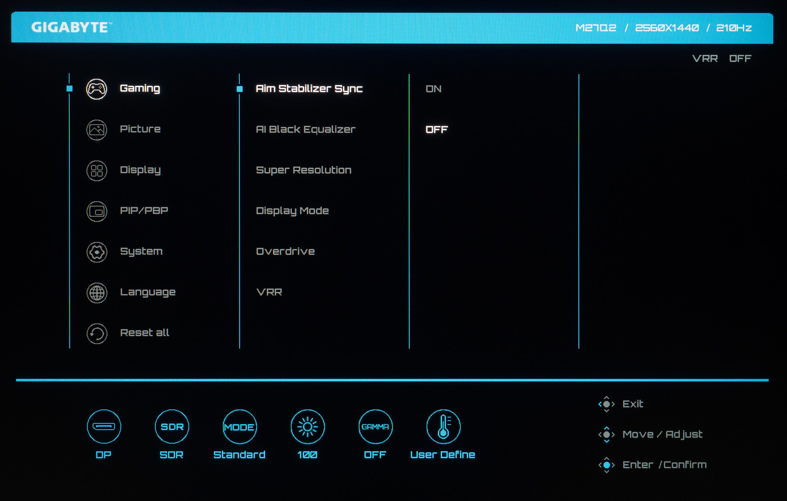 Монитор поддерживает режимы эмуляции цветовых пространств и 6-осевую коррекцию цвета. Для улучшения различимости в тёмных сценах реализована технология AI Black Equalizer, вставка «чёрного кадра» в новинке с возможностью одновременной работы с VRR-технологиями. Игровые функции представлены комплексом GameAssist: можно вывести прицел (в том числе в режиме Night Vision), таймер, счётчик, «орлиный глаз» или вспомогательную сетку. Управление всеми параметрами доступно через новое приложение Gigabyte Control Center, пришедшее на смену Sidekick. Оно интегрируется в Windows и позволяет настраивать монитор прямо из ОС.