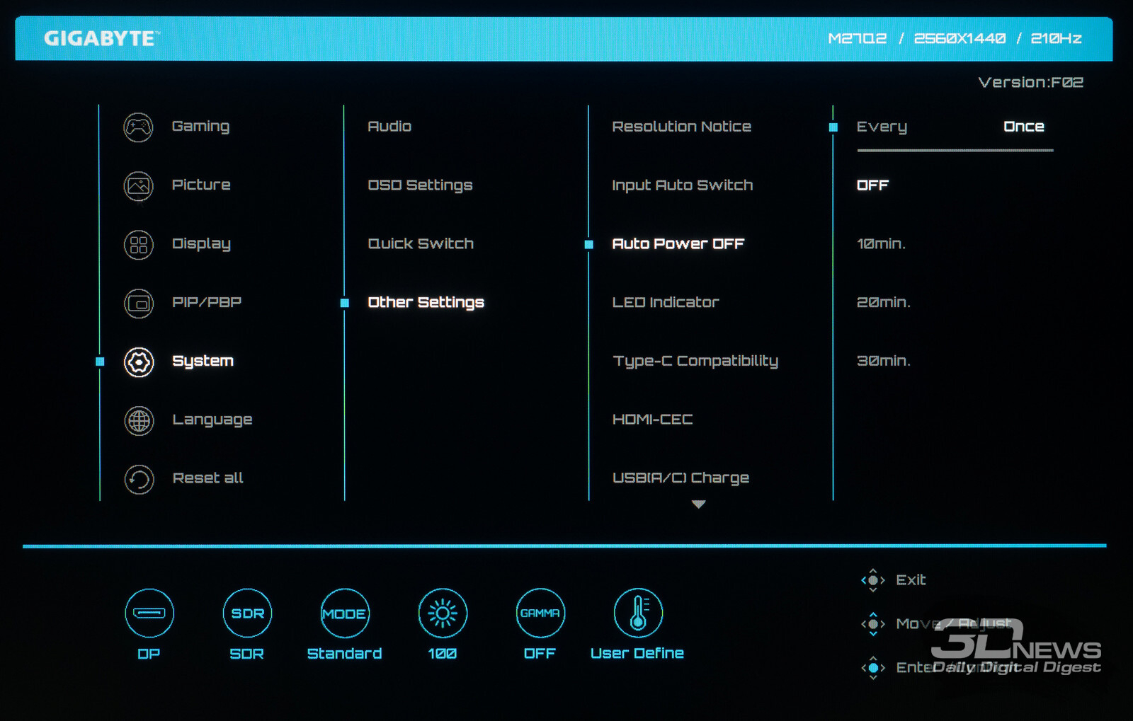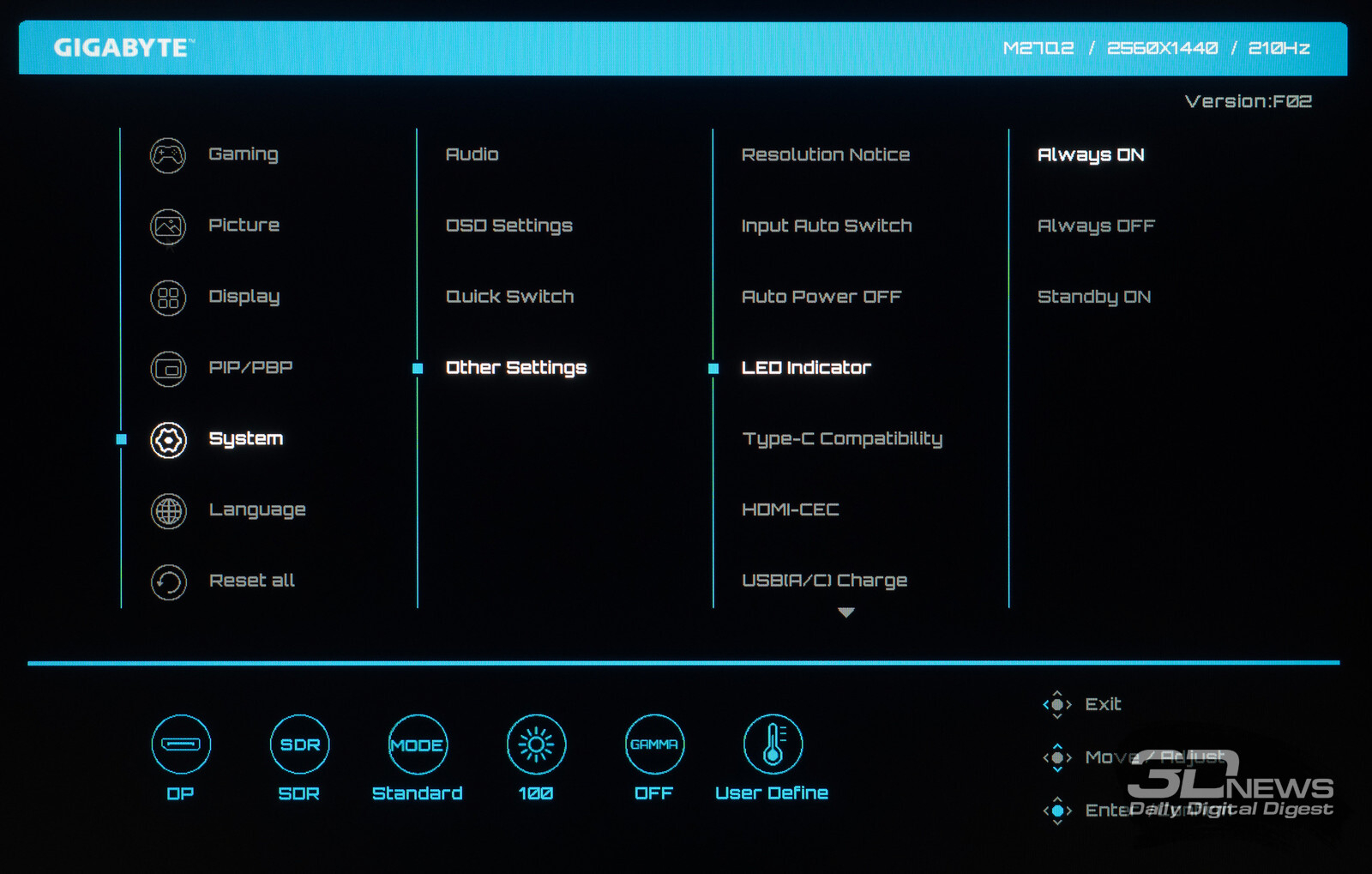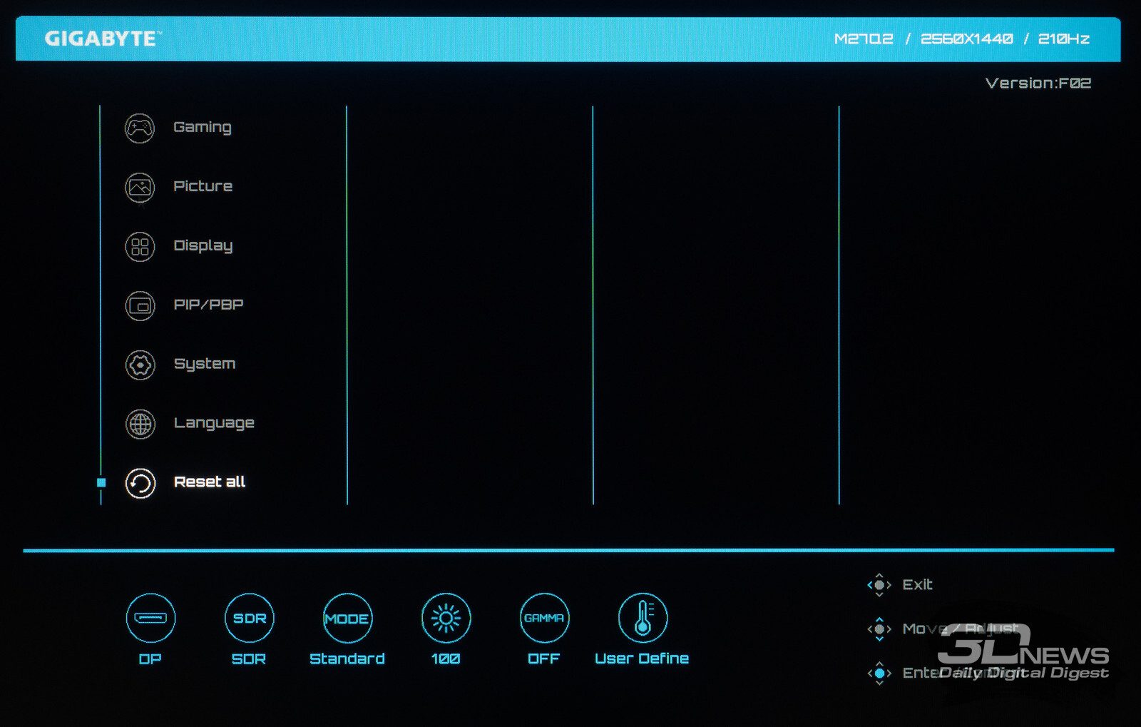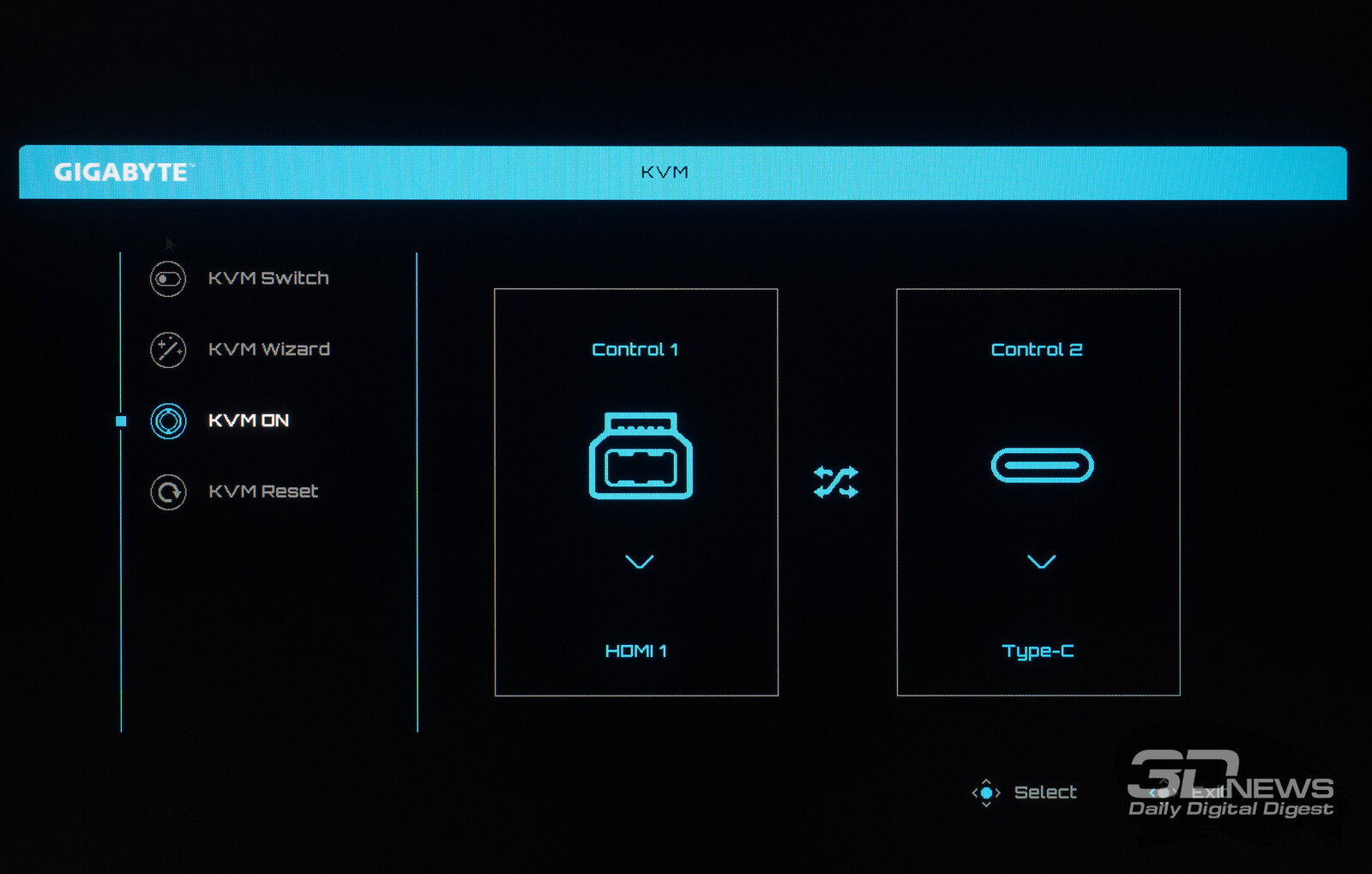 Монитор поддерживает режимы эмуляции цветовых пространств и 6-осевую коррекцию цвета. Для улучшения различимости в тёмных сценах реализована технология AI Black Equalizer, вставка «чёрного кадра» в новинке с возможностью одновременной работы с VRR-технологиями. Игровые функции представлены комплексом GameAssist: можно вывести прицел (в том числе в режиме Night Vision), таймер, счётчик, «орлиный глаз» или вспомогательную сетку. Управление всеми параметрами доступно через новое приложение Gigabyte Control Center, пришедшее на смену Sidekick. Оно интегрируется в Windows и позволяет настраивать монитор прямо из ОС.