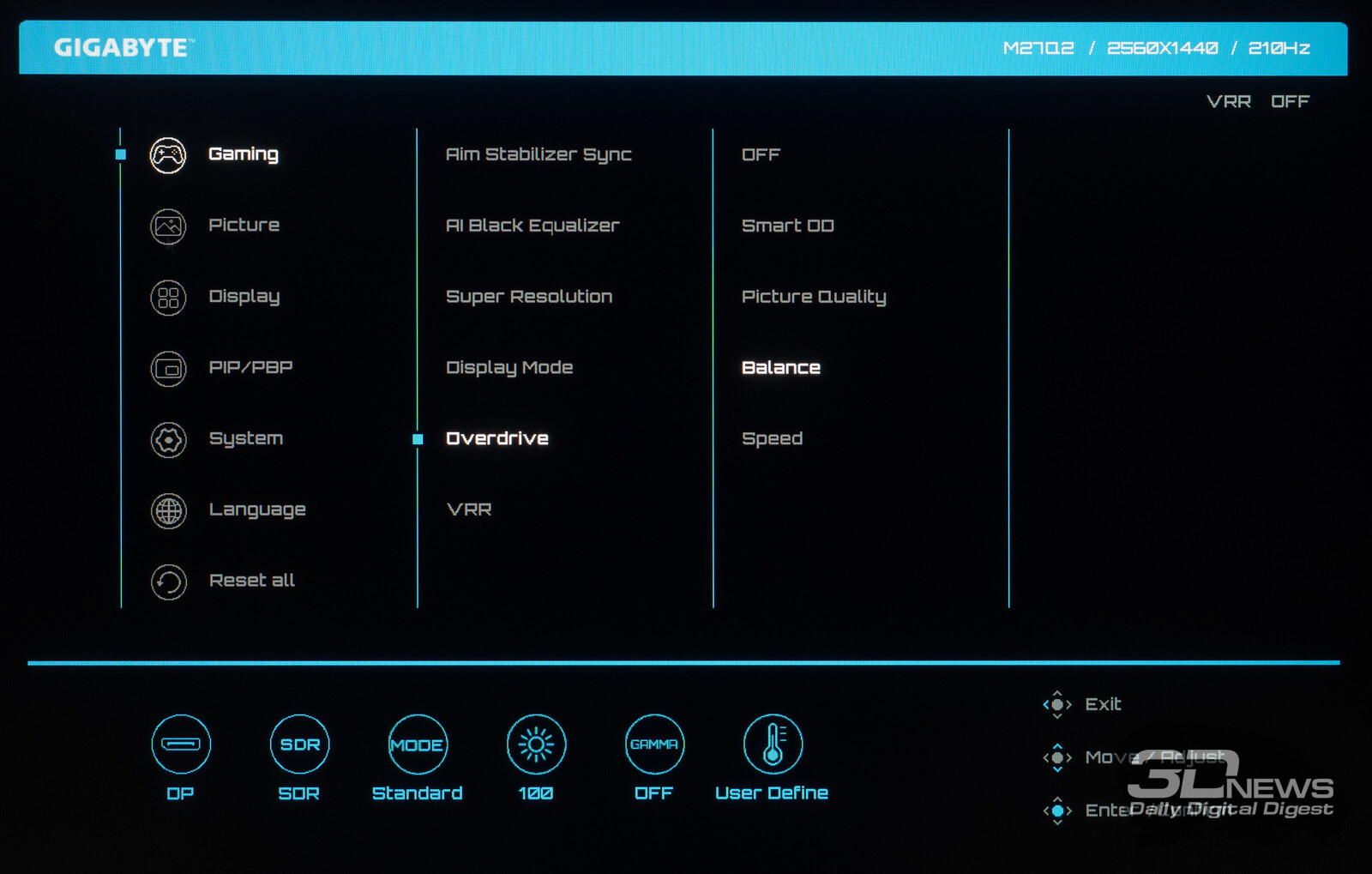 По умолчанию параметр Ovedrive у M27Q2 QD выставлен в положении Smart OD. В этом случае степень разгона скорости реакции пикселей определяется актуальной частотой развёртки, которая будет меняться при работе одной из VRR-систем. Но есть у дисплея и более стандартные режимы, которые мы решили сравнить:
