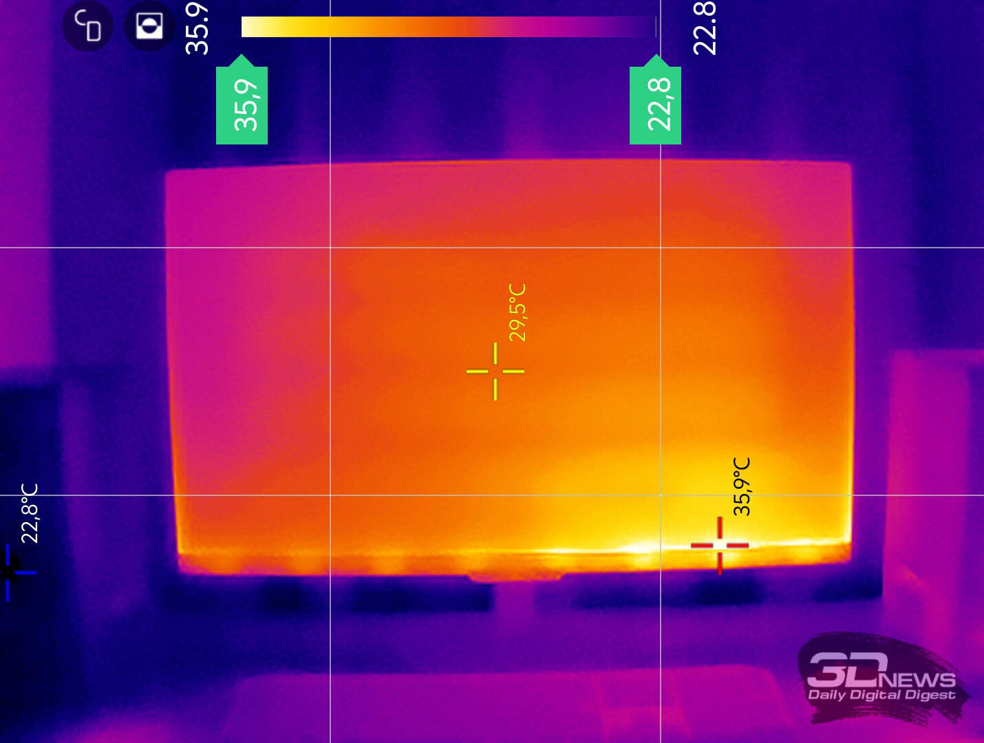 В ходе тестирования средняя температура в помещении площадью 45 кв.м составляла 24,5-25 градусов. Нагрев матрицы происходит относительно равномерно, за исключением нижнего правого края, где выявлена самая высокая температура – на уровне 36 градусов – после многочасового прогрева устройства на разных яркостях.
