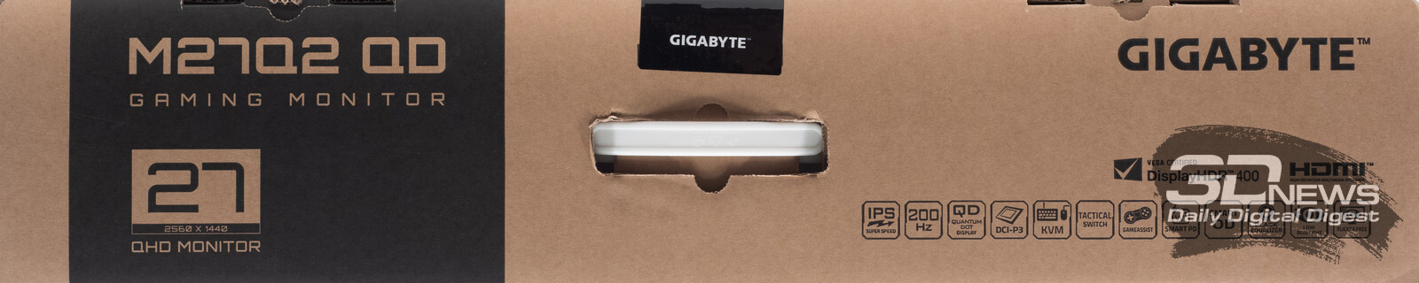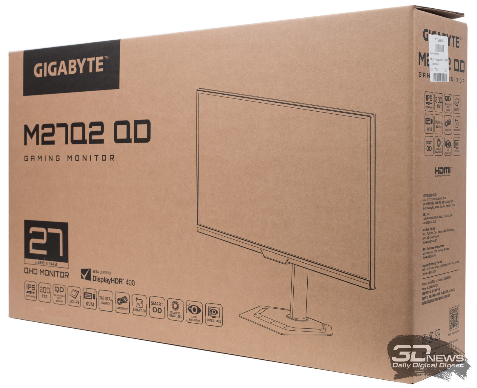 Монитор Gigabyte M27Q2 QD поставляется в среднегабаритной коробке из некрашеного картона. Для удобства транспортировки предусмотрена пластиковая ручка сверху.