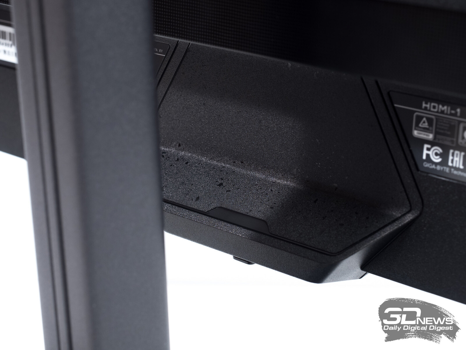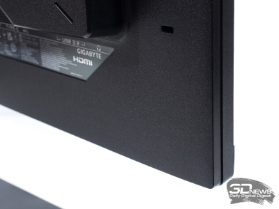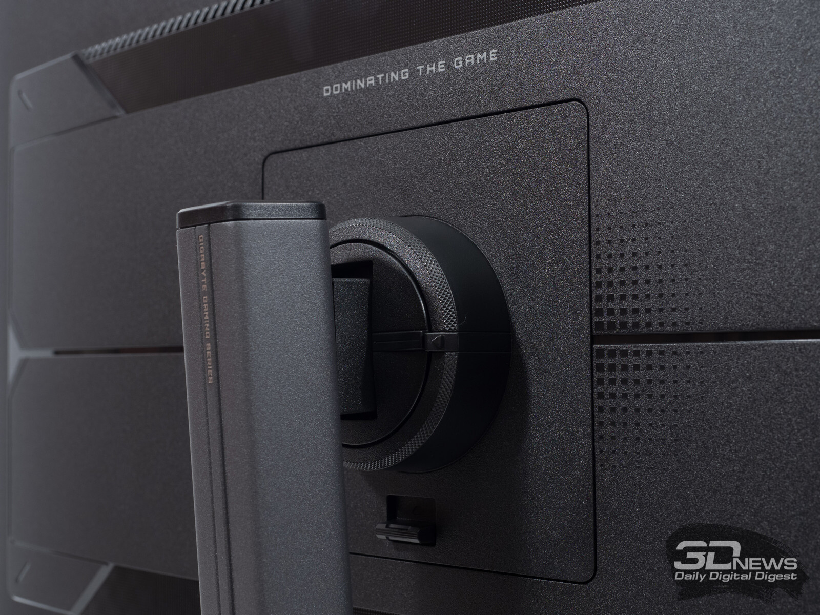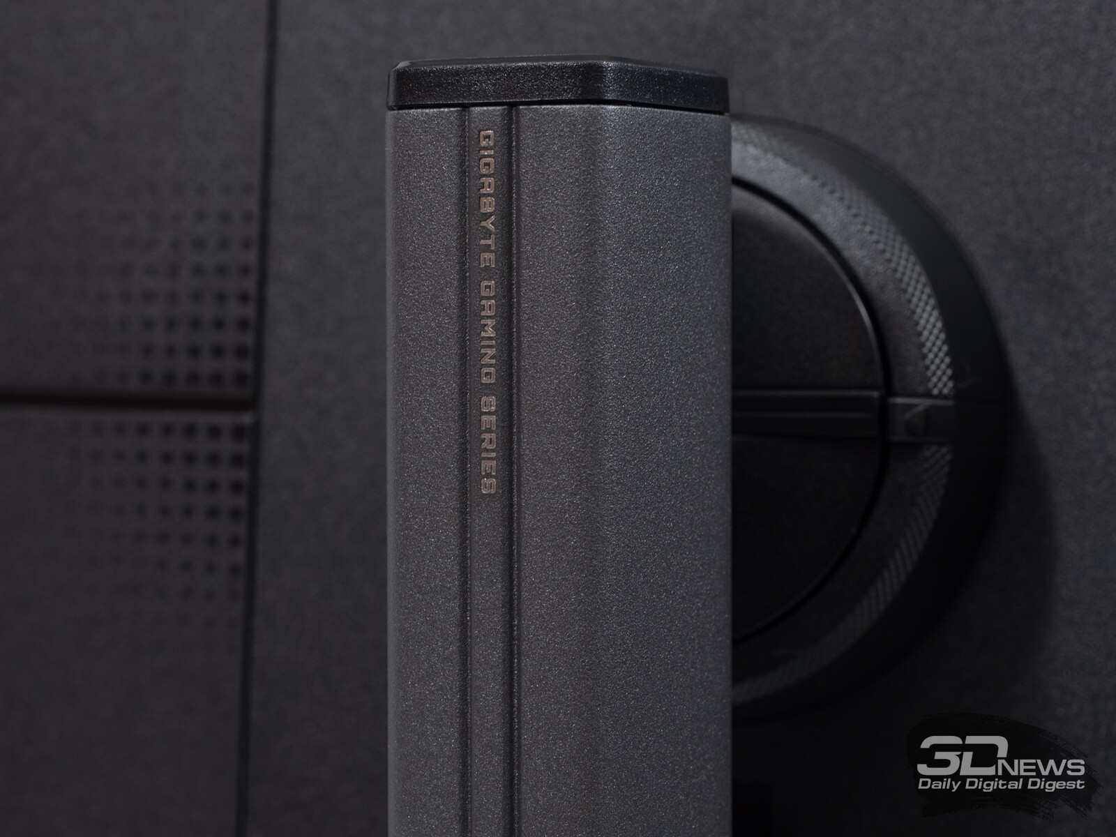 Принадлежность монитора к игровой линейке Gigabyte Gaming подчёркивают фирменные логотипы и различные слоганы, нанесённые на поверхности корпуса и подставки.