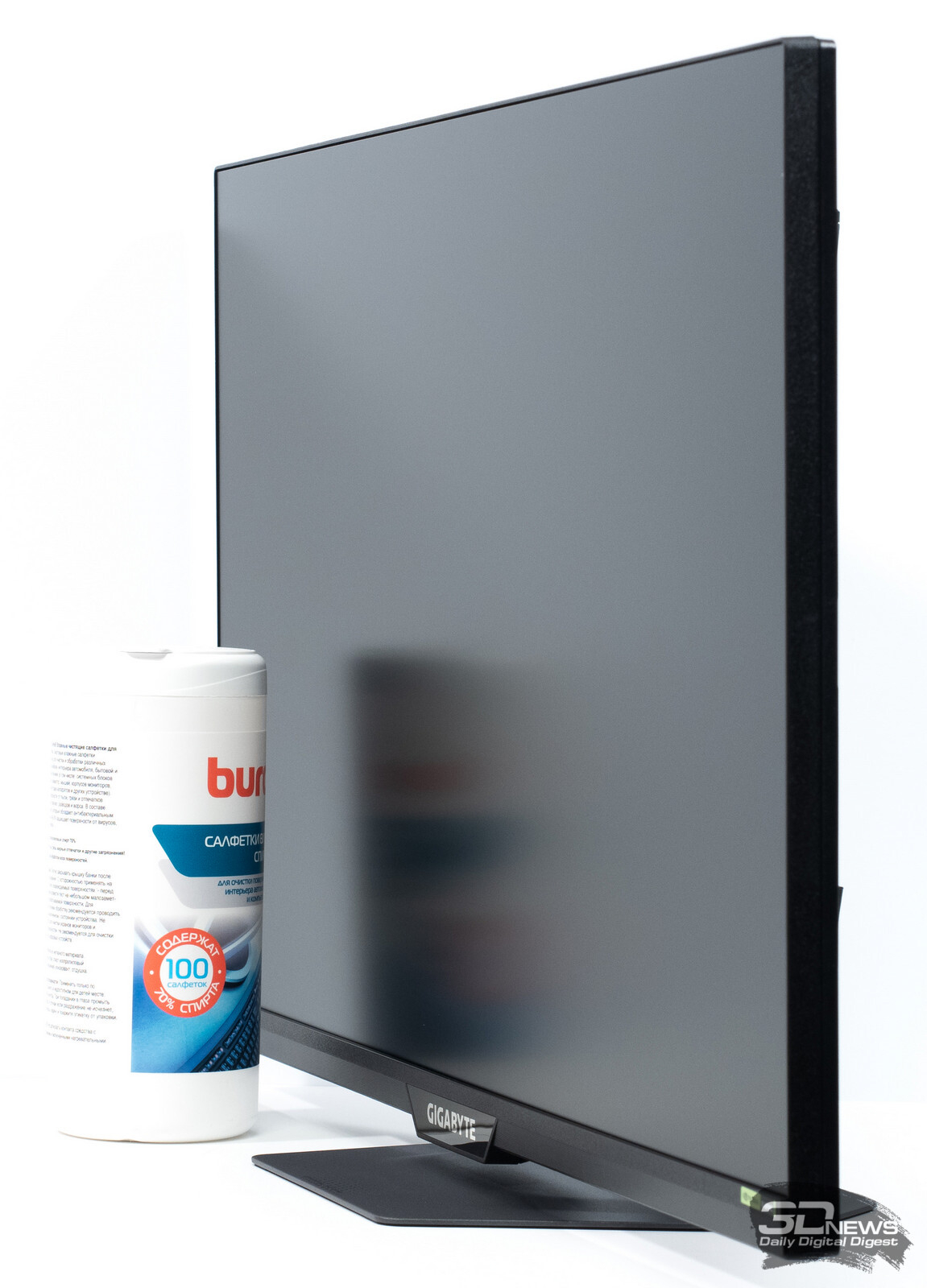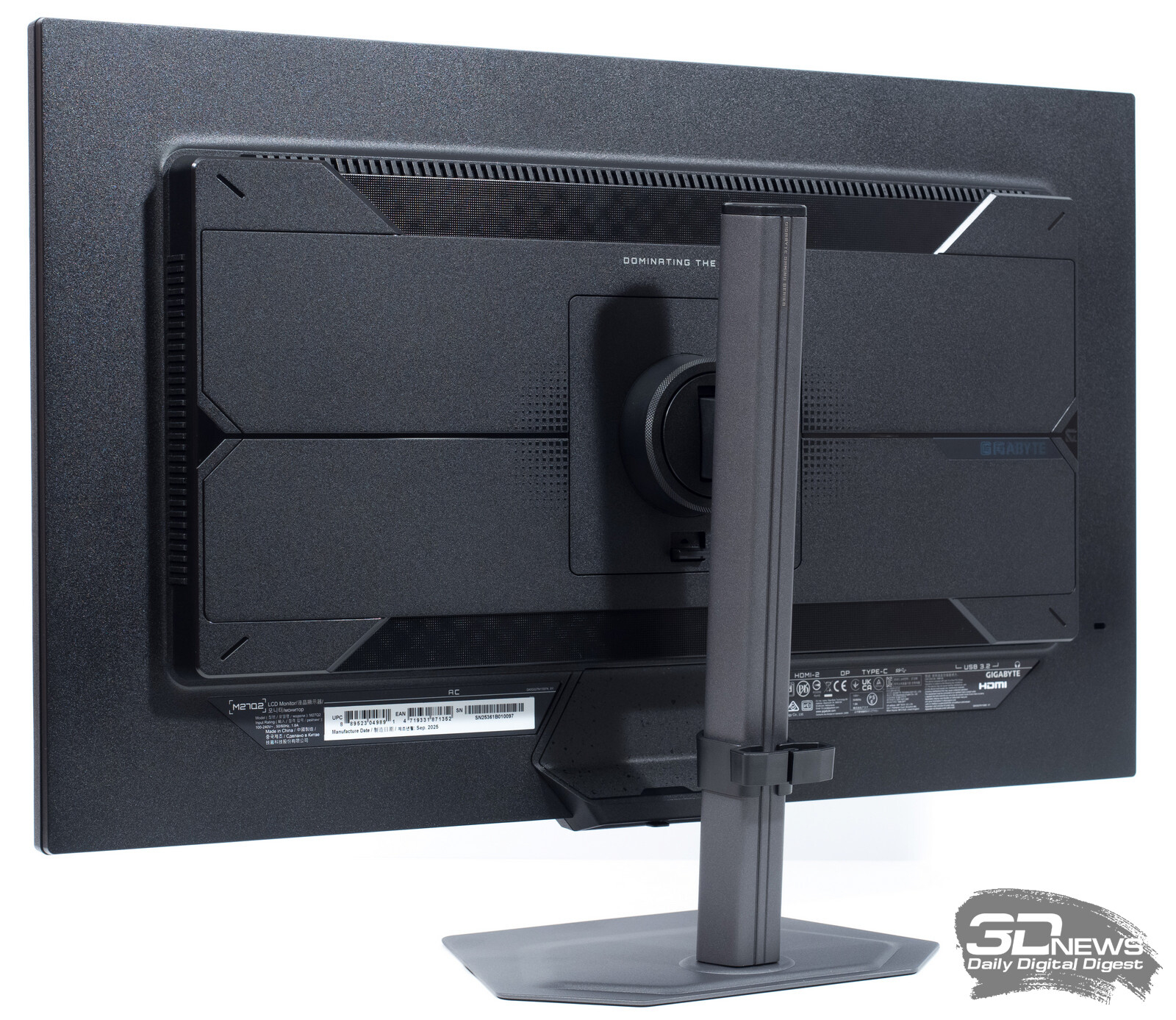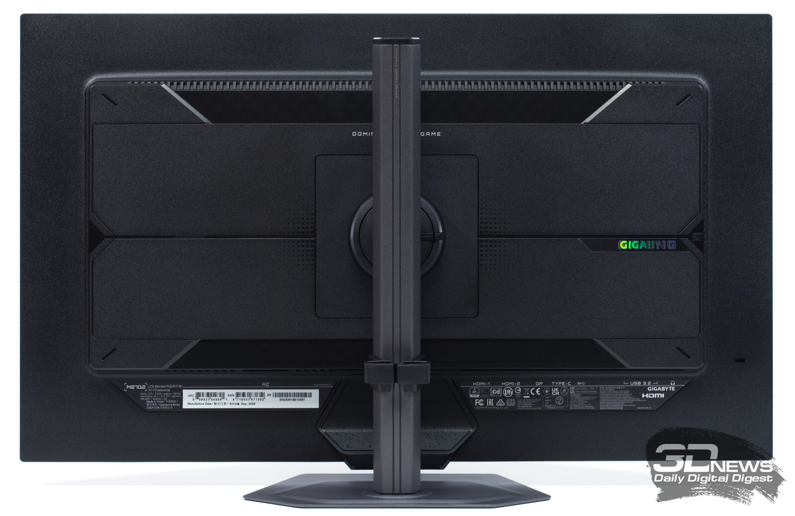 Принадлежность монитора к игровой линейке Gigabyte Gaming подчёркивают фирменные логотипы и различные слоганы, нанесённые на поверхности корпуса и подставки.
