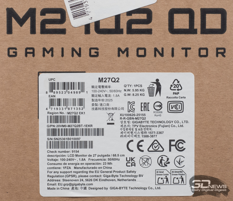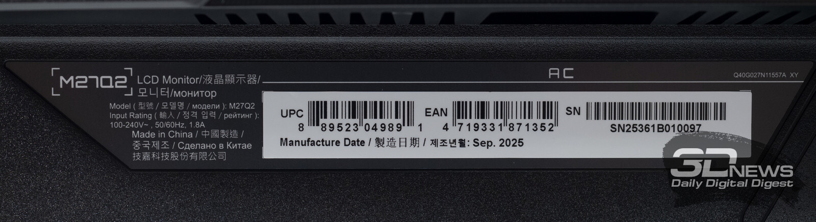 На одной из наклеек размещена важная информация, включающая номер партии, серийный номер, полное название модели монитора, его массу, страну и место производства (Китай), а также реального изготовителя – TPV Electronics (Fujian).