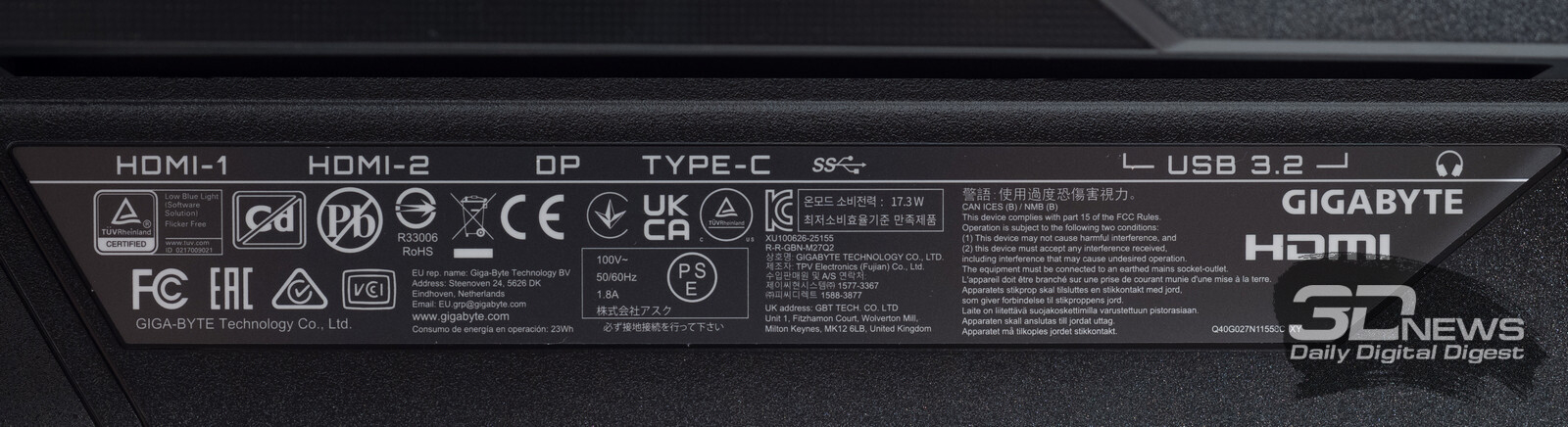 По обе стороны от центральной подставки, в задней нижней части корпуса, размещены две наклейки, которые содержат важную информацию. По ним можно сверить серийный номер и идентификатор устройства, уточнить название модели и подтвердить, что устройство произведено в Китае. На этих же наклейках указаны все полученные сертификаты соответствия и подписаны интерфейсы подключения, что упрощает идентификацию и настройку устройства.