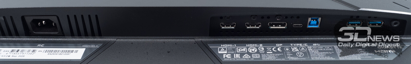 В список доступных интерфейсов для подключения у монитора входят два HDMI 2.0 (с ограничением частоты на уровне 144 Гц), один DP 1.4 с поддержкой DSC и USB Type-C с DP Alt-режимом и зарядкой PD на 18 Вт. Также есть 3,5 мм аудиовыход для наушников или внешней акустической системы, два порта USB 3.2 Gen1 Type-A для подключения различной периферии.