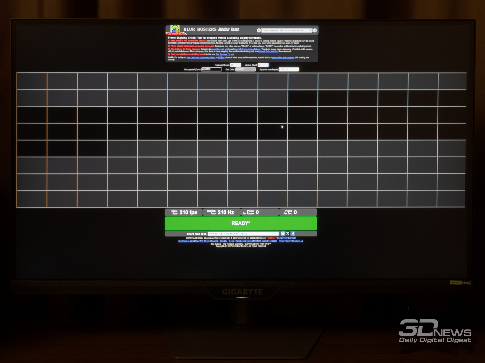 Изучили мы и пропуск кадров на максимальной частоте 210 Гц после активации функции Overclock – проблем нет, всё стабильно – проверено с помощью специализированного теста TestUFO.