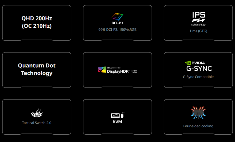 Высокие цифры соответствия трём цветовым стандартам соседствуют со статичным коэффициентом контрастности ~1500:1, скорость IPS-матрицы приятно удивляет, а при со 210 Гц монитор с лёгкостью соперничает с лучшими представителями класса 27-дюймовых WQHD с частотой до 240 Гц.