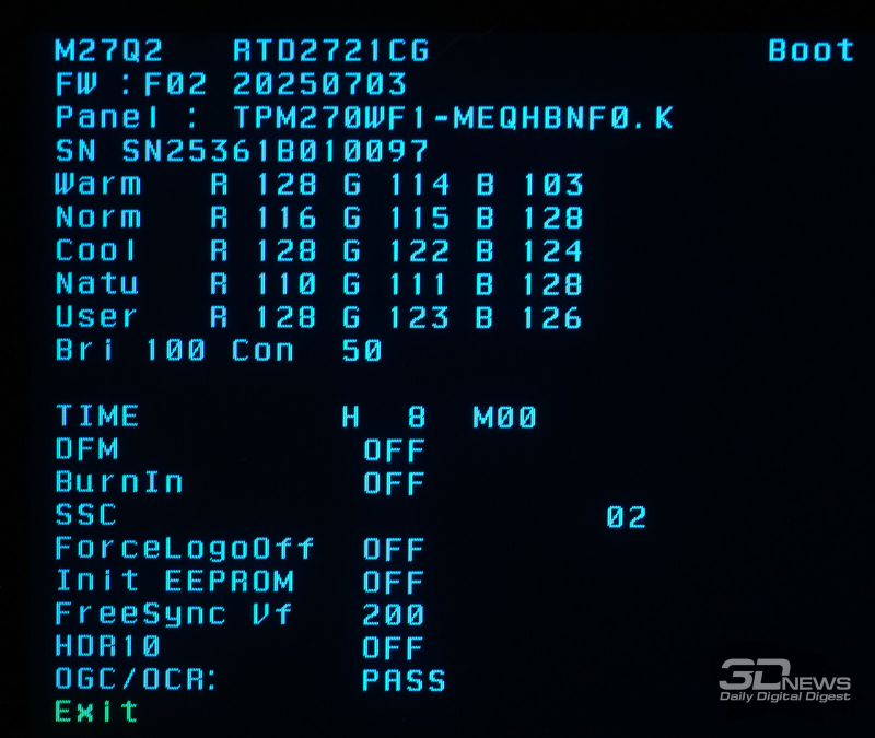 Благодаря полученному доступу к сервисному меню новинки мы выяснили, что в качестве основы монитора выступает матрица TPM270WF1-MEQHBNF0.K от крупного китайского сборщика/упаковщика – компании TPV. Но есть и вероятность того, что это просто перемаркированная ME270QHB-NF0 (Rev 3.0) от китайской компании BOE. Часть маркировок совпадает, а TPV не является производителем матриц – такова наша логика.