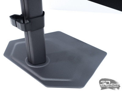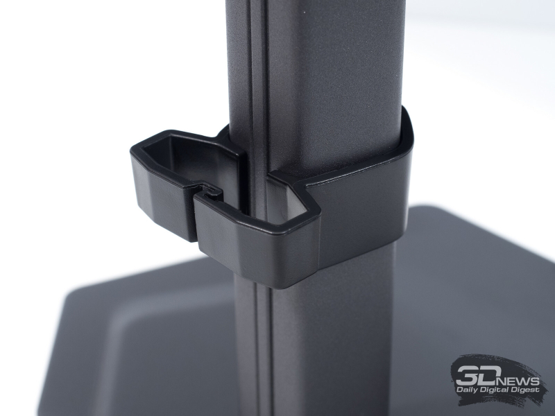 Для прокладки кабелей предусмотрен перемещающийся по всей высоте подставки пластиковый держатель, который не имеет чётких фиксируемых позиций. Решение новое и здравое – одобряем.