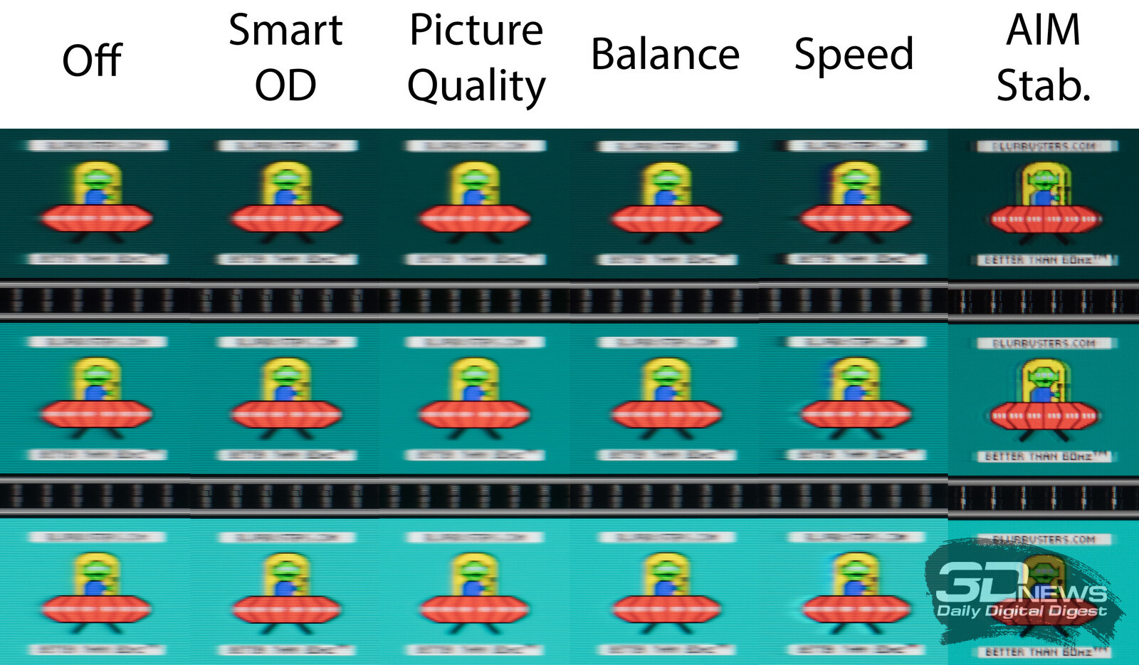 Производитель установил оптимальный режим OD при настройках по умолчанию. В ходе проверки Smart OD показал себя на уровне режима Balance. При выключенном Overdrive и в режиме Picture Quality заметны более сильные шлейфы за движущимися объектами, а также общая смазанность сцены. В режиме Speed проявляются сильные артефакты, и это точно не стоит тех улучшений скоростных показателей, которые способен продемонстрировать герой обзора.