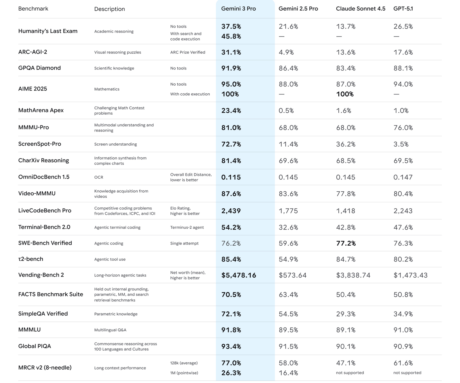 Gemini 3 Pro — флагманская версия модели — превосходит предыдущее поколение по всем основным ИИ-бенчмаркам: