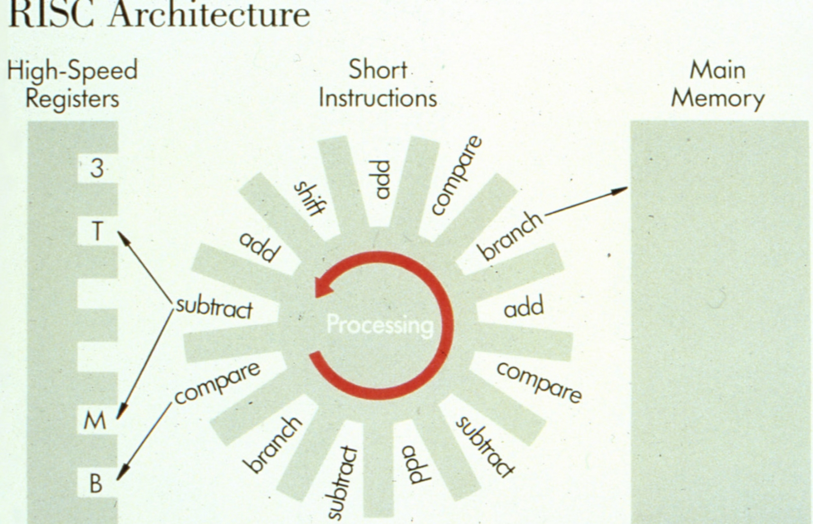 Слайд из одной из ранних презентаций группы Коука, наглядно представляющий суть RISC-архитектуры (источник: IBM)