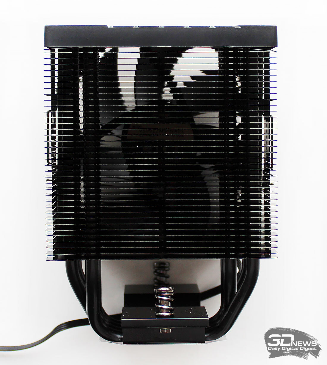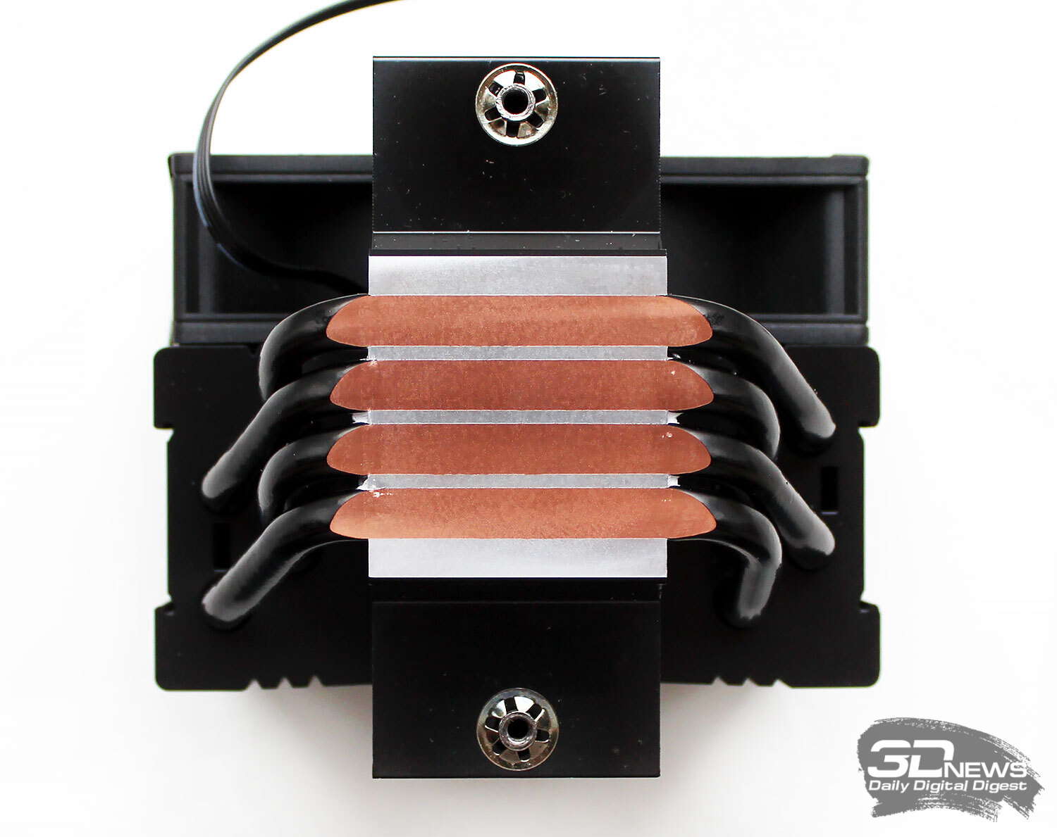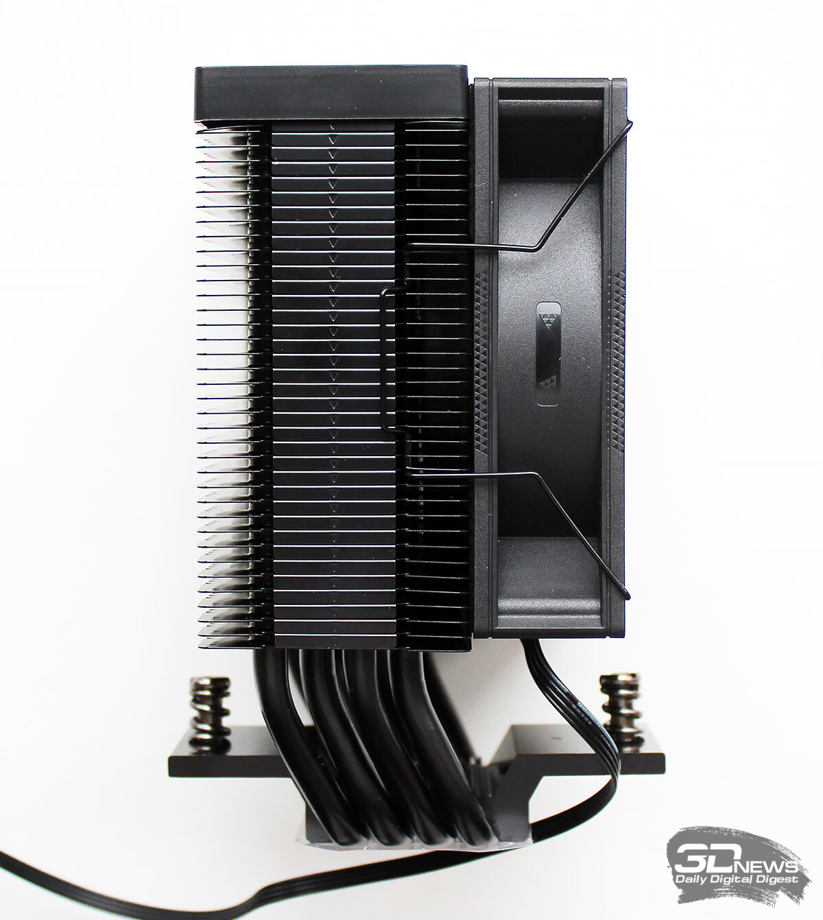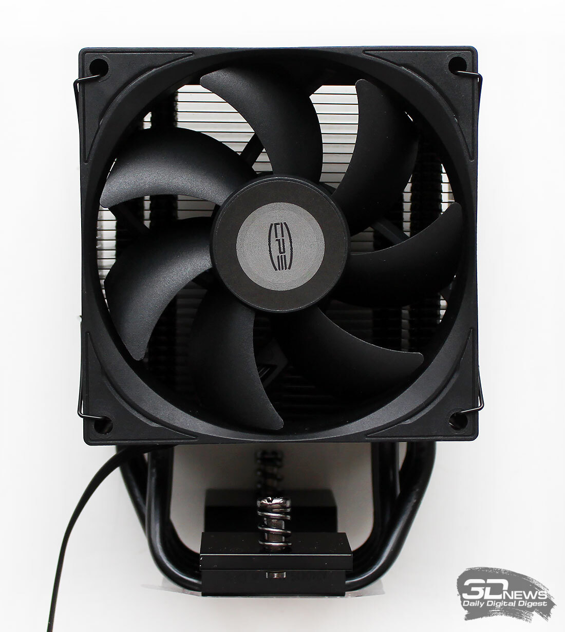 ⇡#Упаковка и комплектацияСлегка помятая коробка PCCooler R400 выполнена из плотного картона, а на её лицевой стороне изображён кулер, указана модель и то, что она относится к высокопроизводительным процессорным кулерам. На обратной стороне коробки можно найти таблицу с подробными техническими характеристиками системы охлаждения и перечислением поддерживаемых процессорных разъёмов. Защиту кулеру внутри картонной коробки обеспечивают вставки из вспененного полиэтилена, а аксессуары запечатаны в небольшой пакетик. Внутри него находится пластиковая усилительная пластина с наконечниками для Intel, два комплекта стальных направляющих для AMD и Intel, комплект втулок и винтов, пакетик термопасты и краткая инструкция по установке. Розничная стоимость PCCooler R400 составляет 1 250 рублей, и это один из наиболее доступных башенных кулеров такого размера. Страна производства – Китай, гарантия – 2 года. ⇡#Особенности конструкцииPCCooler R400 является компактным башенным кулером с радиатором на тепловых трубках и небольшим вентилятором. Базовая версия R400, которую мы сегодня тестируем, полностью выполнена в чёрном цвете. Также у PCCooler есть версия с подсветкой R400 ARGB и такая же версия, но в белом цвете. Высота кулера на 18 мм меньше, чем у недавно протестированной нами модели PCCooler RT500 TC ARGB и равна 133 мм, ширина – 95 мм (с учётом скоб вентиляторов – 98 мм), а толщина всего 72 – мм или 88 мм, если измерять по креплению. От кулера с такими скромными размерами мы ждали небольшой массы, но PCCooler R400 удивил ещё больше, поскольку оказался невероятно лёгким: его масса всего 364 грамма, из которых на радиатор приходится 272 грамма. С такой развесовкой коэффициент полезной массы этой модели равен 0,7473 единицы. Кулер относится к башенной конструкции, когда на вертикальных тепловых трубках напрессованы алюминиевые пластины, охлаждаемые вентилятором. Из конструктивных особенностей PCCooler R400 отметим смещение радиатора вперёд по ходу движения воздушного потока за счёт изгиба тепловых трубок, загнутыми вниз концами рёбер среднюю часть боковин радиатора. Верхняя пластина радиатора и концы тепловых трубок накрыты пластиковой крышкой с треугольной штамповкой (стиль TriForce), которая придаёт кулеру завершённый и более привлекательный вид. Основание PCCooler R400 было защищено плёнкой с предупреждением об обязательном её удалении перед установкой кулера на процессор. Раз написано удалить плёнку, значит удалили. В радиаторе кулера только 37 алюминиевых пластин толщиной не более 0,4 мм каждая. Они напрессованы на тепловых трубках с межрёберным расстоянием 2,0–2,1 мм. При такой компоновке и размерах расчётная площадь радиатора PCCooler R400 составляет лишь 3074 см2. Тем удивительнее, что с такой площадью в спецификациях кулера заявлен предельный уровень тепловыделения процессора 180 ватт. Это очень приличное значение, но до тестов мы его под сомнение ставить не будем. На входе воздушного потока в радиатор торцы рёбер имеют две зубчатые зоны, которые, по всей видимости, должны способствовать снижению сопротивления воздушному потоку вентилятора. Радиатор пронизан четырьмя медными тепловыми трубками диаметром 6 мм каждая. На странице кулера заявлено об использовании тепловых трубок нового поколения, на эффективность работы которых не влияет ориентация радиатора в пространстве. То есть речь идёт об обычных 