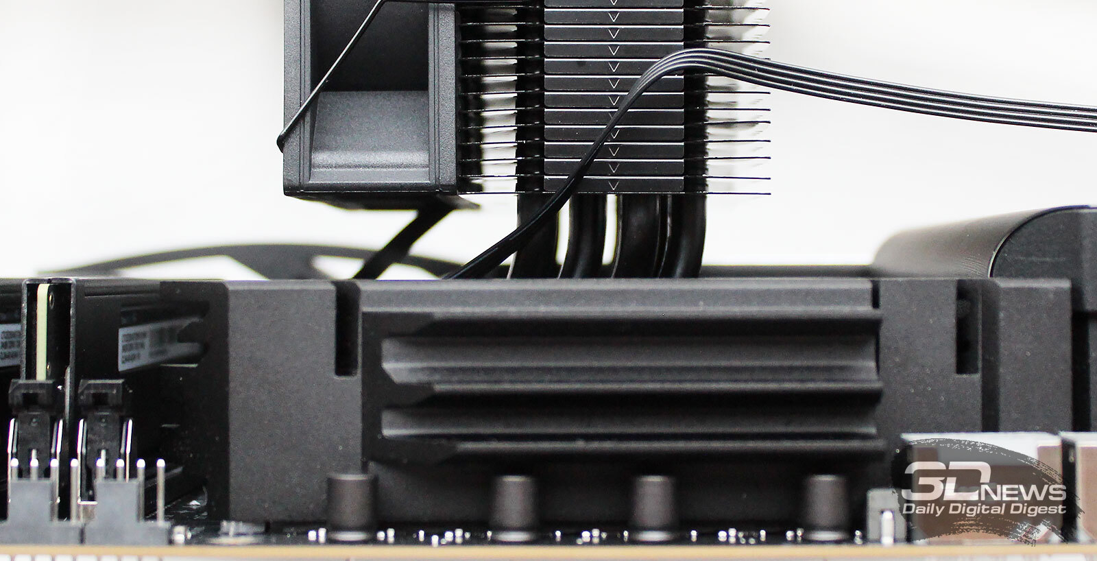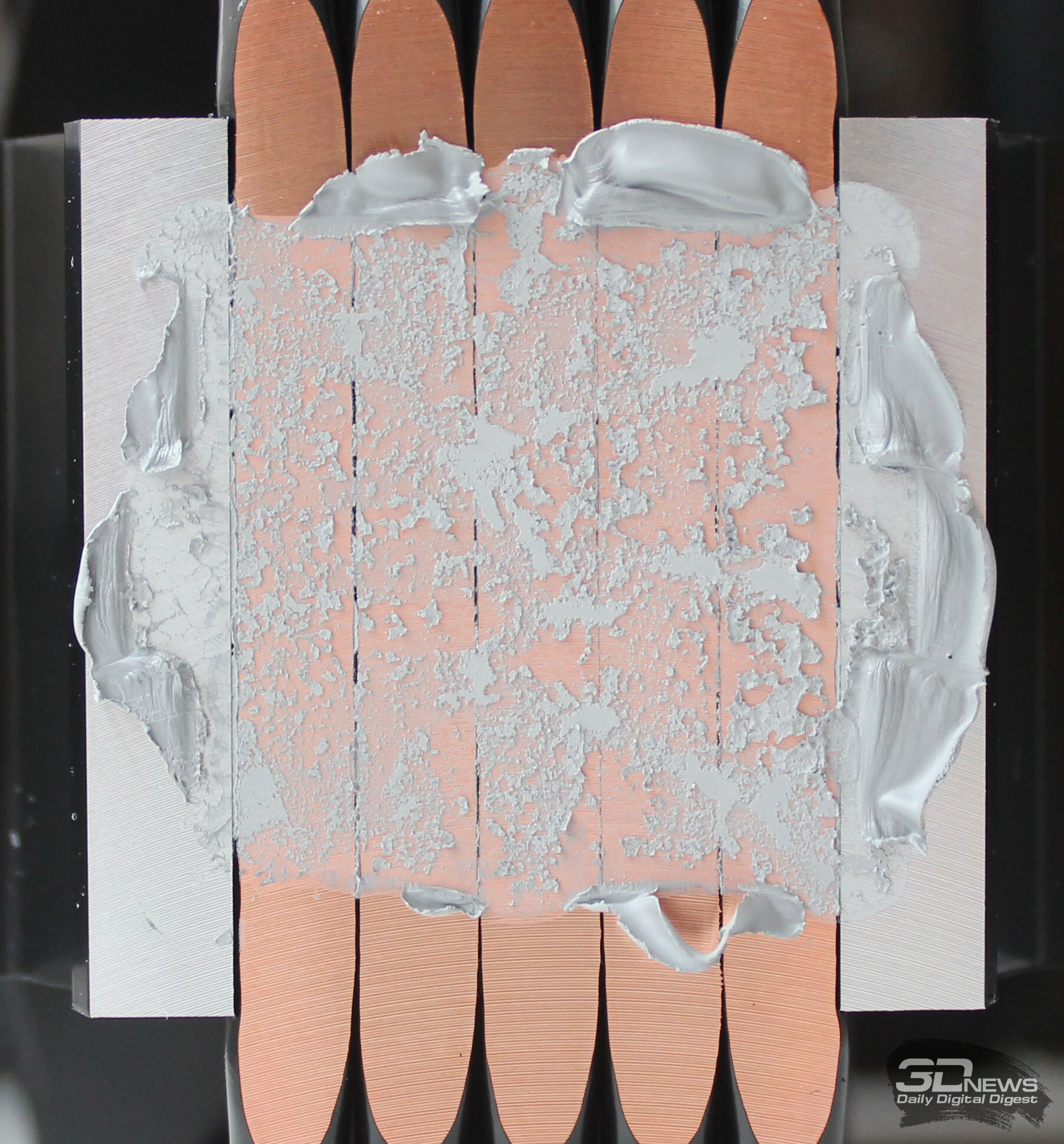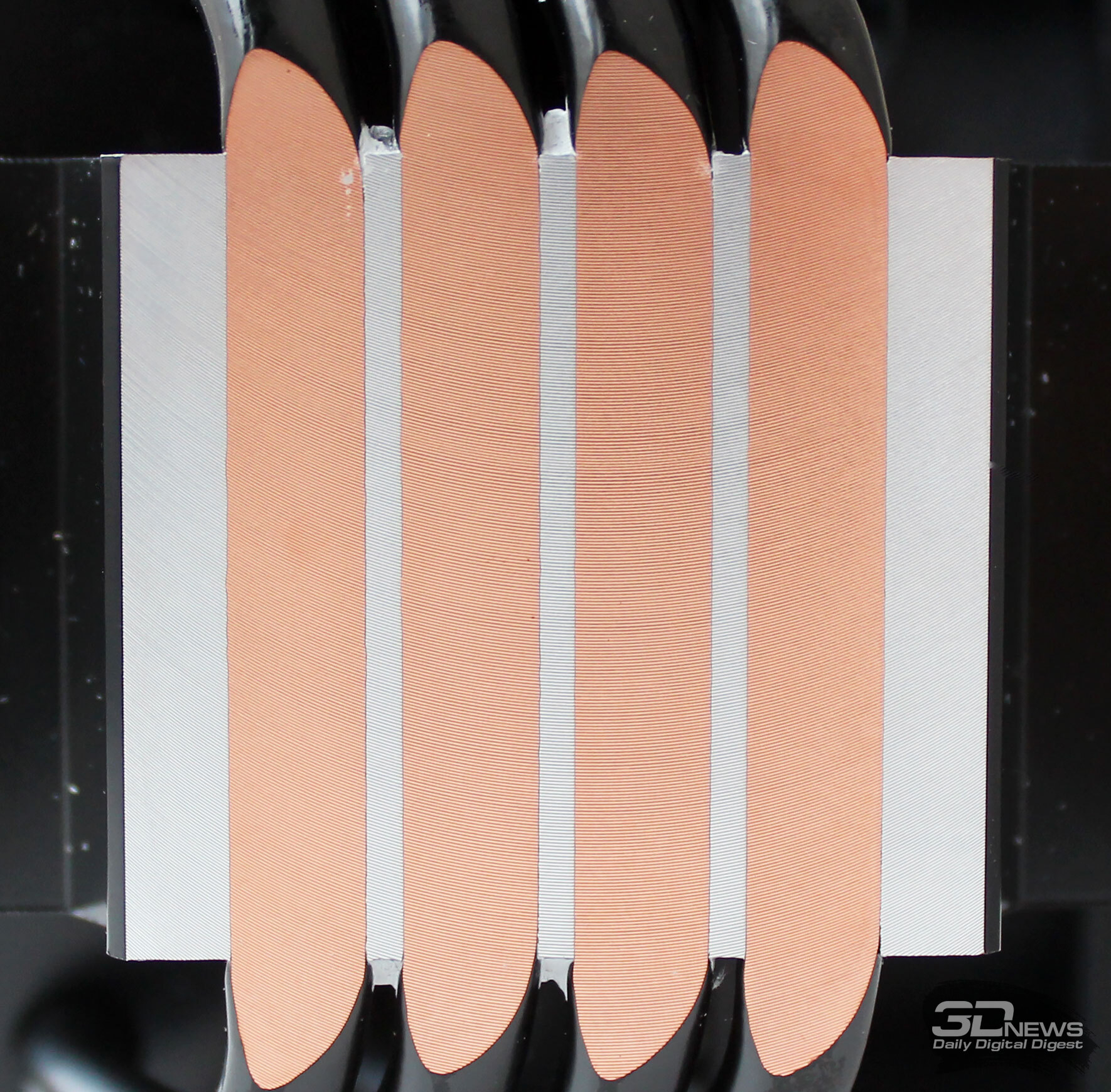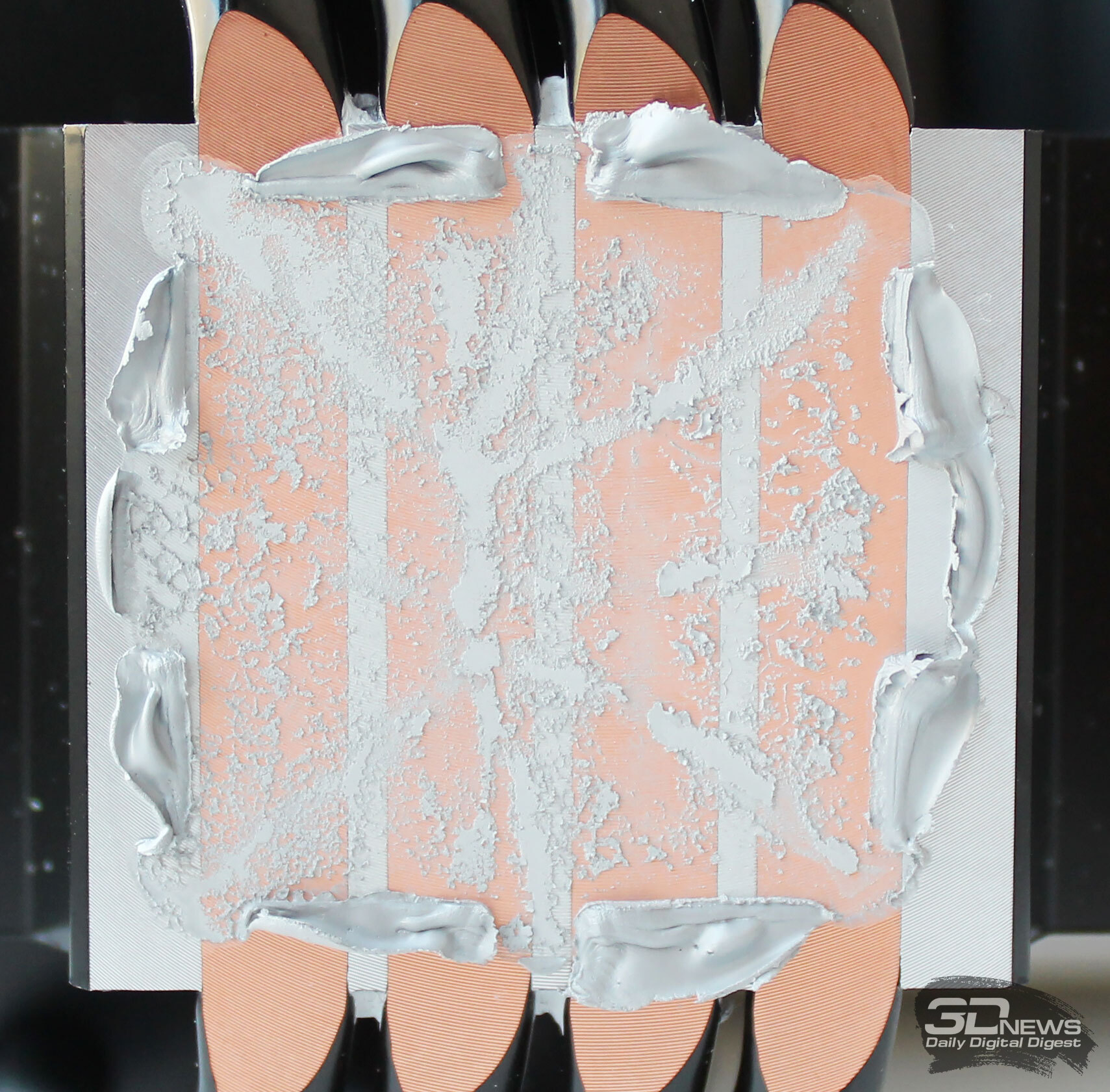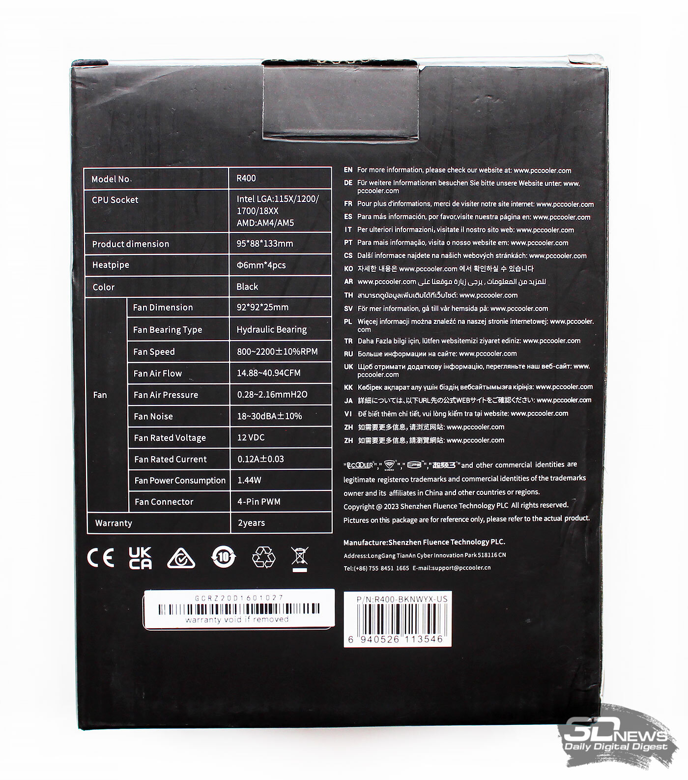 ⇡#Упаковка и комплектацияСлегка помятая коробка PCCooler R400 выполнена из плотного картона, а на её лицевой стороне изображён кулер, указана модель и то, что она относится к высокопроизводительным процессорным кулерам. На обратной стороне коробки можно найти таблицу с подробными техническими характеристиками системы охлаждения и перечислением поддерживаемых процессорных разъёмов. Защиту кулеру внутри картонной коробки обеспечивают вставки из вспененного полиэтилена, а аксессуары запечатаны в небольшой пакетик. Внутри него находится пластиковая усилительная пластина с наконечниками для Intel, два комплекта стальных направляющих для AMD и Intel, комплект втулок и винтов, пакетик термопасты и краткая инструкция по установке. Розничная стоимость PCCooler R400 составляет 1 250 рублей, и это один из наиболее доступных башенных кулеров такого размера. Страна производства – Китай, гарантия – 2 года. ⇡#Особенности конструкцииPCCooler R400 является компактным башенным кулером с радиатором на тепловых трубках и небольшим вентилятором. Базовая версия R400, которую мы сегодня тестируем, полностью выполнена в чёрном цвете. Также у PCCooler есть версия с подсветкой R400 ARGB и такая же версия, но в белом цвете. Высота кулера на 18 мм меньше, чем у недавно протестированной нами модели PCCooler RT500 TC ARGB и равна 133 мм, ширина – 95 мм (с учётом скоб вентиляторов – 98 мм), а толщина всего 72 – мм или 88 мм, если измерять по креплению. От кулера с такими скромными размерами мы ждали небольшой массы, но PCCooler R400 удивил ещё больше, поскольку оказался невероятно лёгким: его масса всего 364 грамма, из которых на радиатор приходится 272 грамма. С такой развесовкой коэффициент полезной массы этой модели равен 0,7473 единицы. Кулер относится к башенной конструкции, когда на вертикальных тепловых трубках напрессованы алюминиевые пластины, охлаждаемые вентилятором. Из конструктивных особенностей PCCooler R400 отметим смещение радиатора вперёд по ходу движения воздушного потока за счёт изгиба тепловых трубок, загнутыми вниз концами рёбер среднюю часть боковин радиатора. Верхняя пластина радиатора и концы тепловых трубок накрыты пластиковой крышкой с треугольной штамповкой (стиль TriForce), которая придаёт кулеру завершённый и более привлекательный вид. Основание PCCooler R400 было защищено плёнкой с предупреждением об обязательном её удалении перед установкой кулера на процессор. Раз написано удалить плёнку, значит удалили. В радиаторе кулера только 37 алюминиевых пластин толщиной не более 0,4 мм каждая. Они напрессованы на тепловых трубках с межрёберным расстоянием 2,0–2,1 мм. При такой компоновке и размерах расчётная площадь радиатора PCCooler R400 составляет лишь 3074 см2. Тем удивительнее, что с такой площадью в спецификациях кулера заявлен предельный уровень тепловыделения процессора 180 ватт. Это очень приличное значение, но до тестов мы его под сомнение ставить не будем. На входе воздушного потока в радиатор торцы рёбер имеют две зубчатые зоны, которые, по всей видимости, должны способствовать снижению сопротивления воздушному потоку вентилятора. Радиатор пронизан четырьмя медными тепловыми трубками диаметром 6 мм каждая. На странице кулера заявлено об использовании тепловых трубок нового поколения, на эффективность работы которых не влияет ориентация радиатора в пространстве. То есть речь идёт об обычных 