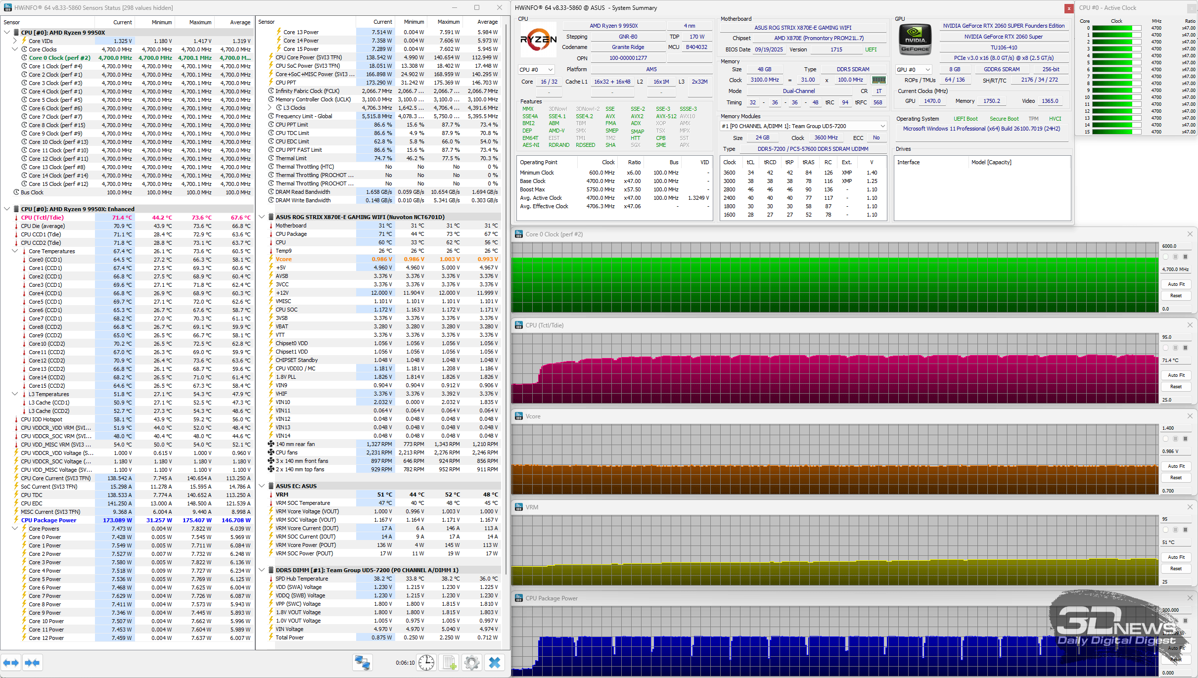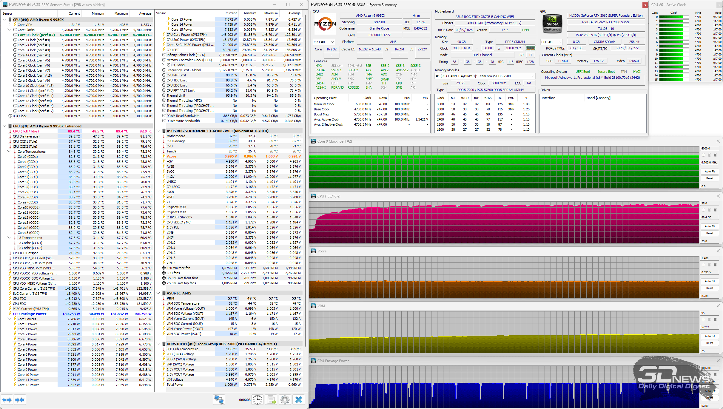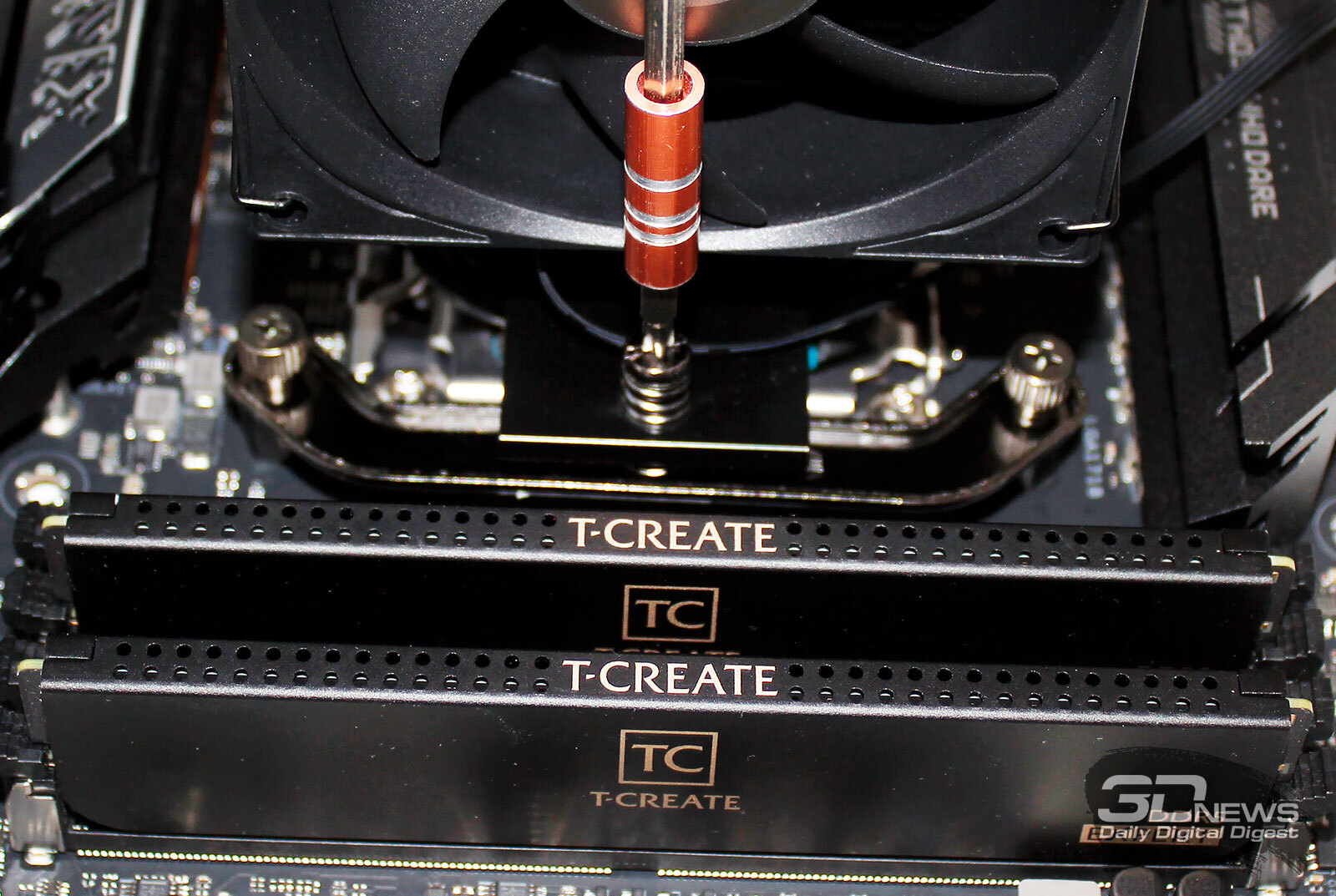 Для получения стабильных и объективно сопоставимых друг с другом результатов основные параметры процессора были зафиксированы в следующих значениях: частота BCLK – 100 МГц, множитель ядер – 47, частота – 4,7 ГГц, напряжение Vcore – 1,0 В. В BIOS материнской платы Asus был выставлен восьмой (максимальный) уровень стабилизации напряжения на ядре процессора (CPU load-line calibration). По данным HWiNFO64, уровень тепловыделения процессора с такими настройками достигал отметки 180 ватт, что как раз является спецификационным пределом для маленького PCCooler R400. Эффективная частота оперативной памяти была зафиксирована на отметке 6,2 ГГц при напряжениях 1,260/1,260 В (VDD/VDDQ), а её основные тайминги фиксировались в значениях 32-36-36-48 CR1 с дополнительной подстройкой вторичных и третичных таймингов. Напряжение VSOC в этом тестировании фиксировалось на уровне 1,175 В. Частота коммуникационной шины Infinity Fabric (FCLK) была установлена на отметке 2,066 ГГц. Тестирование было проведено в операционной системе Microsoft Windows 11 Pro версии 24H2 (26100.7019). Программное обеспечение, использованное для теста: