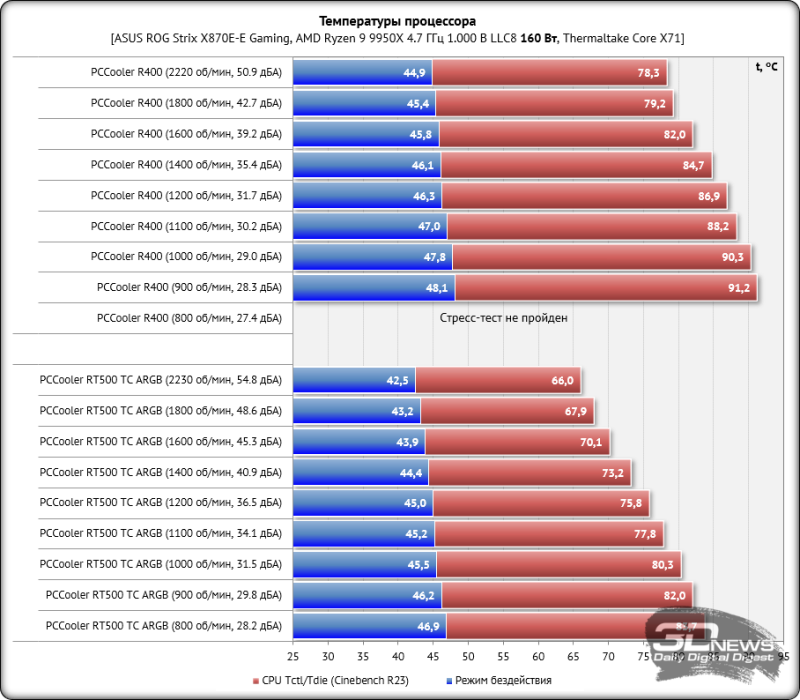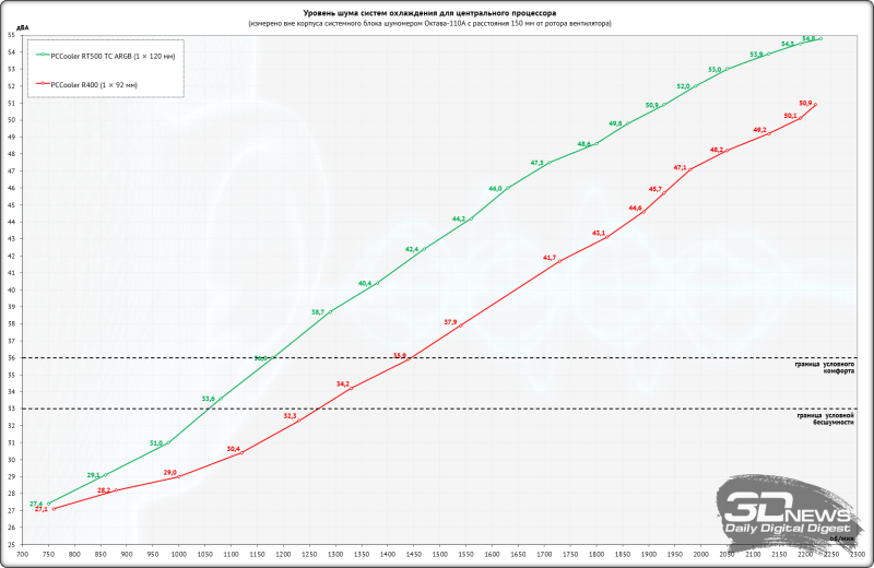 Нагрузка на процессор создавалась двумя последовательными циклами Cinebench R23. На стабилизацию температуры CPU между циклами отводилось по 10 минут. За окончательный результат, который вы увидите на диаграмме, принята максимальная температура по датчику Tdie в пике нагрузки и в режиме простоя с учётом корректировки на дельту температуры окружения. Температура в помещении контролировалась установленным рядом с системным блоком электронным термометром с точностью измерений 0,1 °C и с возможностью почасового мониторинга изменения температуры в помещении за последние 6 часов. Во время данного тестирования температура колебалась в диапазоне 23,9–24,4 °C (дельта учитывалась в результатах). Измерение уровня шума систем охлаждения проводилось электронным шумомером «ОКТАВА-110А» в период от ноля до трёх часов ночи в полностью закрытой комнате площадью около 20 м2. Уровень шума измерялся вне корпуса системного блока, когда источником шума в помещении являлась только система охлаждения и её вентилятор(ы). Шумомер, зафиксированный на штативе, всегда располагался строго в одной точке на расстоянии ровно 150 мм от ротора вентилятора. Системы охлаждения размещались на самом углу стола на подложке из вспененного полиэтилена. Нижняя граница измерений шумомера составляет 22 дБА, а субъективно-комфортный (просьба не путать с низким!) уровень шума систем охлаждения при измерениях с такого расстояния находится около отметки 36 дБА. За условно-низкий уровень шума мы принимаем значение 33 дБА. Для оценки эффективности PCCooler R400 мы взяли не столько соперника, сколько следующую модель по классу, которую недавно тестировали – PCCooler RT500 TC ARGB. Напомним, что это кулер на 5 тепловых трубках с 120-мм вентилятором, который стоит дороже R400 всего на 600 рублей. Теперь сразу перейдём к результатам и их анализу. ⇡#Результаты тестов и их анализ⇡#Эффективность охлажденияСначала мы продемонстрируем не привычную диаграмму с таблицей, а два скриншота с полными данными мониторинга в нагрузке с кулерами PCCooler R400 и PCCooler RT500 TC ARGB. Фиксируем, что на максимальных оборотах своего вентилятора PCCooler R400 справился с нагрузкой вплоть до 182 ватт (по данным HWiNFO64) и это, пожалуй, весьма впечатляющий результат для такого компактного кулера с очень маленькой площадью радиатора. Максимальная температура достигла отметки 89,4 градуса Цельсия. В то же время, стандартный 120-мм кулер PCCooler RT500 TC ARGB выполняет ту же самую работу, выигрывая по температурам аж 11,3 градуса Цельсия в пике нагрузки! Разница попросту огромная, особенно если учесть, что цены этих кулеров различаются не более чем на стоимость одного обеда. Далее для того, чтобы всё же протестировать маленький PCCooler R400 во всём скоростном диапазоне его 92-мм вентилятора, нам пришлось ограничить TDP процессора отметкой 160 ватт, получив следующие результаты. Итак, даже при таком скромном по современным меркам тепловыделении процессора PCCooler R400 уступил своему старшему брату от 10 градусов Цельсия в каждом скоростном режиме работы вентиляторов, а максимальное отставание достигает 12,3 градуса Цельсия в пике нагрузки. Даже разница в уровне шума, которая в пользу R400, не перекрывает столь существенные отличия по температурам. Собственно, если в корпус входит 120-мм кулер высотой не многим более 150 мм, то вопроса выбора между R400 и RT500 не должно стоять в принципе. В против