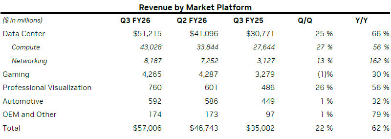 Игровой сегмент показал рост выручки на 30 % в годовом сравнении до $4,3 млрд (всего 7,5 % от всей выручки), но последовательно она снизилась на 1 %. Такая коррекция, по словам финансового директора Nvidia, обусловлена выходом складских запасов на более близкий к норме уровень в ожидании сезона предпраздничных распродаж. В годовом сравнении игровая выручка выросла преимущественно за счёт высокой популярности семейства Blackwell.