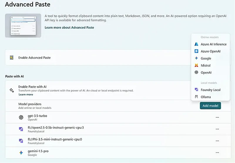 Параллельно с добавлением локального искусственного интеллекта, разработчики наделили Advanced Paste совместимостью с рядом других онлайн-моделей, включая Azure OpenAI, Gemini и Mistral, тогда как ранее инструмент поддерживал только OpenAI. Также в интерфейс Advanced Paste были внесены визуальные улучшения: теперь в нём отображается текущее содержимое буфера обмена и добавлено раскрывающееся меню для выбора нужной ИИ-модели.