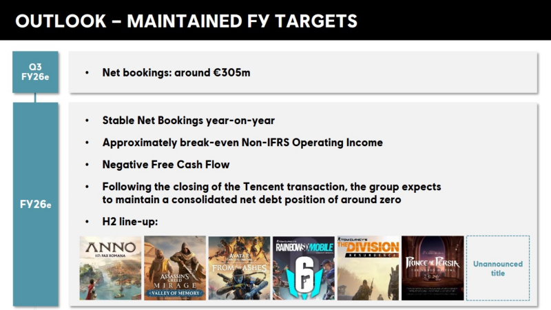В новом финансовом отчёте Ubisoft упомянула, что в первом квартале 2026 года (то есть до конца марта) планирует выпуск четырёх игр: ремейка Prince of Persia: The Sands of Time, Rainbow Six Mobile, The Division Resurgence и некой неанонсированной.