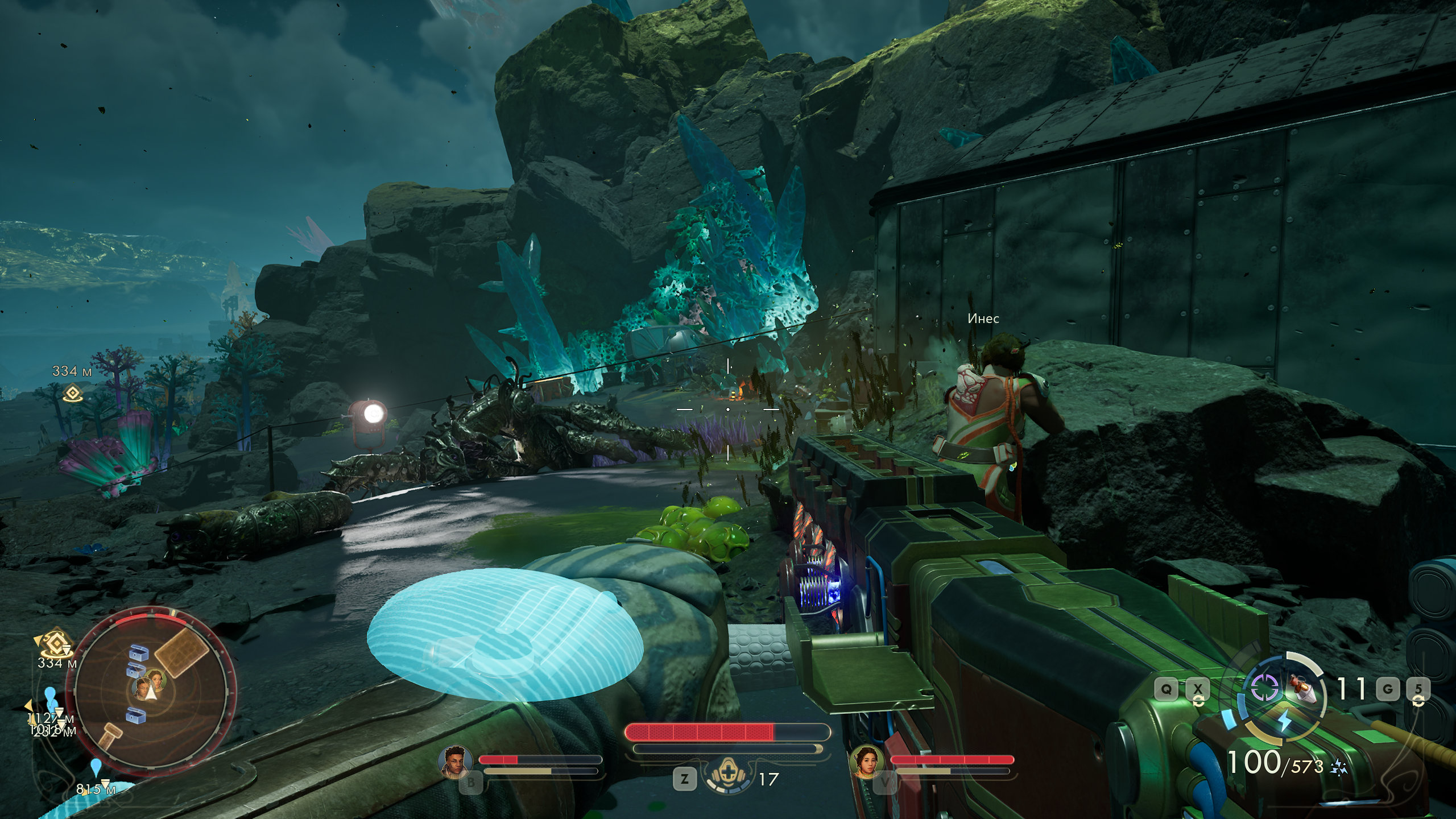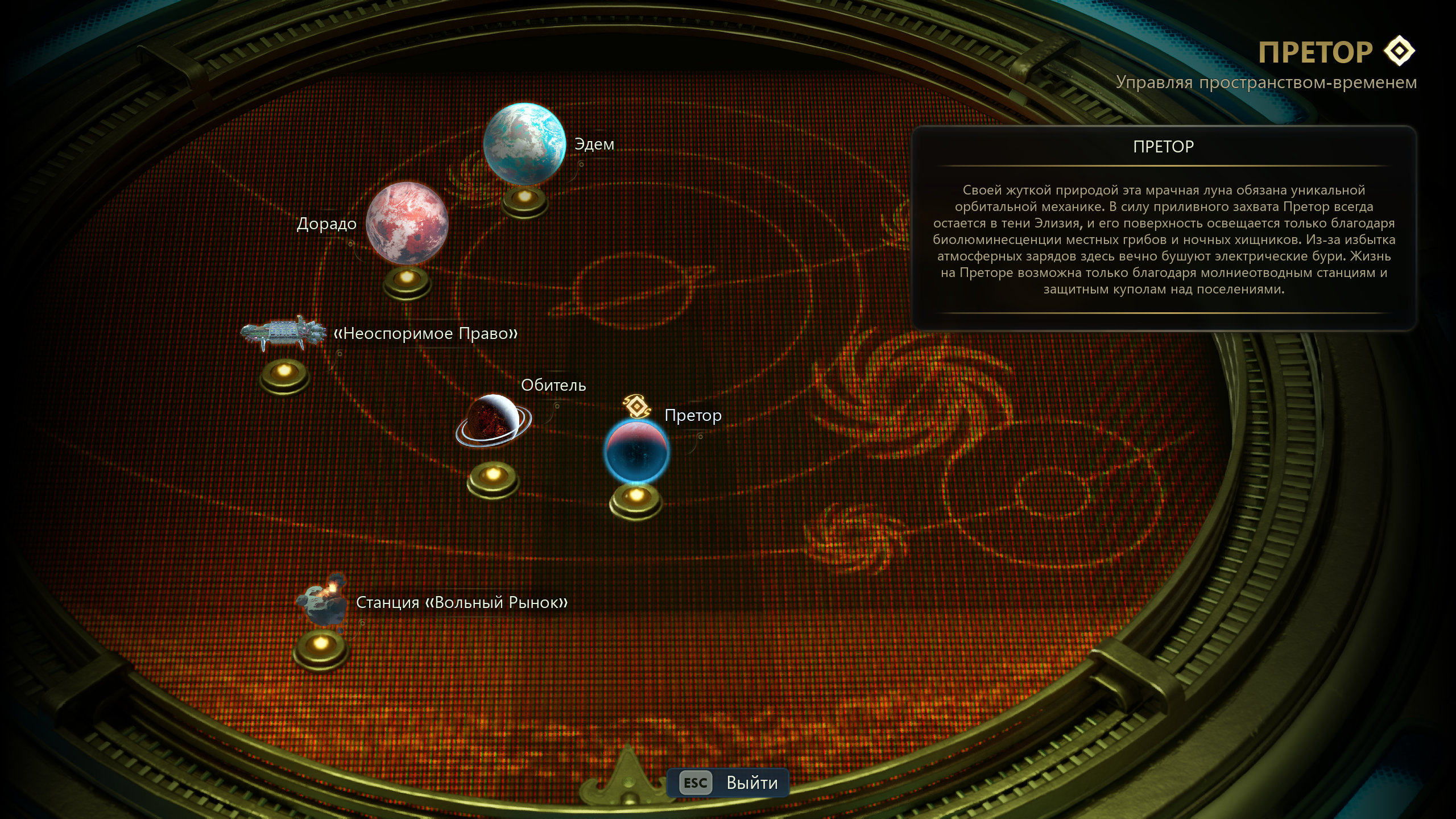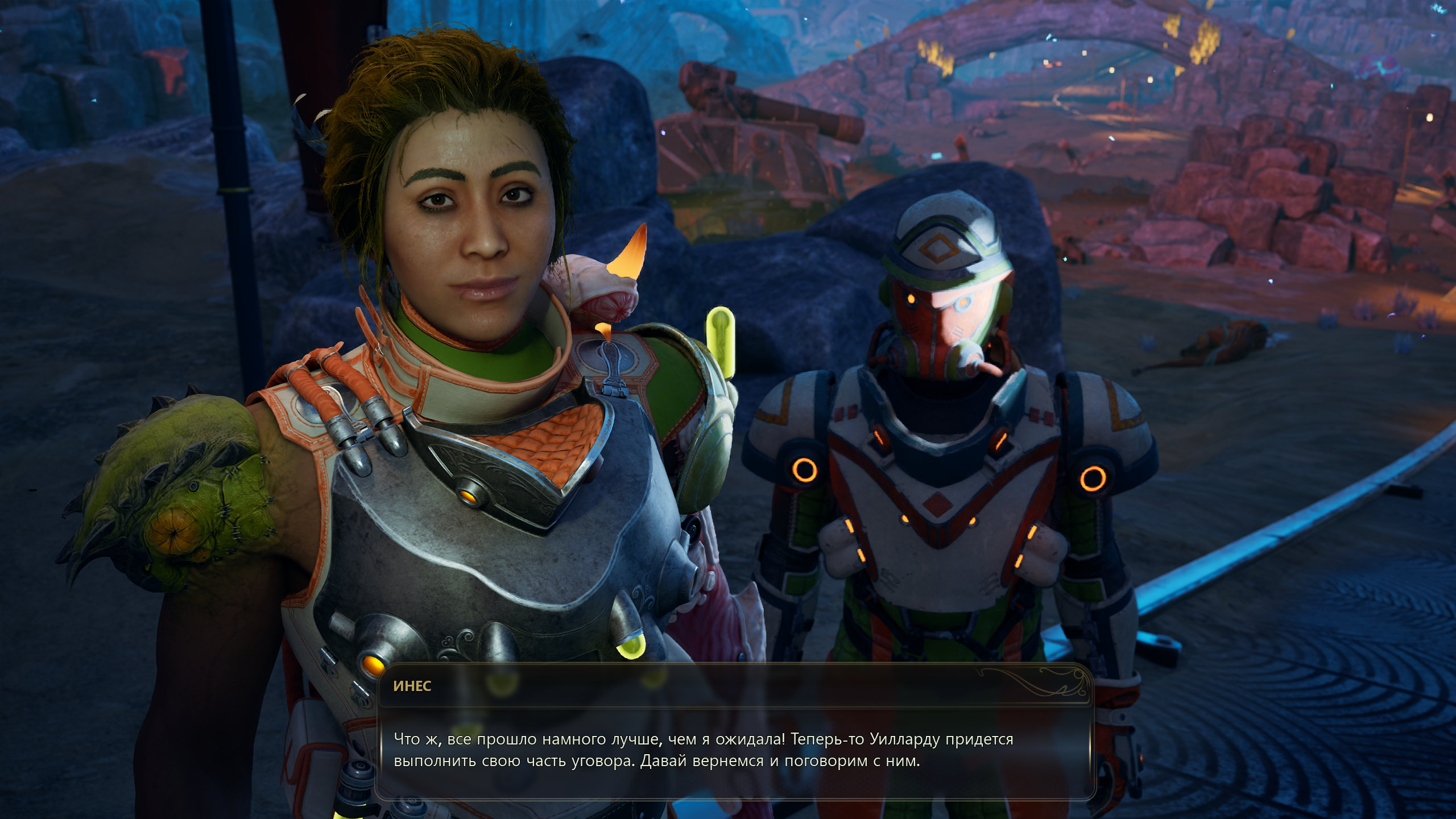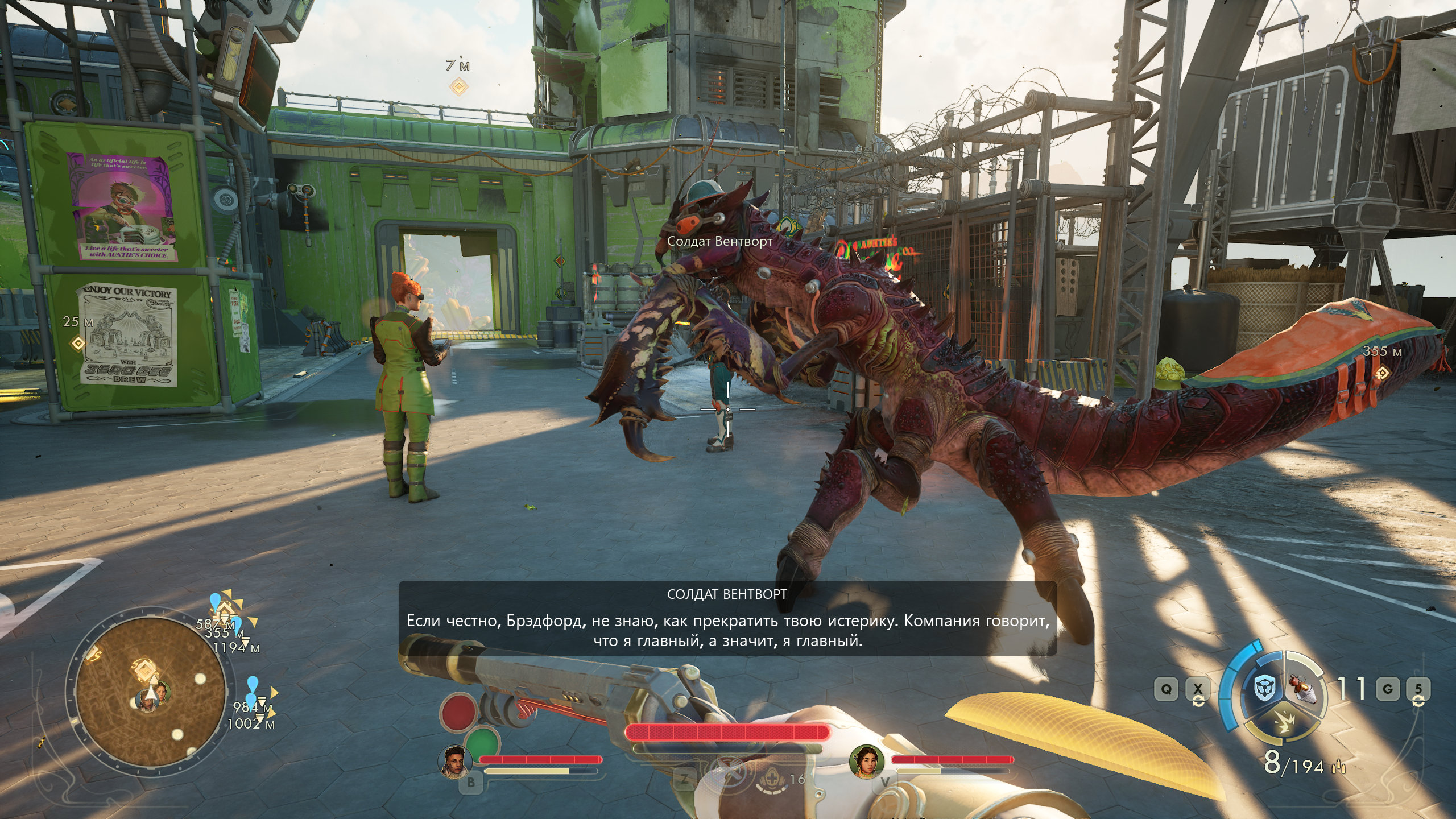 Вы получите устройство, которое поможет использовать аномалии для достижения новых мест. Такой вот элемент метроидвании ⇡#Капитализм. Капитализм никогда не меняетсяОсновная история начинается с поиска предателя, из-за которого миссия на «Горизонте» пошла наперекосяк. Инструментов в нашем распоряжении немного — космический корабль «Инкогнито» да верный напарник Найлз, который и спас протагониста из ледяного сна. Как и первая часть, структурно The Outer Worlds 2 состоит из путешествий по нескольким планетам и станциям. Первая остановка на пути — тропический Эдем. К счастью, разработчики не погнались за трендом на генерацию локаций. Каждый мир представляет собой обширную, но ограниченную зону для исследований. Общая территория заметно увеличилась по сравнению с предшественницей, но не скатилась в масштабы ради масштабов. На каждой планете найдется по одному-два населенных пункта, где обосновалась одна из фракций, и с десяток-другой точек интереса. The Outer Worlds 2 умело подталкивает к изучению окрестностей. С одной стороны, она не заваливает иконками. Взгляд зацепился за что-то интересное — пошли и проверили. При этом на карте заранее выделены все строения. Если где-то за перевалом стоит одинокая лачуга — это будет заметно. Но никаких навязчивых стрелок, маркеров и счетчика процентов неисследованных зон. Идите куда хотите. Если, конечно, сможете совладать с агрессивной фауной — автоматической подстройки уровня врагов нет.