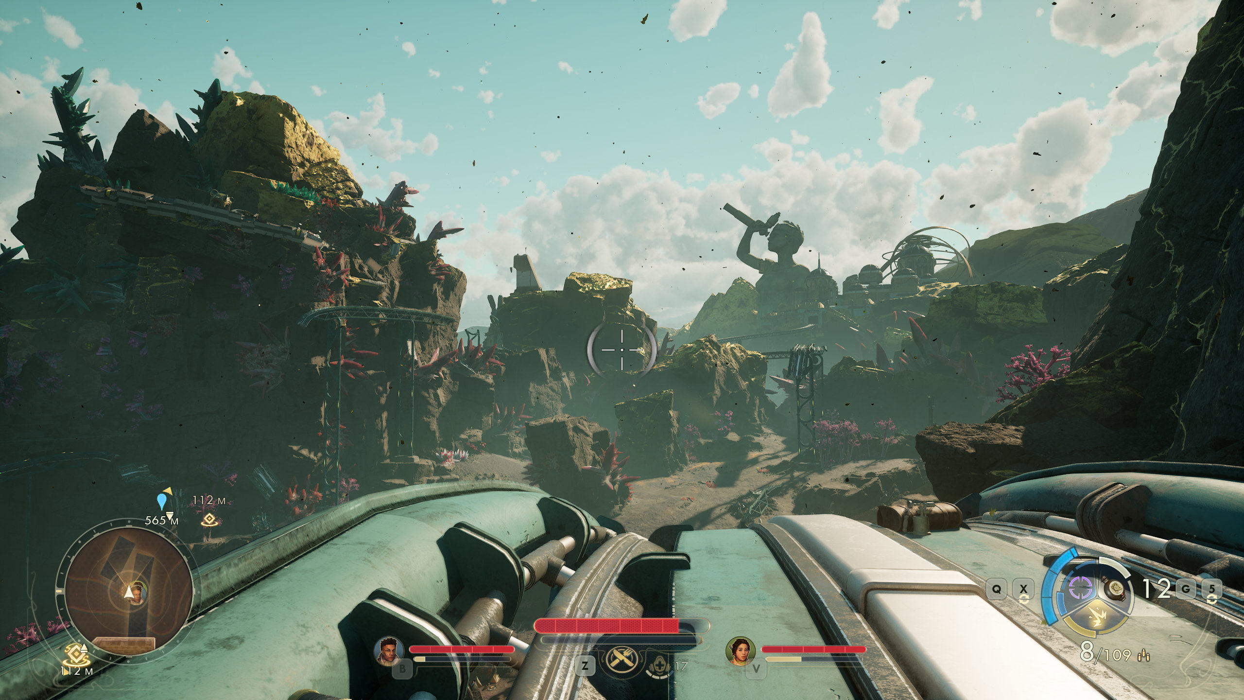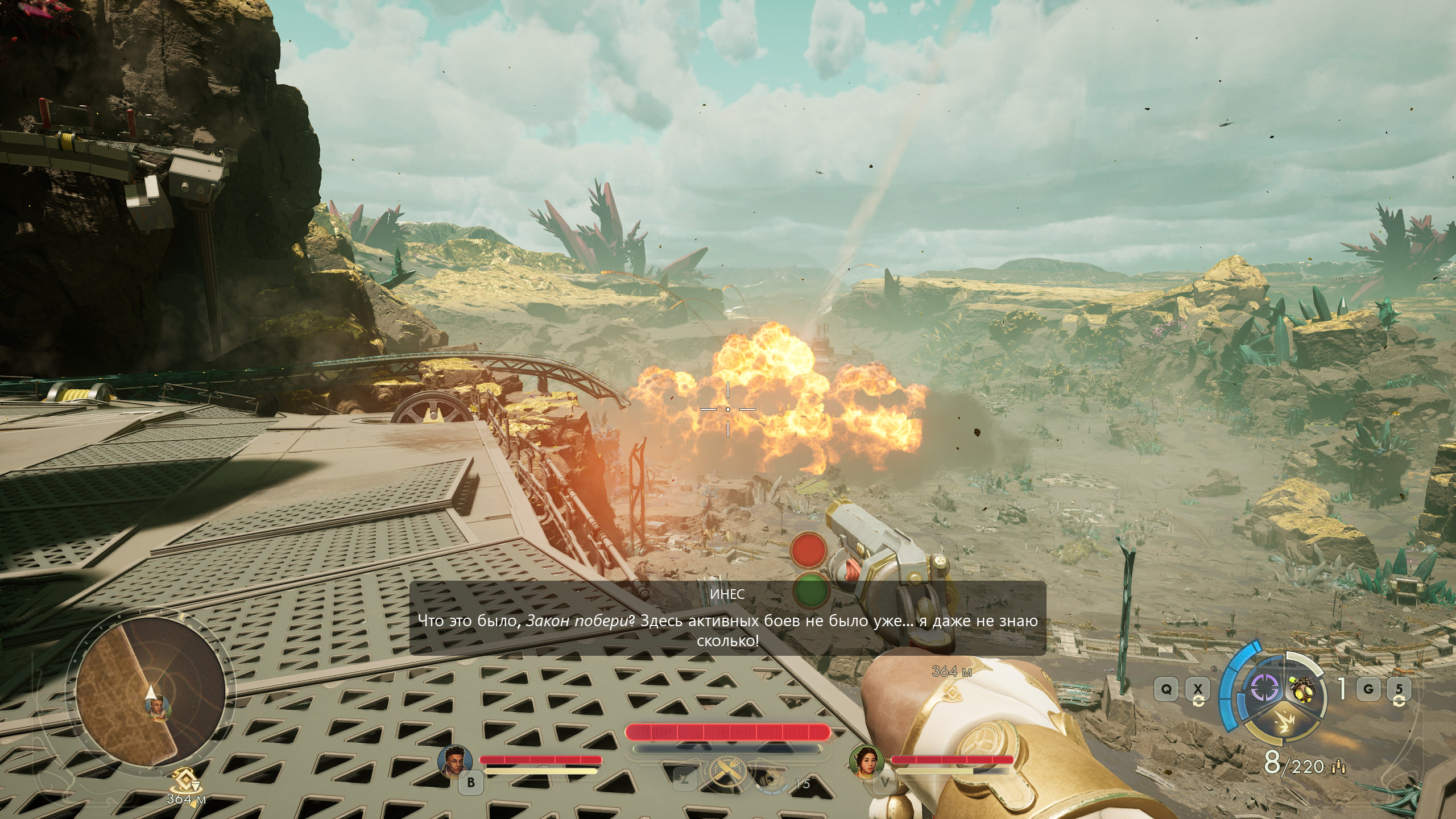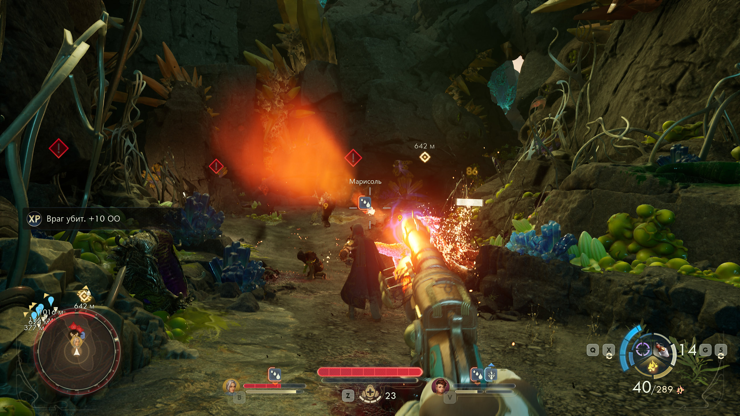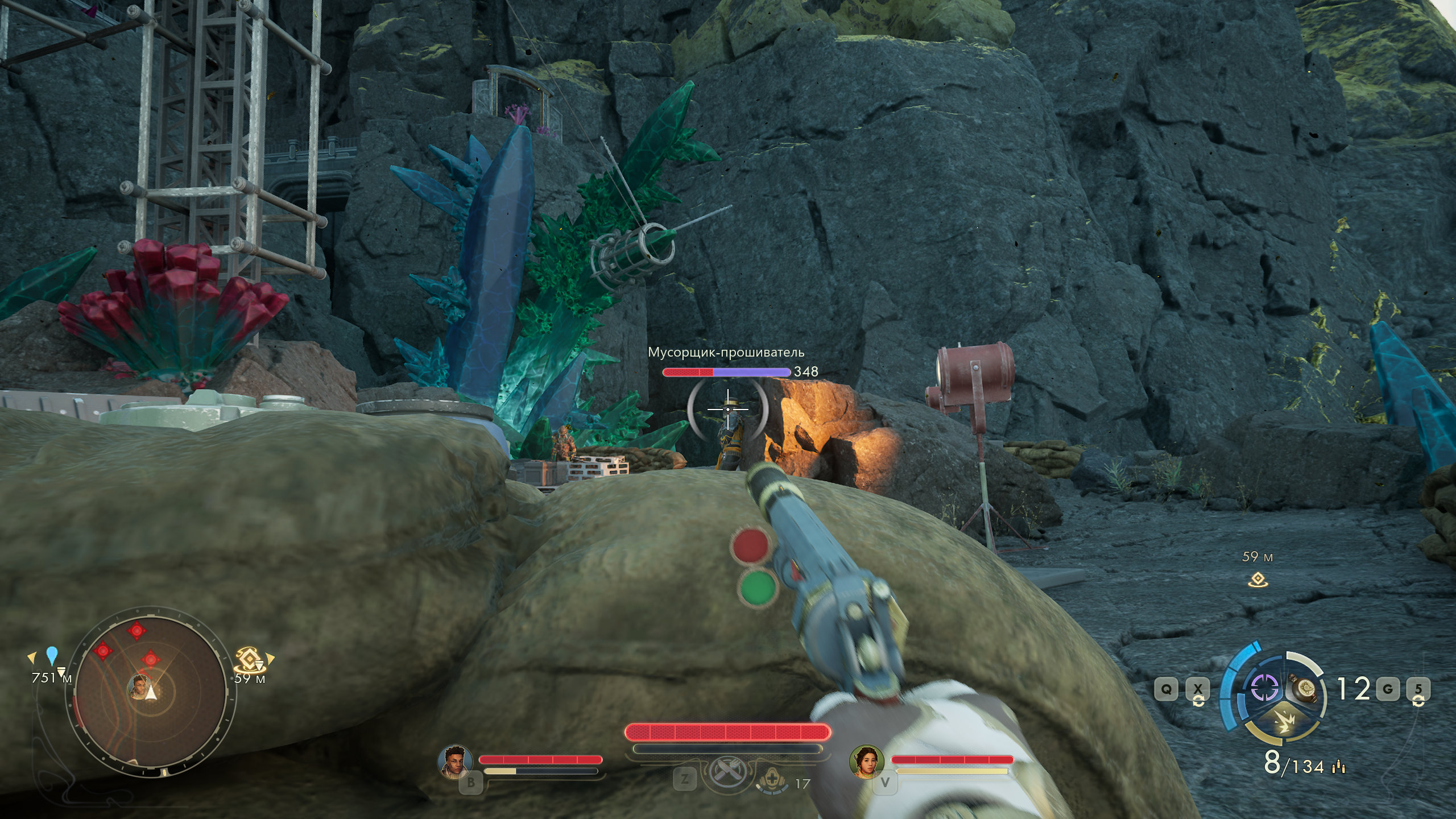 Вы получите устройство, которое поможет использовать аномалии для достижения новых мест. Такой вот элемент метроидвании ⇡#Капитализм. Капитализм никогда не меняетсяОсновная история начинается с поиска предателя, из-за которого миссия на «Горизонте» пошла наперекосяк. Инструментов в нашем распоряжении немного — космический корабль «Инкогнито» да верный напарник Найлз, который и спас протагониста из ледяного сна. Как и первая часть, структурно The Outer Worlds 2 состоит из путешествий по нескольким планетам и станциям. Первая остановка на пути — тропический Эдем. К счастью, разработчики не погнались за трендом на генерацию локаций. Каждый мир представляет собой обширную, но ограниченную зону для исследований. Общая территория заметно увеличилась по сравнению с предшественницей, но не скатилась в масштабы ради масштабов. На каждой планете найдется по одному-два населенных пункта, где обосновалась одна из фракций, и с десяток-другой точек интереса. The Outer Worlds 2 умело подталкивает к изучению окрестностей. С одной стороны, она не заваливает иконками. Взгляд зацепился за что-то интересное — пошли и проверили. При этом на карте заранее выделены все строения. Если где-то за перевалом стоит одинокая лачуга — это будет заметно. Но никаких навязчивых стрелок, маркеров и счетчика процентов неисследованных зон. Идите куда хотите. Если, конечно, сможете совладать с агрессивной фауной — автоматической подстройки уровня врагов нет.