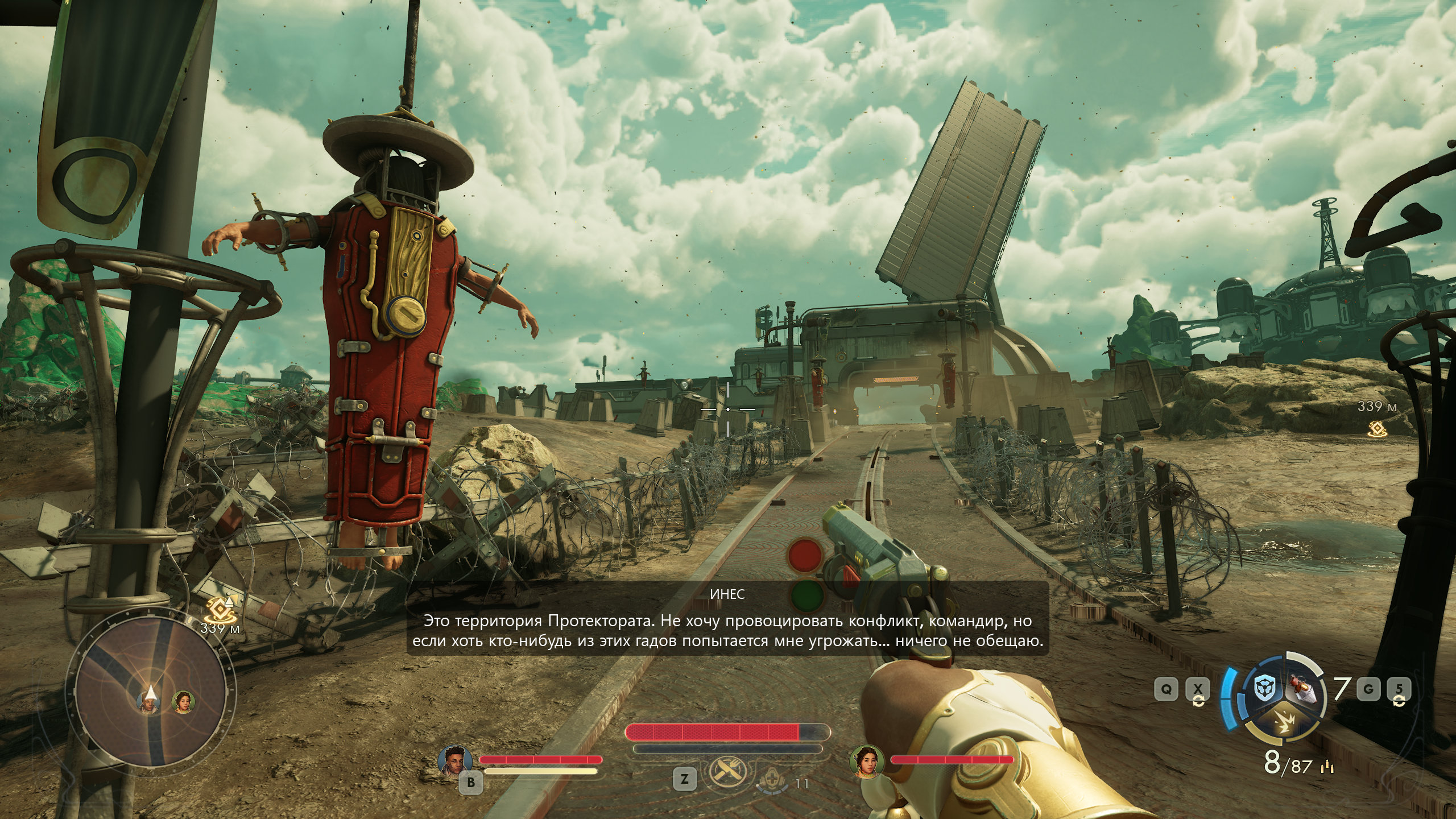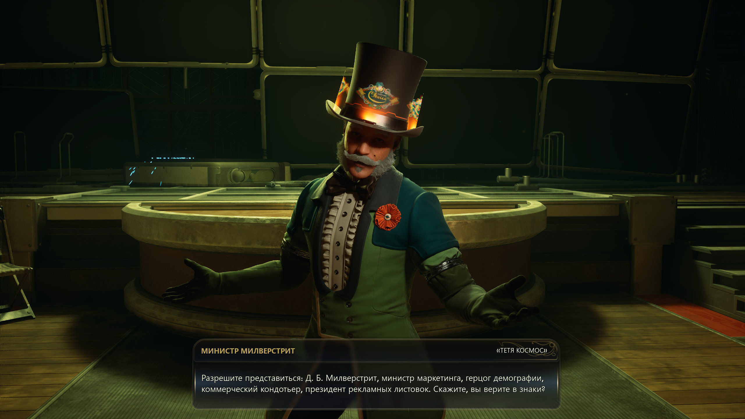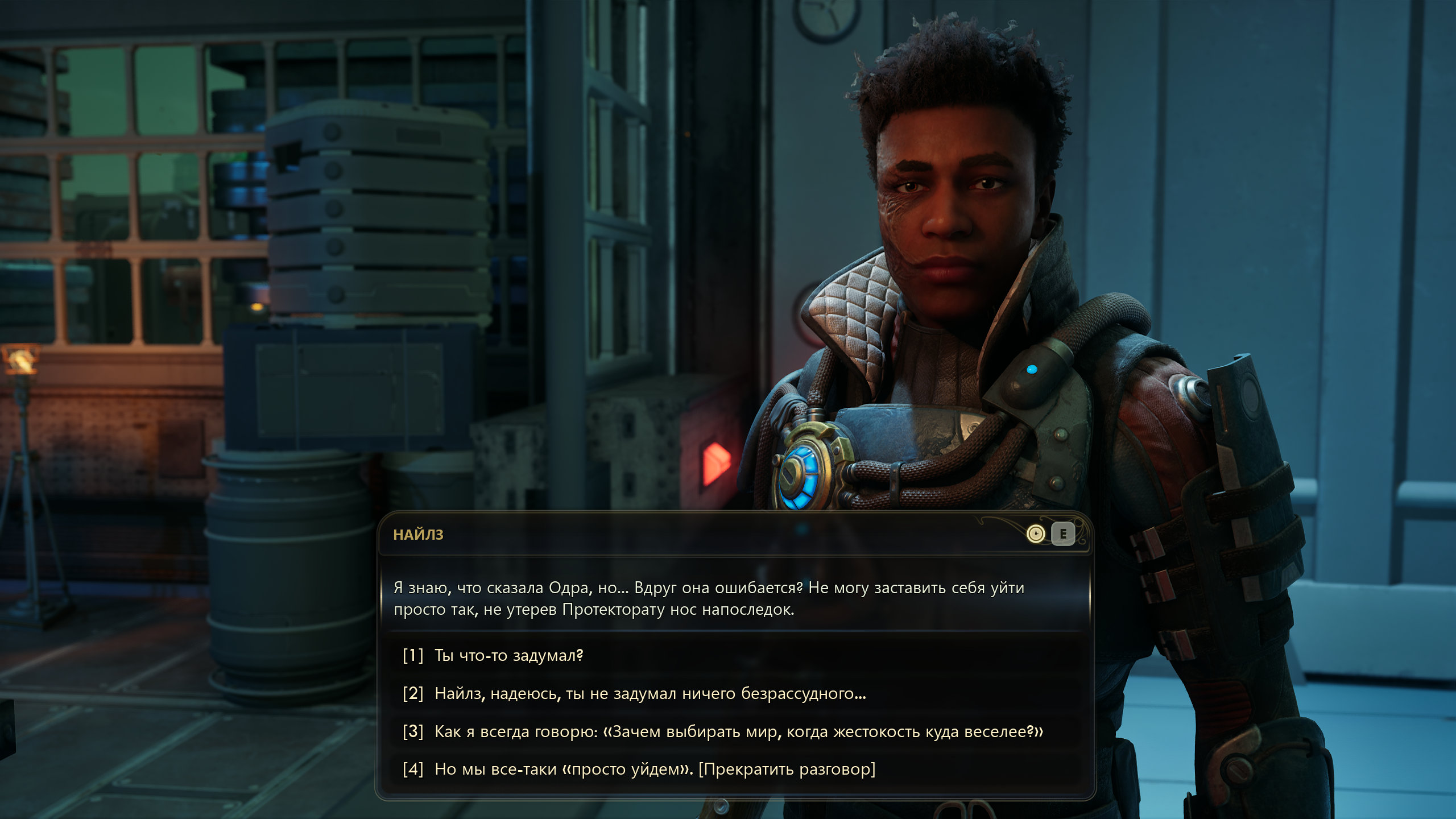 Всех боссов можно уболтать на мирное решение. И да, в локализации постоянно лезет техническая разметка Первая The Outer Worlds была очень щедра на очки развития. Вы легко могли быть мастером на все руки большую часть прохождения: заболтать кого угодно, взломать любой замок и обойти любую систему защиты. Лишь к финалу приходилось принимать более осознанное решение, какие таланты довести до совершенства. В сиквеле ваш выбор в прокачке имеет куда больший вес. За тридцать уровней вы получите лишь шестьдесят очков навыков. Напомню, их полтора десятка, и каждый развивается до двадцати пунктов. То есть до максимума можно довести лишь три умения, и то если вы напрочь проигнорируете остальные. Погонитесь за всем — окажетесь мастером ничего. В первой же миссии авторы показывают, что у проблем всегда несколько решений. Секретное задание на космической станции «Горизонт» может обернуться как шпионской вылазкой, так и залихватским шутером. По итогу вступления игра позволит первый и последний раз изменить сделанный выбор в развитии героя. Поэтому стоит сразу решить, кем вы хотите стать в этой звездной системе. А затем взрыв. Десять лет в анабиозе. Чудесное спасение. И вот вы открываете глаза, а в Аркадии уже бушует война Протектората и корпорации «Тетя Космос». The Outer Worlds 2 все еще посмеивается над корпоративным миром и бюрократией. Только делает это чуть менее нарочито, и заодно затрагивает вопросы общественного строя, ожидаемо сталкивая капитализм и социализм. Сиквел буквально на полтона серьезнее предшественницы, что ощущается более органично. Но сложное лицо игра не делает — самоиронии по-прежнему в избытке.