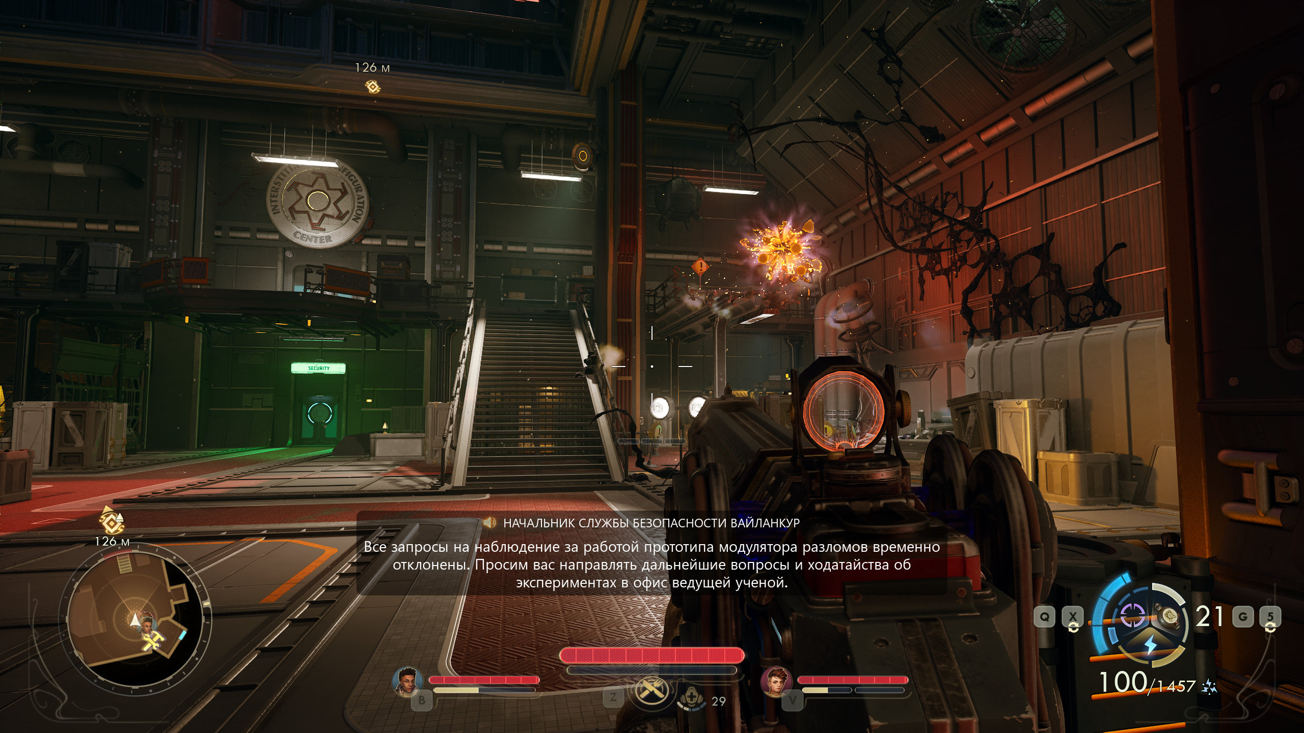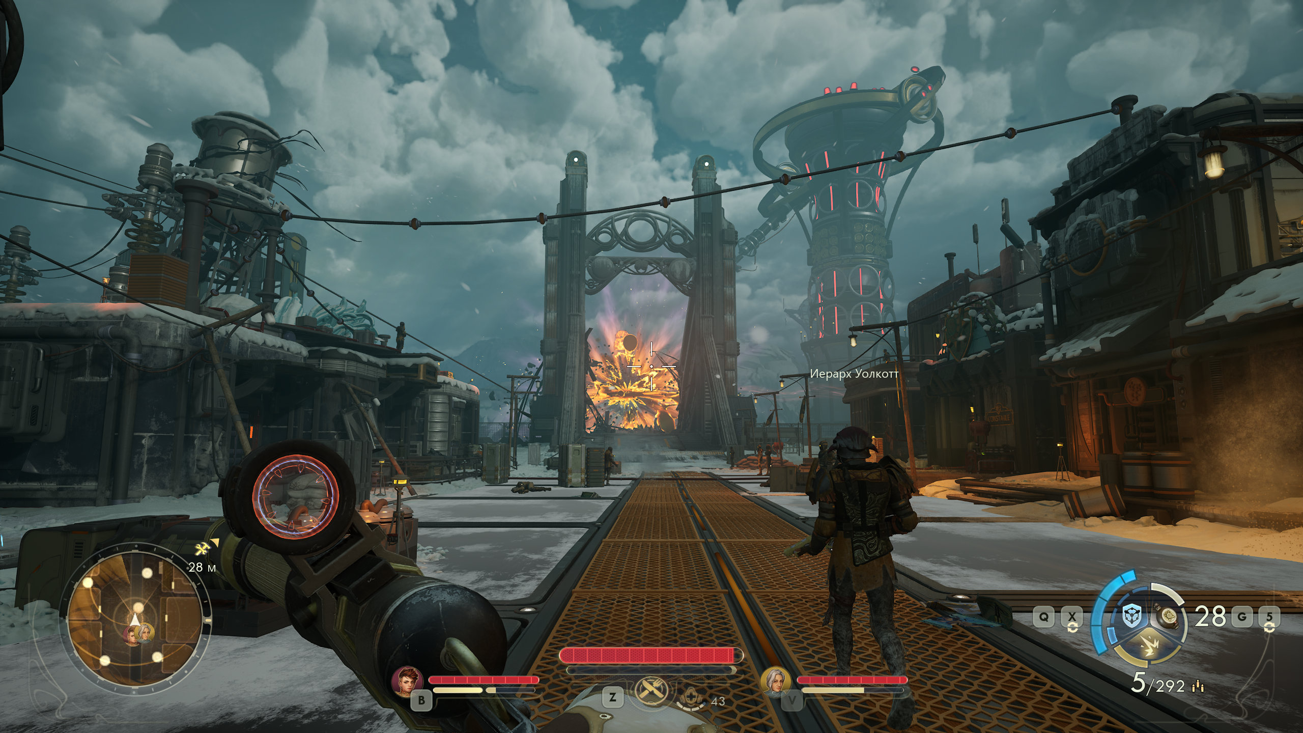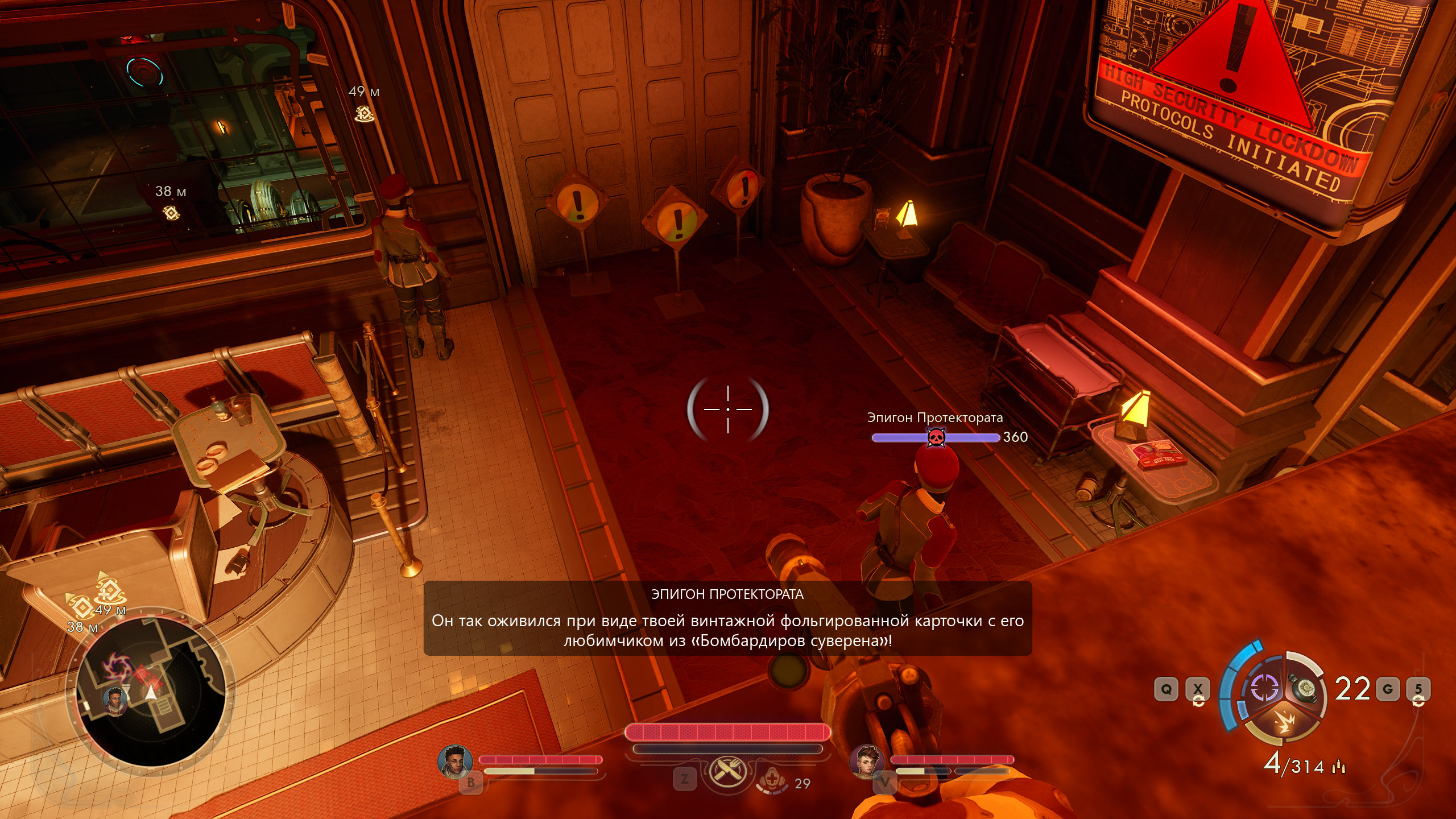 Всех боссов можно уболтать на мирное решение. И да, в локализации постоянно лезет техническая разметка Первая The Outer Worlds была очень щедра на очки развития. Вы легко могли быть мастером на все руки большую часть прохождения: заболтать кого угодно, взломать любой замок и обойти любую систему защиты. Лишь к финалу приходилось принимать более осознанное решение, какие таланты довести до совершенства. В сиквеле ваш выбор в прокачке имеет куда больший вес. За тридцать уровней вы получите лишь шестьдесят очков навыков. Напомню, их полтора десятка, и каждый развивается до двадцати пунктов. То есть до максимума можно довести лишь три умения, и то если вы напрочь проигнорируете остальные. Погонитесь за всем — окажетесь мастером ничего. В первой же миссии авторы показывают, что у проблем всегда несколько решений. Секретное задание на космической станции «Горизонт» может обернуться как шпионской вылазкой, так и залихватским шутером. По итогу вступления игра позволит первый и последний раз изменить сделанный выбор в развитии героя. Поэтому стоит сразу решить, кем вы хотите стать в этой звездной системе. А затем взрыв. Десять лет в анабиозе. Чудесное спасение. И вот вы открываете глаза, а в Аркадии уже бушует война Протектората и корпорации «Тетя Космос». The Outer Worlds 2 все еще посмеивается над корпоративным миром и бюрократией. Только делает это чуть менее нарочито, и заодно затрагивает вопросы общественного строя, ожидаемо сталкивая капитализм и социализм. Сиквел буквально на полтона серьезнее предшественницы, что ощущается более органично. Но сложное лицо игра не делает — самоиронии по-прежнему в избытке.