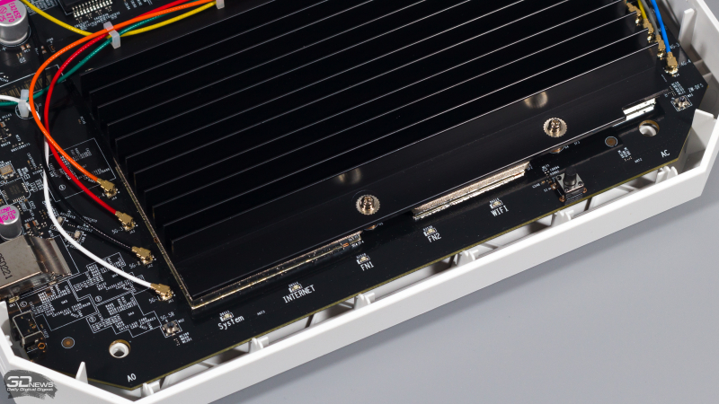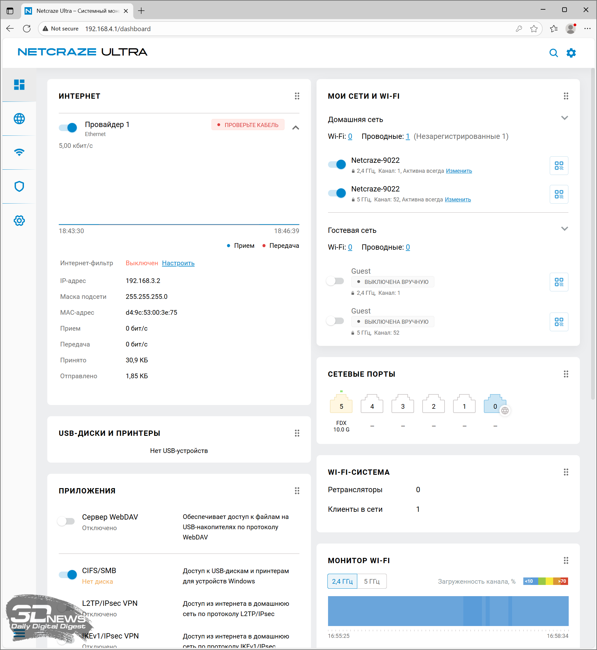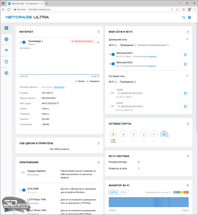 Герой обзора продается в официальном интернет-магазине Netcraze за сумму 19 990 руб., которая уже заставит задуматься большинство покупателей SOHO-маршрутизатора. А вы еще спрашиваете: «Где 320 МГц?». На устройство распространяется четырехлетняя гарантия производителя и по традиции долгосрочная поддержка обновления прошивок. ⇡#КонструкцияНа вид Netcraze Ultra легко перепутать с моделью Keenetic Giga KN-1012, которую мы рассматривали в начале года. Новинку выдает только сменившийся логотип вендора. Верхняя часть корпуса имеет обильную перфорацию для пассивного охлаждения внутренностей устройства. Назначение большой кнопки со значком беспроводной сети выбирает пользователь: по умолчанию она активирует WPS, но может выполнять и другие функции — вплоть до трех сразу в зависимости от длительности нажатия. В отличие от Keenetic Giga, новый флагман не имеет порта SFP+, его заменил «медный» порт 10GbE (оранжевого цвета). Это к лучшему, ведь мультигигабитные трансиверы под витую пару — дорогое удовольствие, а «оптика» или DAC в домашней сети нужны немногим. Из остальных портов синий поддерживает 2.5GbE, а четыре серых — по гигабиту. Примечательно, что любой из портов можно использовать для WAN-соединения. Реализована и попарная агрегация гигабитных портов. Каждый порт имеет собственные индикаторы состояния. Антенны у «Ультры» несъемные, они поворачиваются на угол до 180° и отклоняются от корпуса на 90°. Каждая из антенн — это на самом деле две в общем корпусе, что и дает формулу MIMO 4×4:4. Большая часть нижней панели также пронизана вентиляционными отверстиями. Устройство стоит на цепких силиконовых ножках, но допускает и настенный монтаж, причем в любом положении: антеннами вверх или вниз. На левом боку корпуса находятся два порта USB версий 2.0 и 3.2 Gen 1 (USB 3.0), а соседние кнопки размонтируют подключенные устройства (но их функции также можно переопределить в настройках ОС). К маршрутизатору прилагается крупный блок питания мощностью 36 Вт с бочковым штекером и плоский патч-корд Cat6 длиной 1,5 м. Печатная плата Netcraze Ultra с двух сторон накрыта большими теплорассеивателями. На открытых участках текстолита бросаются в глаза два разъема U.FL, к которым не подключены пигтейлы внешних антенн. Но если присмотреться внимательнее, то можно заметить, что от этих разъемов отходят интегрированные антенны в виде дорожек PCB. Одна из них принадлежит baseband-чипу MT7975N и обслуживает функцию DFS (обнаружения радаров) в диапазоне 5 ГГц без прерывания работы основного передатчика. Впрочем, по российскому законодательству DFS не требуется, и в местной версии Netcraze Ultra эта функция отключена. Вторая внутренняя антенна привязана к чипу MT7977BN для реализации одной из «фишек» платформы MediaTek Filogic под названием MRC (Multiple Receive Combining) и работает на прием. Получается, что в сумме у новинки целых десять антенн. Внешние антенны диапазона 2,4 ГГц подключены напрямую к MT7975N, а сигнал 5 ГГц пропущен через чипы eFEM, что должно положительно отразиться на соотношении «сигнал—шум». Что касается проводной сети, то все порты RJ45 защищены гальванической развязкой на основе трансформаторов. ⇡#Программное обеспечениеКакой бы замечательной ни была аппаратная начинка маршрутизатора, не меньшее, а, пожалуй, и большее значение имеет софт. Читатели уже хорошо знакомы с фирменной операционной системой KeeneticOS, а кто-то помнит, что раньше она называлас