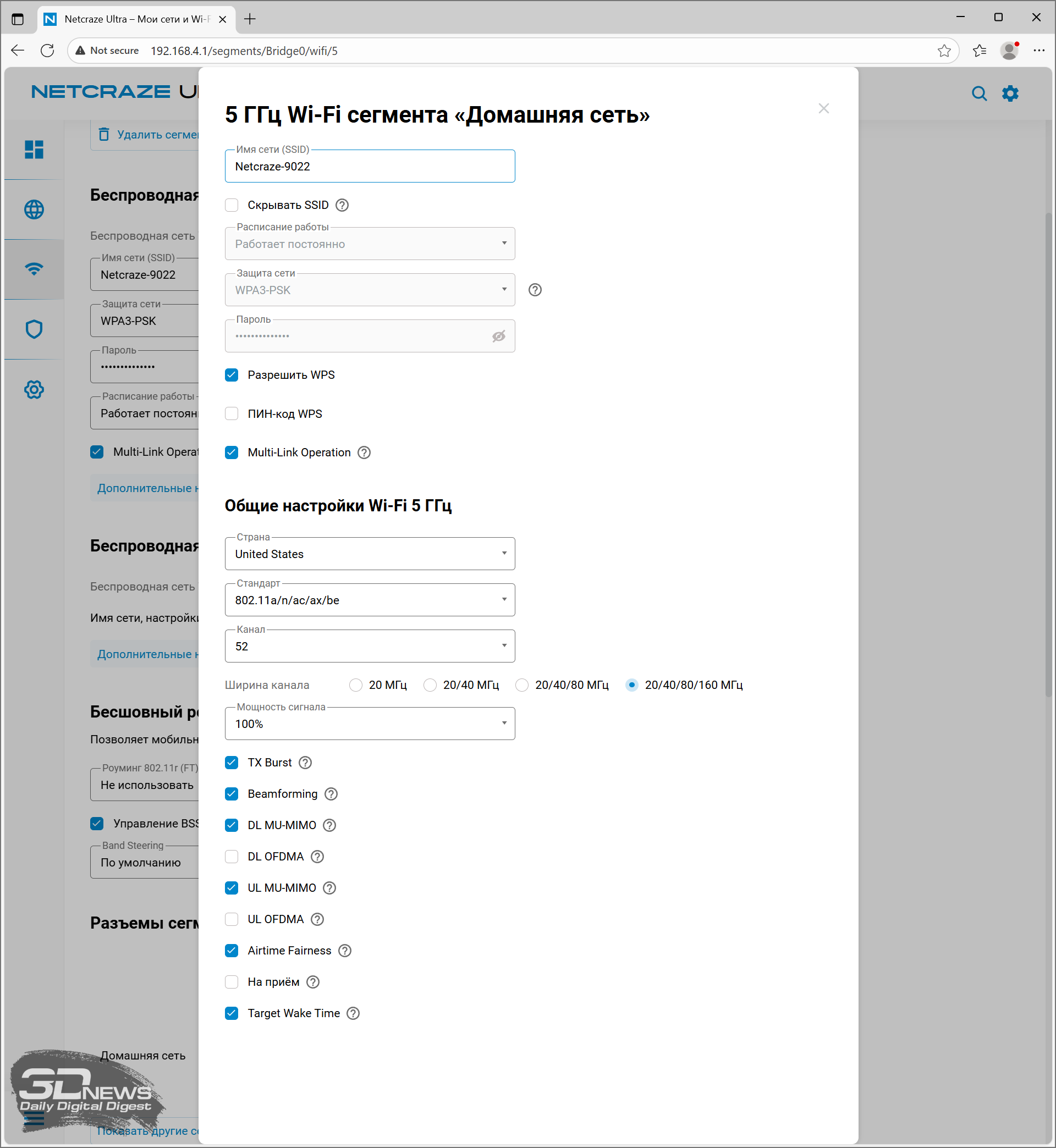 Что касается работы Netcraze Ultra в качестве коммутатора, то у нас не было возможности занять все порты отдельными клиентами и устроить стресс-тест, но и на практике редкие владельцы новинки смогут создать ситуацию, которая насытит порт 10GbE. ⇡#Результаты тестирования: Wi-FiТестирование беспроводной сети выполнено на той же платформе, только под управлением Windows 11 24H2. В качестве беспроводного NIC использовался Qualcomm NCM865 с антеннами Taoglas GW.52.A153. Проводное соединение тестового стенда с маршрутизатором выполнено через порт 10GbE. Тестовый стенд находился в прямой видимости на расстоянии 2 м от подопытного устройства. Мощность передатчиков — максимальная, стандарт безопасности Wi-Fi — WPA3. Для точки доступа 5 ГГц из каналов от 32-го до 64-го был выбран 52-й как самый чистый от соседских сетей. Каналы 132 и выше не рассматривались, т.к. они не позволяют сформировать единую полосу пропускания 160 МГц в российском диапазоне. Большинство владельцев Netcraze Ultra будут подключаться к точке доступа по стандарту Wi-Fi 6. В таком режиме пропускная способность достигает внушительных 2 Гбит/с на короткой дистанции. Налицо явный перевес в направлении от клиента к маршрутизатору, но тут многое зависит от конкретного беспроводного адаптера. Снижение мощности передатчика в данном случае не дало положительных результатов. Что касается Wi-Fi 7, то подружить домашнее оборудование с этим стандартом оказалось ненамного проще, чем год назад. Даже Qualcomm NCM865, самый всеядный и полнофункциональный (а значит и самый дорогостоящий) из потребительских NIC с поддержкой Wi-Fi 7, под управлением драйвера последней версии 3.1.0.1486 поначалу отказался выбрать режим 802.11be. При этом be можно форсировать через окно свойств драйвера в «диспетчере устройств», но возникает другая проблема: в таком случае пропускная полоса сжимается до 40 МГц. Помогла только смена кода страны точки доступа с России на США, хотя нет никакой уверенности, что дело именно в региональных ограничениях драйвера: следующие попытки установить соединение все равно периодически откатывались до стандарта 802.11ax. Из-за того, что процесс согласования версии Wi-Fi совершенно непрозрачен для рядового пользователя, наладка деградирует до слепой манипуляции всеми доступными переменными (упомянутый код страны, номер канала, версия драйвера NIC и т.д.) в надежде, что что-то сработает. Когда согласовать режим 802.11be между Netcraze Ultra и NCM865 все-таки удалось, окно настроек Wi-Fi в Windows отчиталось о повышенной канальной скорости за счет модуляции 4096-QAM, однако скорость передачи данных от точки доступа к клиенту практически не изменилась по сравнению с результатами в ax-режиме. Так и должно быть, ведь модуляцию 4096-QAM трудно поймать даже на коротком расстоянии между устройствами, а иных преимуществ в диапазоне 5 ГГц у Wi-Fi 7 нет. В обратном направлении (от клиента к точке доступа) скорость неожиданно снизилась, но объявить виновником именно маршрутизатор было бы преждевременно: судя по прошлому опыту работы с этим адаптером, программное обеспечение NCM865 — вовсе не эталон стабильности и быстродействия. В диапазоне 2,4 ГГц Netcraze Ultra обеспечил скорость передачи данных вплоть до 300 Мбит/с при использовании хулиганской ширины канала 40 МГц. На практике лучше ограничиться каналом 20 МГц и отдать диапазон устройствам, которые не требуют большего. Стандарт Wi-Fi 7 распространяется н