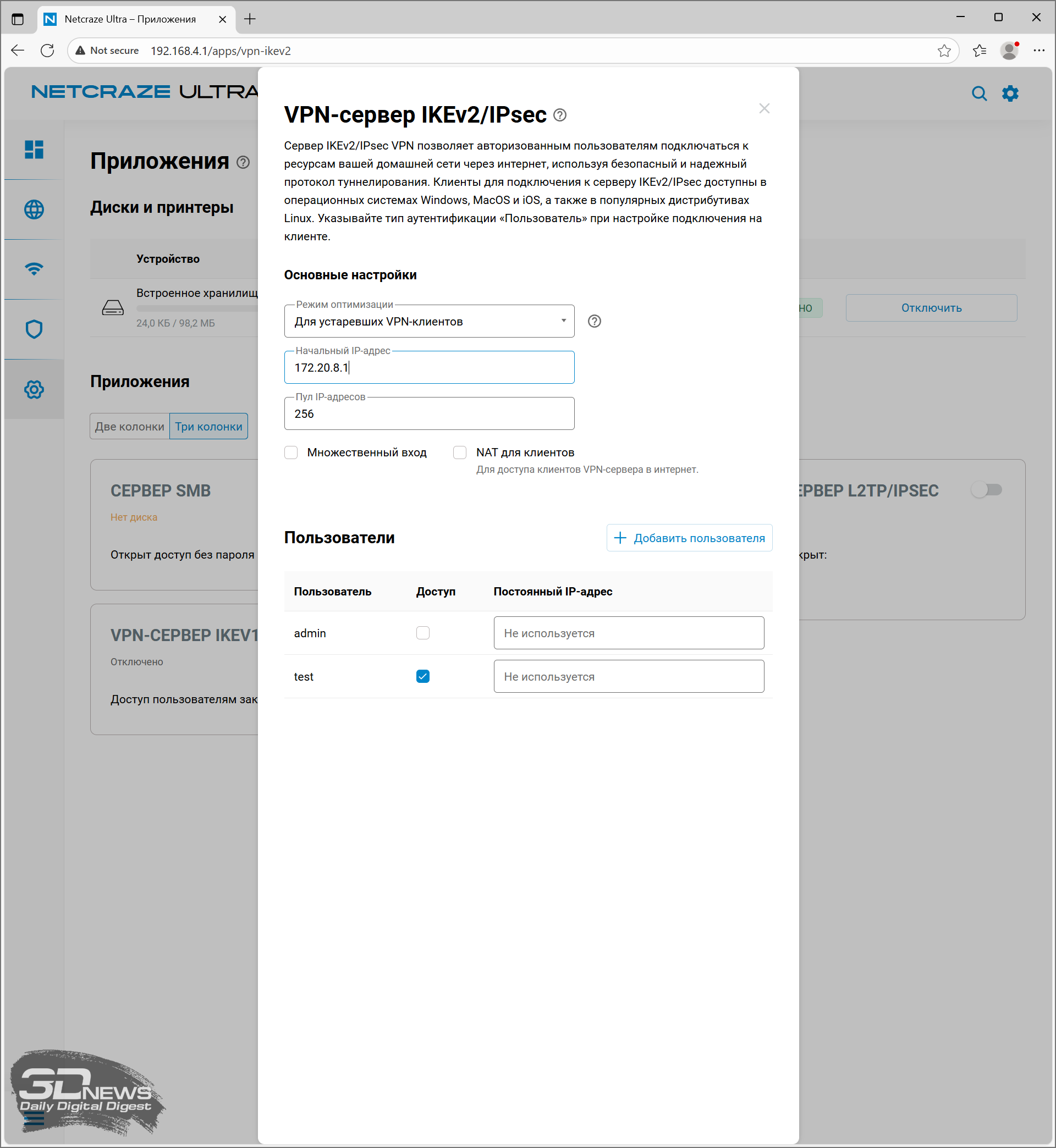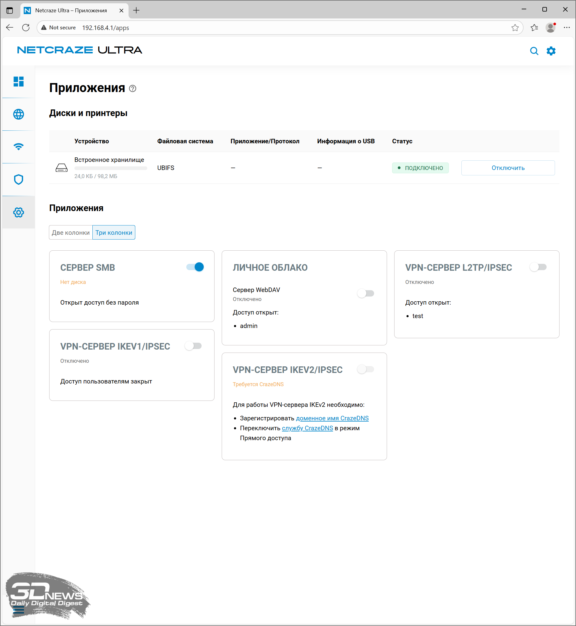 ⇡#Результаты тестирования: файловый серверДля тестирования файловых серверов мы подключили к маршрутизатору NVMe-накопитель Corsair MP600 через адаптер на чипе JMicron JMS583 с поддержкой USB 3.2 Gen 2 (USB 3.1). Измерение скорости передачи данных по протоколу SMB выполнено с помощью утилиты fio на системе Ubuntu 25.04. Порт USB 3.2 Gen 1 у Netcraze Ultra рассчитан на скорость вплоть до 5 Гбит/с, а актуальная версия прошивки поддерживает протокол UAS (USB Attached SCSI) для доступа к внешним накопителям — пока в качестве экспериментальной функции, которую нужно включить через командную строку (и это неспроста, судя по сообщениям об ошибках в системном журнале). Кроме того, действует кеширование данных в оперативной памяти как на запись, так и на чтение. В других обзорах коллеги продемонстрировали, что Netcraze Ultra способен выдать с сетевой «шары» вплоть до 1 Гбайт/с за счет кеширования, но только при удачном выборе накопителя. Хотя считается, что контроллеры JMicron дружат с embedded-системами, мы не добились лучших результатов, чем 350 Мбайт/с в тесте линейного чтения с SMB-сервера и 400 Мбайт/с линейной записи. Любопытно, что скорость оказалась выше при использовании файловой системы NTFS, чем в случае с EXT4. Графики fio не выявили и временной динамики, которая могла бы указывать на работу кеширования (за исключением, пожалуй, произвольного чтения с очередью команд 4 или 32). Для очистки совести мы подключили тот же накопитель к компьютеру с десктопным Linux и увидели скорость линейного доступа около 1 Гбайт/с. В то же время одноплатный компьютер Banana Pi BPI-R4 на платформе MediaTek Filogic 880 под управлением чистой OpenWrt (а NDMS основана на OpenWrt) уперся в числа меньше 300 Мбайт/с при прямом чтении и записи с накопителя (без SMB). Похоже, мы столкнулись с точечным конфликтом USB-адаптера и SoC компании MediaTek, от чего не застрахованы и потенциальные владельцы Netcraze Ultra. Из других протоколов обмена файлами, помимо SMB, NDMS поддерживает (S)FTP, AFP для совместимости со старыми macOS, а также WebDAV. По нашим замерам, WebDAV работает с примерно такой же скоростью, как SMB, и способен многое выиграть от смены USB-накопителя на более подходящую модель. ⇡#ВыводыПоддержка Wi-Fi 7 — это визитная карточка Netcraze Ultra, но в действительности лишь дань прогрессу. Вне диапазона 6 ГГц новый стандарт ничем не лучше народного Wi-Fi 6, а функция MLO оказалось бесполезной, когда объединяются точки доступа 2,4 и 5 ГГц. Добавьте к этому фрагментацию функций, региональные ограничения и сырое ПО клиентских адаптеров (в этом отношении все так же плохо, как год тому назад). Впрочем, пусть от Wi-Fi 7 сейчас немного пользы, у Netcraze Ultra есть масса более важных достоинств, начиная с мультигигабитных «медных» портов — сразу и 2.5, и 10GbE. Радиочасть обеспечивает честную скорость вплоть до 2 Гбит/с одиночным клиентам, а формула MIMO 4×4:4 позволяет сформировать мощный бэкхол меш-сети. Производительности SoC за глаза хватит для обслуживания туннелей и базовых функций сервера, так что это хорошее решение и для малого бизнеса. Наконец, в очередной раз похвалим операционную систему с ее частыми обновлениями, богатством функций и поддержкой репозитория Entware для установки пакетов OpenWrt. Реклама | ООО «Неткрейз» ИНН 7728374879 erid: F7NfYUJCUneTTx4SQMxk