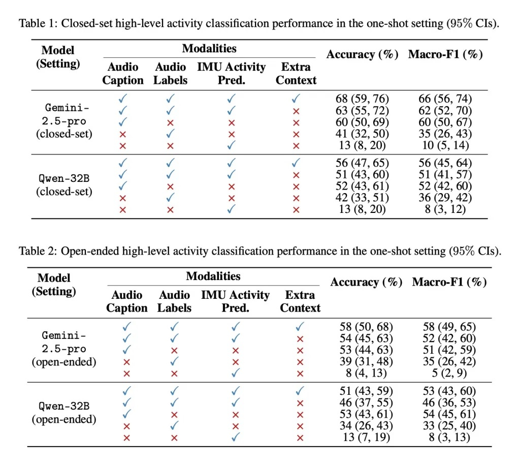 Исследователи обработали звуковые данные и данные о движении с помощью небольших ИИ-моделей, которые генерировали текстовые описания и прогнозы касательно категории активности, после чего данные передавались в разные LLM (Gemini-2.5-pro и Qwen-32B), чтобы оценить, насколько хорошо они могут идентифицировать активность. Затем Apple сравнила производительность этих двух ИИ-моделей в разных ситуациях: в одной из них предоставлялся список из 12 возможных активностей (закрытый набор), а в другой не было никаких вариантов (открытый набор). Для каждого теста предоставлялись разные комбинации текстовых расшифровок аудио, аудиометок, прогнозов по активностям, а также дополнительный контекст.