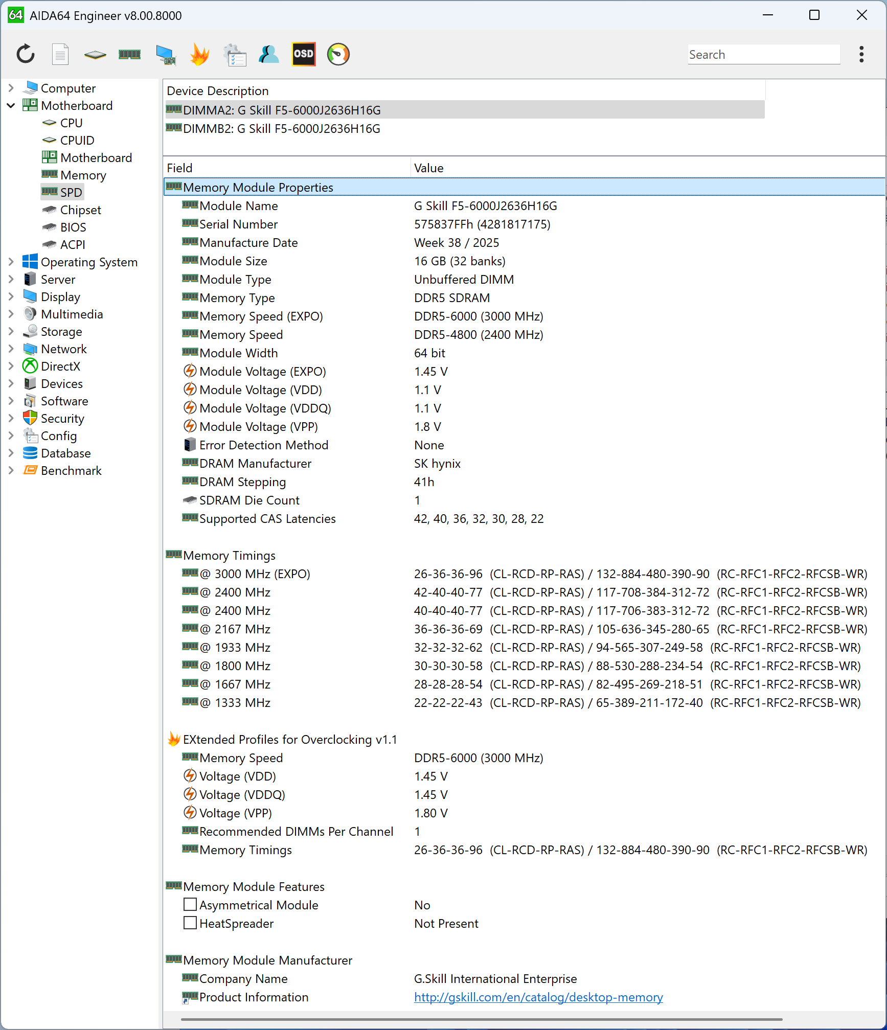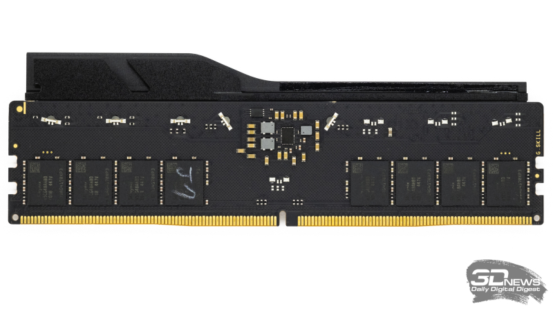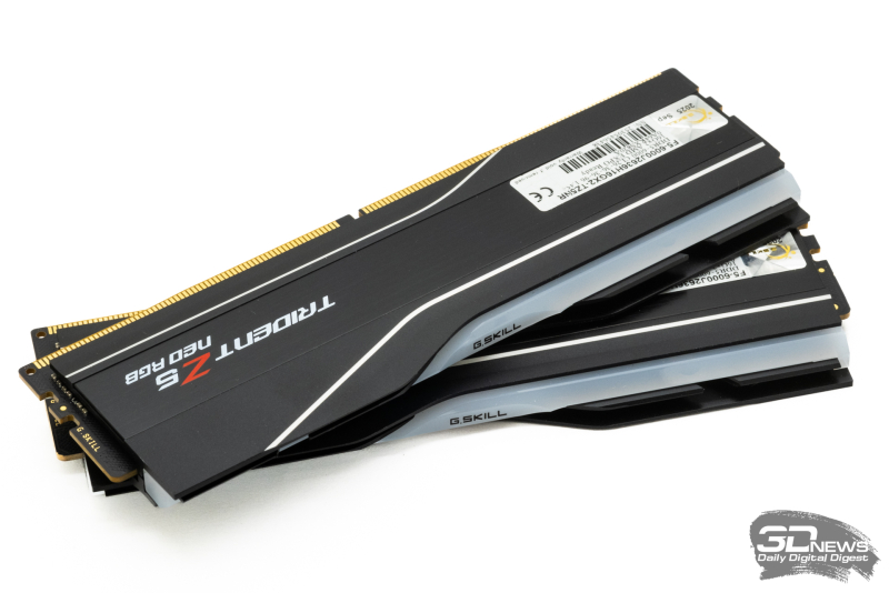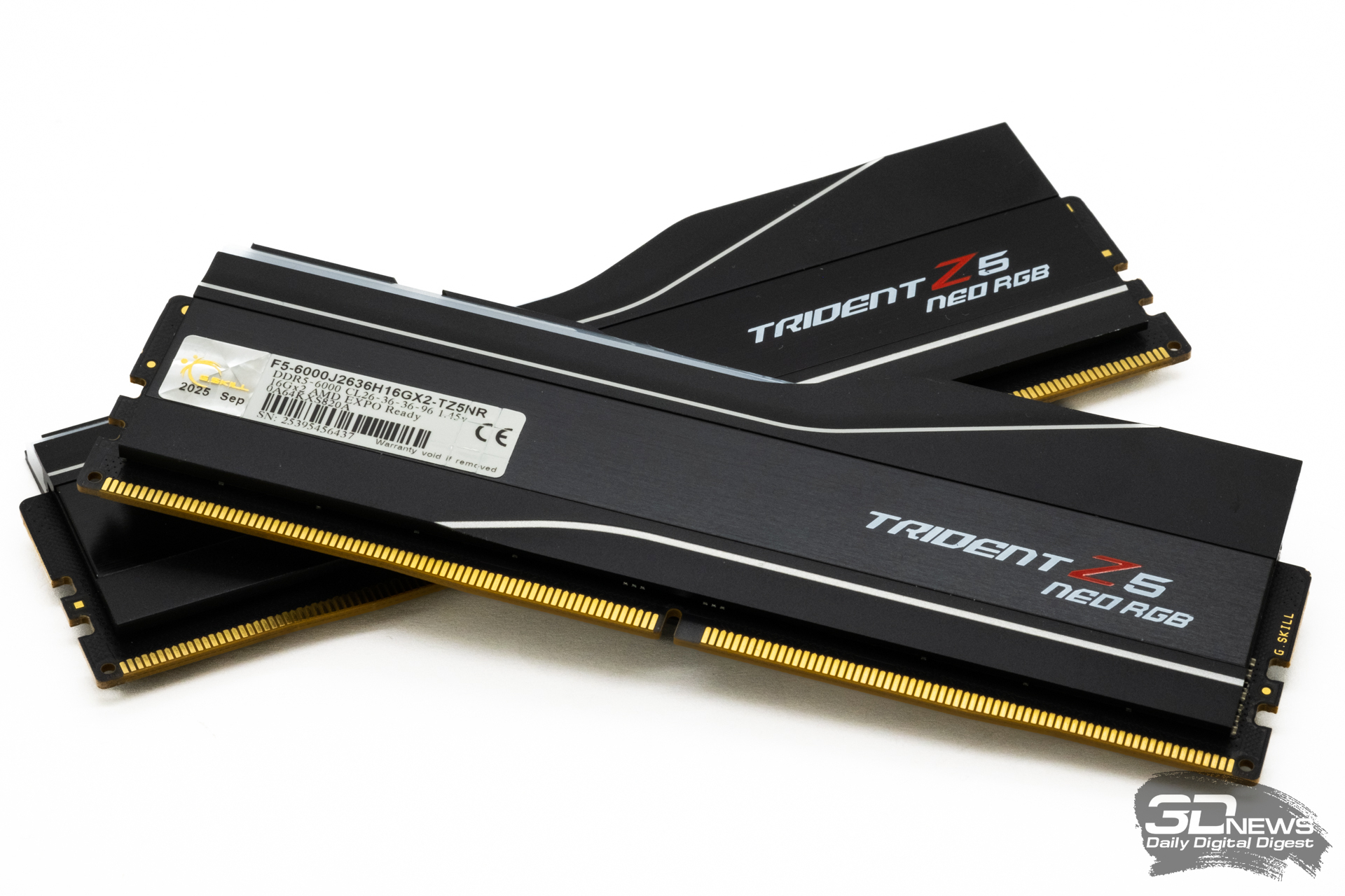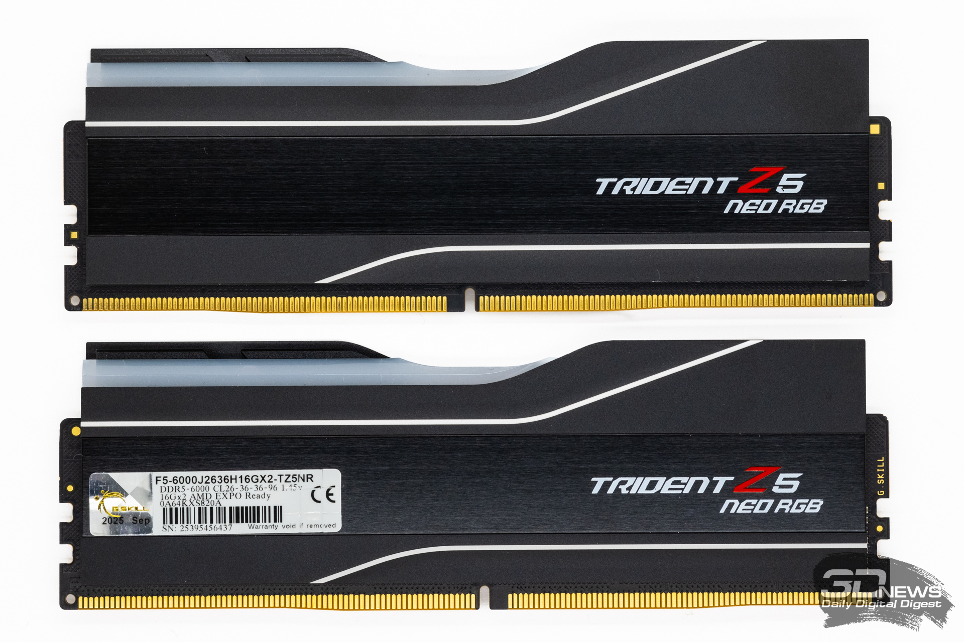 Вне зависимости от того, о каком варианте DDR5-6000 CL26 идёт речь, главный секрет таких модулей кроется в их элементной базе. Увидеть его можно, сняв один из радиаторов, которые держатся на двухстороннем теплопроводящем скотче. Модули рассматриваемого комплекта основываются на 16-Гбит чипах SK hynix A-die. Поскольку ёмкость модуля составляет 16 Гбайт, в каждой планке используется восемь таких чипов, и все они размещаются на одной стороне печатной платы, то есть модули — одноранговые. Рядом с чипами можно увидеть пять светодиодов, отвечающих за RGB-подсветку (ещё пять распаяно на другой стороне платы), а также схему питания с микросхемой PMIC производства Richtek. В целом внутренности этих модулей очень похожи на внутренности любой другой DDR5 SDRAM производства G.Skill на чипах SK hynix и по набору компонентов, и по дизайну 10-слойной печатной платы. Однако есть одна малозаметная, но весьма характерная деталь. Маркировка установленных в данном случае чипов A-die выглядит как H5CG48AHBDX018, в то время как в похожей памяти, попадавшей нам на тесты ранее, чипы имели маркировку H5CG48AGBDX018. Это значит, что для модулей DDR5-6000 с низкой латентностью используются не просто специально отобранные чипы, а чипы более новой модификации (4.1, как её определяют некоторые диагностические утилиты). Причём набор символов HBD и GBD в середине маркировки описывает изначальную целевую скорость этих чипов. И если встречавшиеся ранее чипы GBD ранжировались SK Hynix как DDR5-5600, то чипы HBD, очевидно, считаются более скоростными компонентами класса DDR5-6400. Получается, что в составе комплекта Trident Z5 Neo RGB DDR5-6000 CL26 32GB они работают даже на чуть сниженной частоте — всё ради агрессивных задержек. Штатные спецификации предполагают, что комплект Trident Z5 Neo RGB DDR5-6000 CL26 32GB рассчитан на тайминги 26-36-36-96 при напряжении 1,45 В. Именно такой вариант режима DDR5-6000 и зашит в профиле Expo. Стоит заметить, что модули требуют довольно высокого напряжения 1,45 В — обычно такое напряжение свойственно высокочастотным комплектам DDR5. Но достижение низкой латентности тоже требует определённых усилий. Тем не менее напомним, что первые партии комплектов Trident Z5 Neo RGB DDR5-6000 CL26 32GB выпускались с номинальным напряжением 1,4 В, а повышено оно было некоторое время спустя, очевидно, для увеличения доли подходящих для такой памяти чипов. Никаких других профилей, кроме DDR5-6000 26-36-36-96, у рассматриваемой памяти нет. Поддержка Intel XMP тоже не предусмотрена. Это значит, что, хотя в системах с процессором Intel эта память работать тоже будет, тайминги придётся конфигурировать вручную. Остаётся только добавить, что G.Skill довольно ответственно подходит к тестированию своих модулей памяти на совместимость с различными системами и по каждому комплекту ведёт обширные списки совместимых материнских плат. Такой список есть и для Trident Z5 Neo RGB DDR5-6000 CL26 32GB, правда, в него входят исключительно платы под Ryzen. Впрочем, поскольку поддержка DDR5-6000 не требует ничего особенного, список этот очень обширный и включает почти все существующие Socket AM5-материнские платы на чипсете X870E/X870 и не только их. Главное, что нужно иметь в виду: плата для таких модулей должна поддерживать возможность увеличения напряжений Mem VDD и Mem VDDQ до 1,45 В. ⇡#Особенности работы G.Skill Trident Z5 Neo RGB DDR5-6000 CL26 32GB При установке комплекта G.Skill Trident Z5 Neo RGB DDR5-6000 CL26 32GB в материнскую плату и активации имеющегося профиля Expo настройки подсистемы