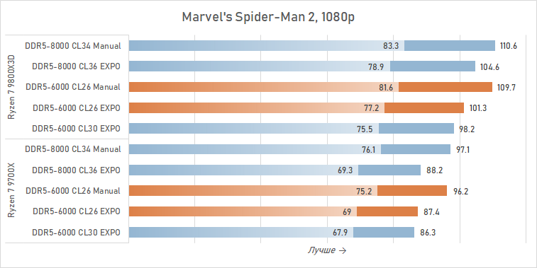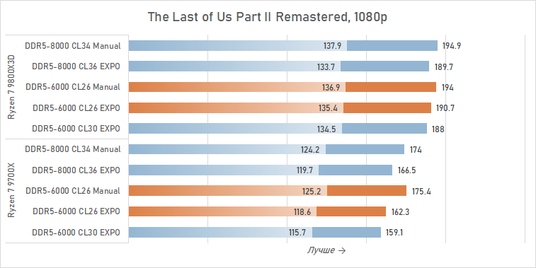 ![]() Нейросети: ![]() Игры относятся к категории задач, зависимость производительности от пропускной способности и задержек системы памяти в которых выражена наиболее явно. Поэтому оверклокерские модули памяти востребованы прежде всего геймерами. И тесты это вполне подтверждают. Более того, по их результатам также хорошо видно, что быстрая память действительно важнее для процессора без 3D-кеша, в то время как в системе на базе Ryzen 7 9800X3D обеспечиваемый ею прирост оказывается примерно вдвое меньше. Впрочем, говорить о том, что для систем с процессорами серии X3D быстрая память не нужна, всё-таки неправильно. Например, разница в игровой производительности системы со стандартной DDR5-6000 CL30 и новыми низколатентными модулями DDR5-6000 CL26 при настройках по умолчанию составляет порядка 2 % в случае Ryzen 7 9700X и 1 % — в случае Ryzen 7 9800X3D. Но ситуация сильно меняется при использовании оптимизированных задержек, подобранных вручную. В этом случае среднее преимущество, обеспечиваемое DDR5-6000 CL26, достигает 12-13 % в системе на базе Ryzen 7 9700X и 5-6 % — в системе на Ryzen 7 9800X3D. Это – довольно ощутимая прибавка к частоте кадров в обоих случаях. ![]() Что же касается ответа на вопрос, может ли DDR5-6000 CL26 заменить высокочастотную память DDR5-8000, то он скорее положительный, но с оговорками. С одной стороны, если сравнивать результаты комплектов G.Skill Trident Z5 Neo RGB DDR5-6000 CL26 и KingBank Soarblade RGB DDR5-8000 с таймингами из профилей Expo, то система, оснащённая DDR5-8000, предлагает примерно на 1,5-2,5 % более высокий средний FPS (верхняя граница этого интервала относится к Ryzen 7 9700X, нижняя — к Ryzen 7 9800X3D). Но с другой — если сравнить результаты, получающиеся при ручной настройке соответствующих комплектов, то среднее отставание комплекта DDR5-6000 CL26 будет на уровне 0,3-1,0 %, то есть на уровне погрешности измерений, особенно в системе на процессоре с 3D-кешем. Результаты, полученные в отдельных играх, только подтверждают, что комплект G.Skill Trident Z5 Neo RGB DDR5-6000 CL26 в платформе Socket AM5 сравним по производительности с высокочастотным комплектом DDR5-8000, в особенности при тонкой ручной настройке. Более того, в некоторых случаях с его помощью даже удаётся получить более высокую частоту кадров. А это значит, что появившиеся в продаже комплекты DDR5-6000 с низкой латентностью определённо заслуживают внимания. Не стоить забывать, что при почти такой же с DDR5-8000 производительности DDR5-6000 CL26 гораздо проще в обращении. Такие комплекты не накладывают повышенных требований на качество реализации слотов DIMM на материнской плате и гарантированно работают с любыми экземплярами процессоров.