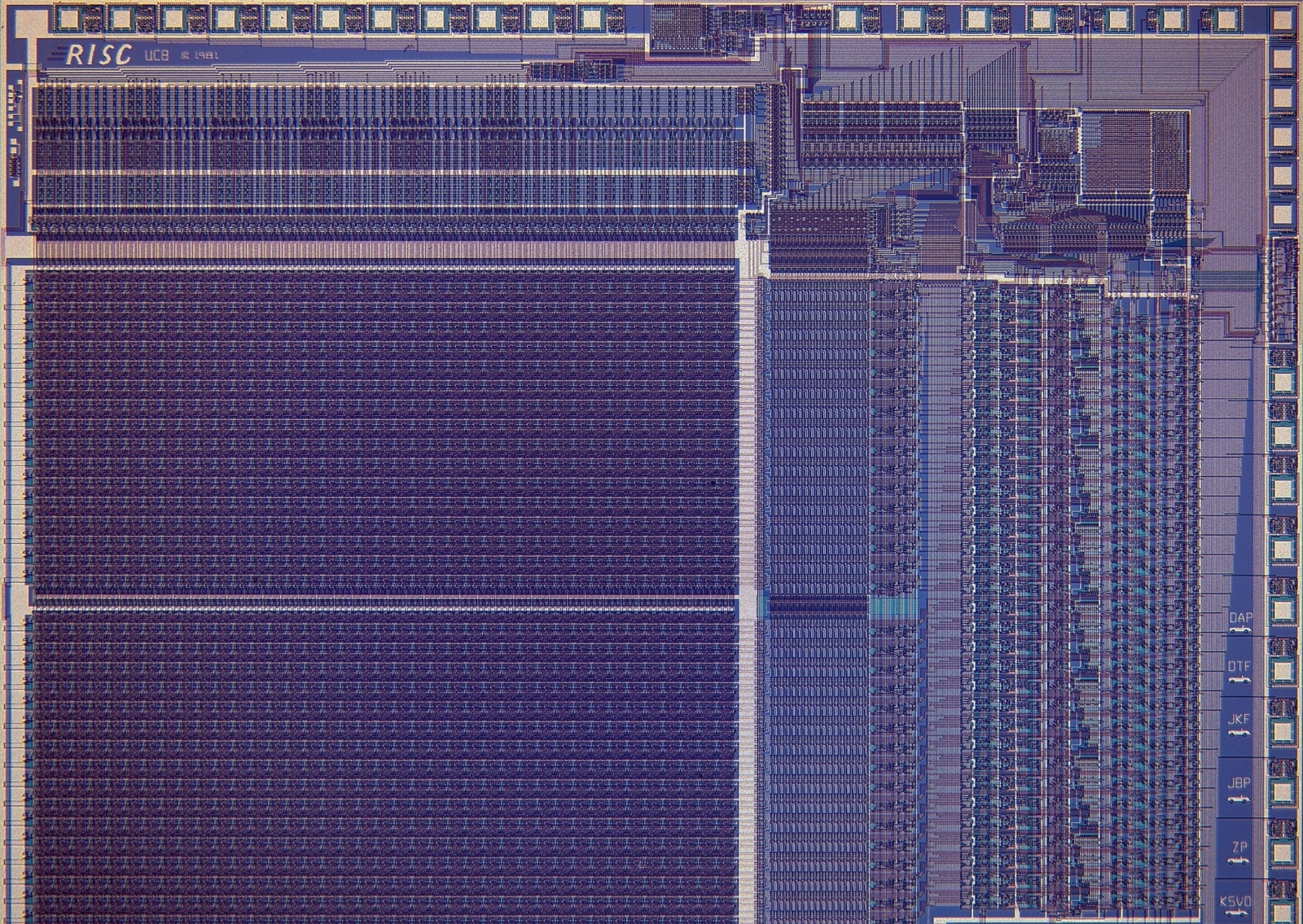 Поверхность процессора RISC I, изготовленного в 1981 г. по 2-мкм техпроцессу. Обширное двухчастное поле слева внизу — зона регистровой памяти, а все логические контуры уместились в существенно меньшей области в правом верхнем квадранте (источник: University of California, Berkeley)