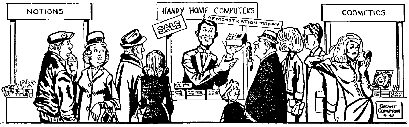 Провидческая, хотя и слегка ироничная, иллюстрация из оригинальной статьи Гордона Мура 1965 г.: художник, которому поручили изобразить миниатюрные «практичные домашние компьютеры» будущего, в целом верно предсказал габариты современных планшетов или смартфонов — за исключением разве что толщины корпуса и занимаемой экраном площади верхней (передней) панели; тут явно показаны устройства без тачскринов, с кнопочным управлением (источник: IEEE)