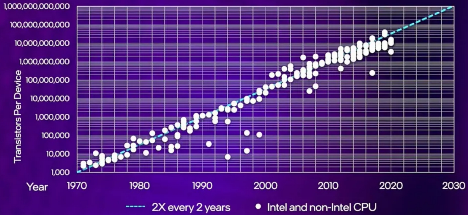 В формулировке «типичный новый процессор содержит вдвое больше транзисторов, чем его средний же двухлетней давности предшественник» эмпирический «закон Мура» продержался до начала 2025 г. — во многом благодаря усилиям DARPA (источник: Medium)