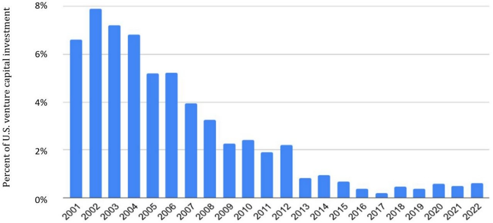 Доля венчурных капитальных инвестиций в стартапы, так или иначе связанные с полупроводниковыми производствами, в США начиная с 2013 г. не превышает 1% — что не на шутку обеспокоило ряд представителей американской администрации, представивших в 2022 г. президенту доклад под названием Revitalizing the U.S. Semiconductor Ecosystem: ведь, напоминают они, в своё время и Intel, и AMD, и Qualcomm, и Nvidia, и Broadcom — все были стартапами (источник: Pear Ventures)