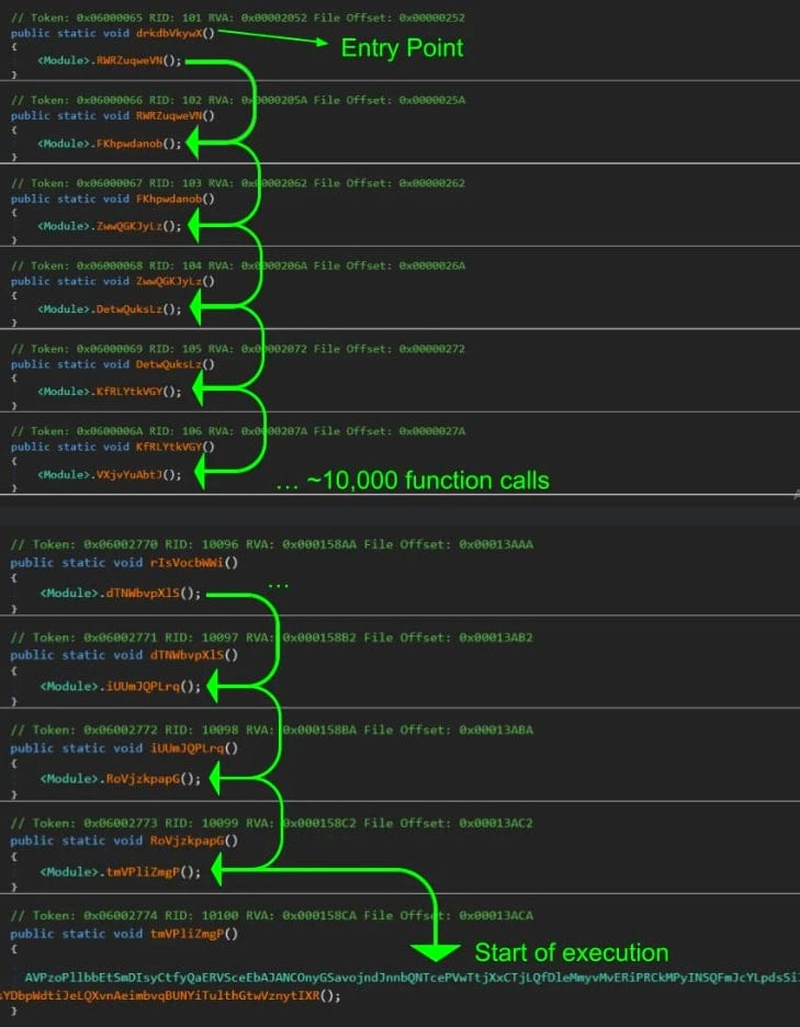 Исследователи Huntress отметили, что злоумышленники для дополнительной защиты своего кода использовали тактику динамического уклонения, обычно называемую ctrampoline, при которой функция точки входа перед выполнением кода производит 10 000 вызовов пустых функций.